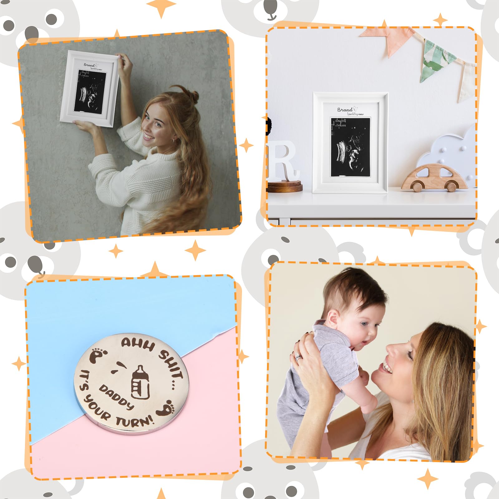 Sonogram Frame and Creative Decision Coin: every sonogram picture frame is made with high clarity glass display covers encased in quality, measuring 8.3 x 6.3 inch; Creative decision coin is made of solid stainless steel, not easy to get rust or fade, one side is mommy, the other side is daddy, which can make it easier for them to make decisions when facing new challenges in life