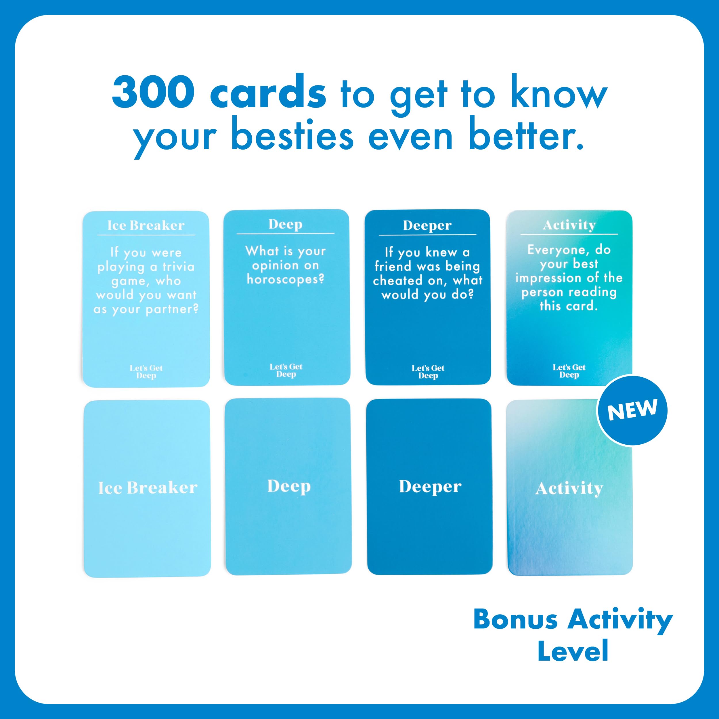 What's Inside: Get to know your besties even better. Let's Get Deep: Friends Edition includes 400 cards (50 Ice Breaker, 150 Deep, and 200 Deeper questions) plus instructions for your game night games.