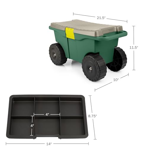 Keep all your gardening tools right where you need them with the Garden Cart with Seat and Wheels by Pure Garden. The spacious interior and removable tool tray are ideal for keeping all your garden supplies in one convenient place. The lid is a sturdy bench seat that alleviates the need for bending or stooping, making low to the ground tasks much easier. The built-in handles make it easy to transport plants, flowers, mulch, tools and more. With four 6-inch-diameter plastic wheels that can navigate through tall grass, over rocks, and around the yard, this garden scooter is ideal for both kids and adults with green thumbs. IMPORTANT: Pure Garden is committed to providing the consumer with the absolute best price and value on all of our products. NOTE: This is an exclusive product of Pure Garden and ONLY Garden Carts and Wagons by Pure Garden are GUARANTEED to be genuine. Avoid buying counterfeit products and transacting with unauthorized sellers. Pure Garden is a registered trademark protected by U.S. Trademark law and will be vigorously defended.