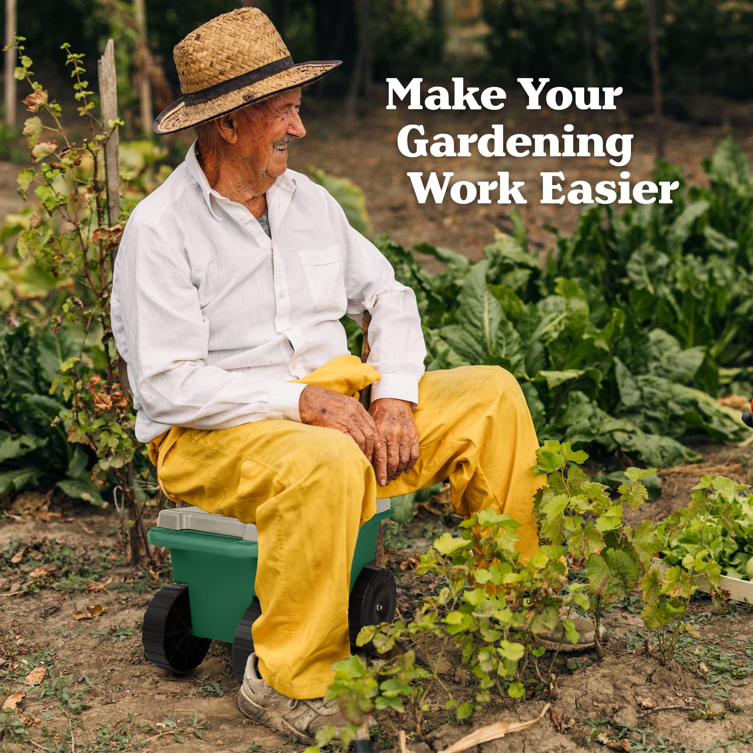 ROLLING GARDEN CART WITH SEAT - This garden stool is ideal for anyone eager to ease back and knee pain when planting and weeding, as its lid offers a sturdy seat that makes low-to-the-ground tasks much easier, with less need for crouching and stooping.