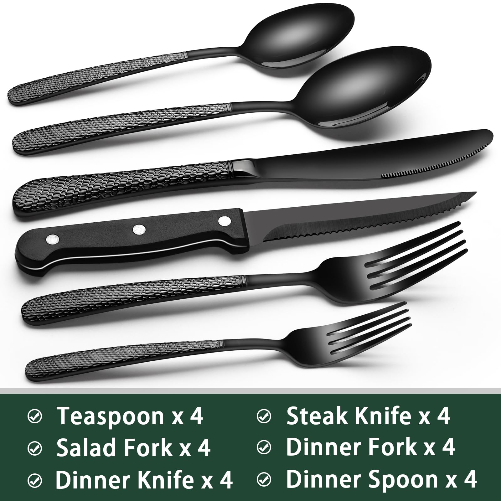 PREMIUM 24-PIECE BLACK SILVERWARE SET FOR 4: This flatware set contains 4 dinner forks, 4 salad forks, 4 dinner spoons, 4 dessert spoons, 4 dinner knives and 4 steak knives. It’s the ideal set for home daily use, and also for restaurants, pubs, cafes, and hotels. This cutlery set also help your dinner full of design while having a party.