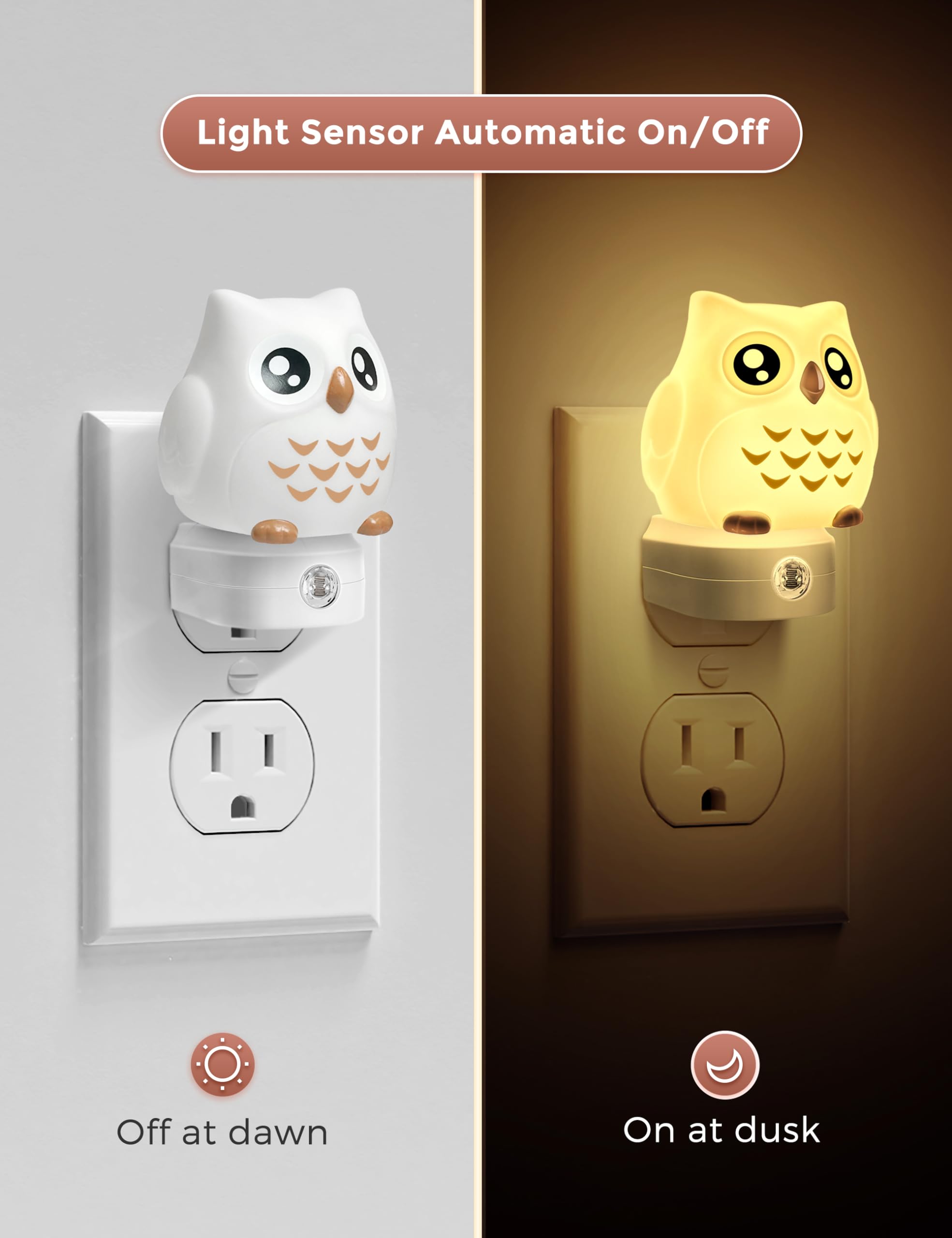 [Dusk to Dawn Night Light]: Equipped with smart light sensors, the color changing night light automatically turns on at dusk and off at dawn, saving energy. Please do not put two night lights together, it will affect the light sensor function.