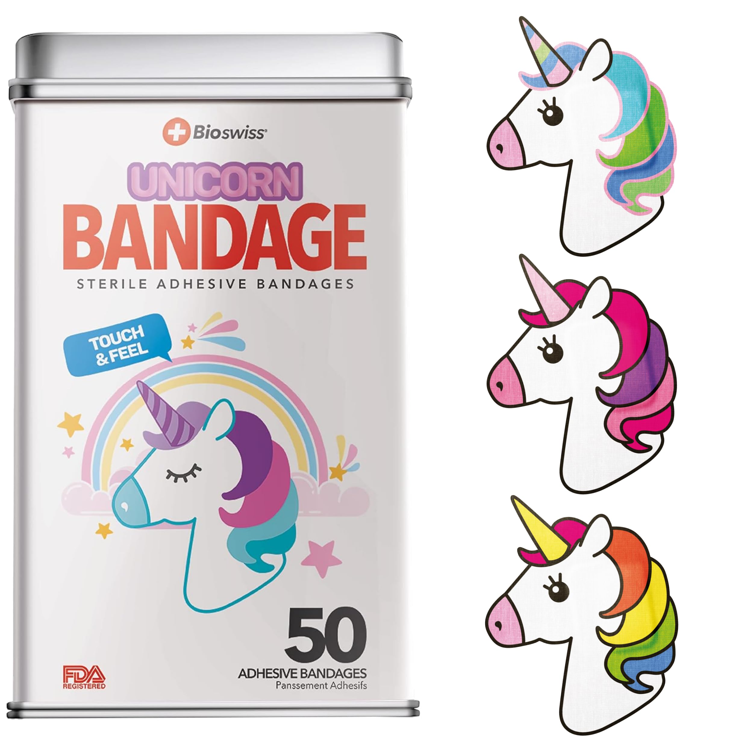 50 UNICORN BANDAGES: Unicorn-shaped adhesive bandages tin helps protect cuts, scrapes, and minor wounds while making healing less stressful; bandages come in 3 assorted styles