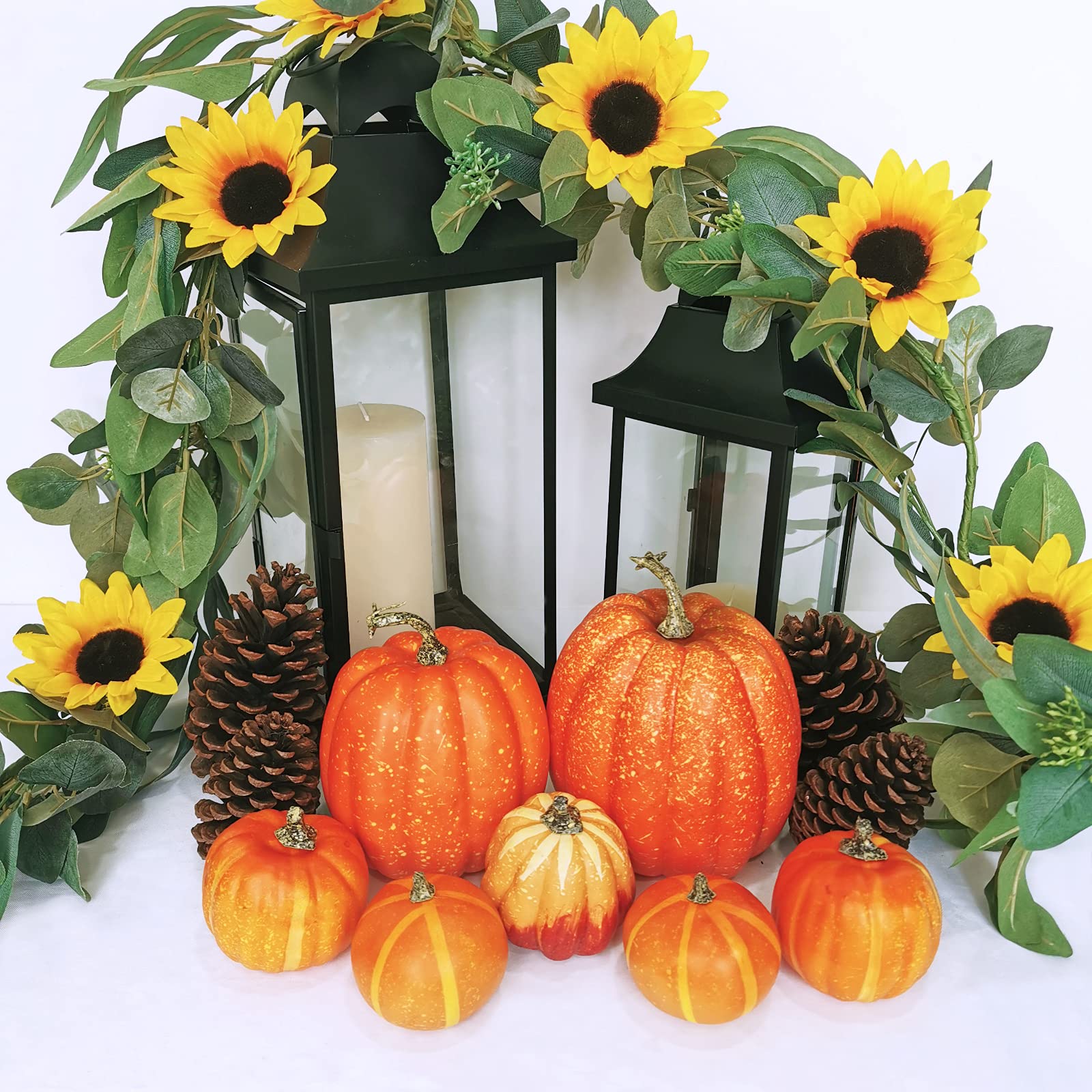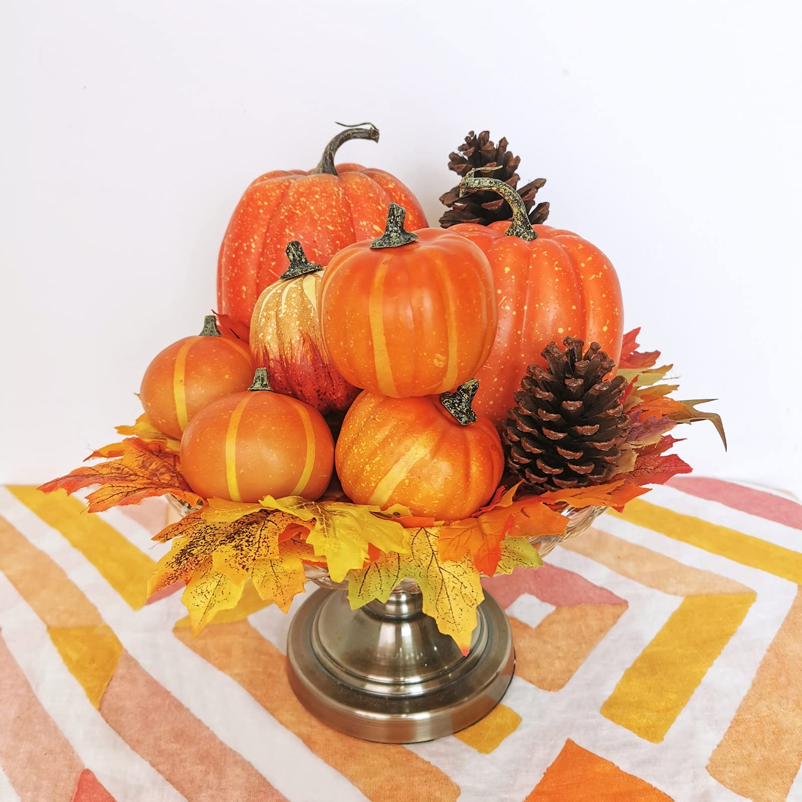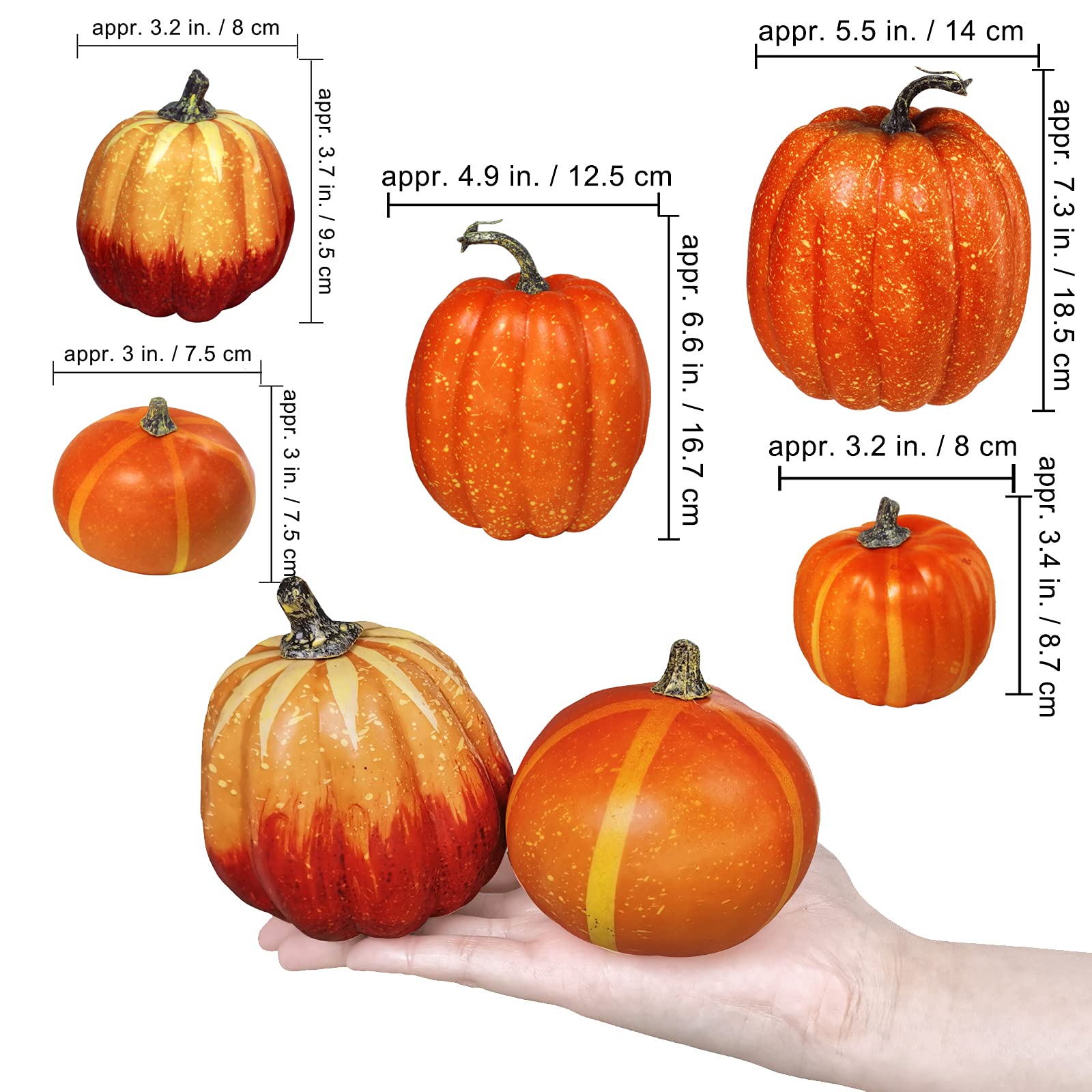 Quantity: Package includes 7 pcs Artificial Orange Pumpkins in assorted sizes. These pumpkins create an instant arrangement for display, or you can pair them with other seasonal decoration for your Harvest and Halloween decor.