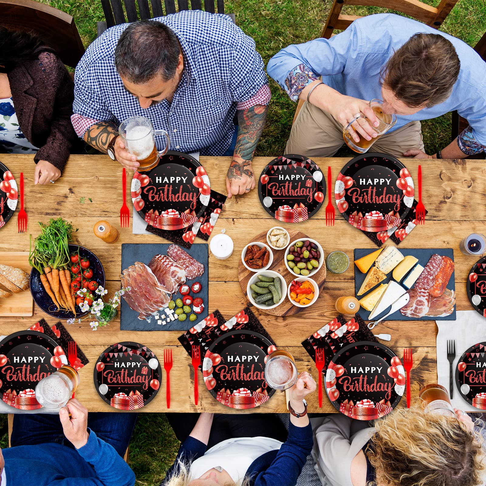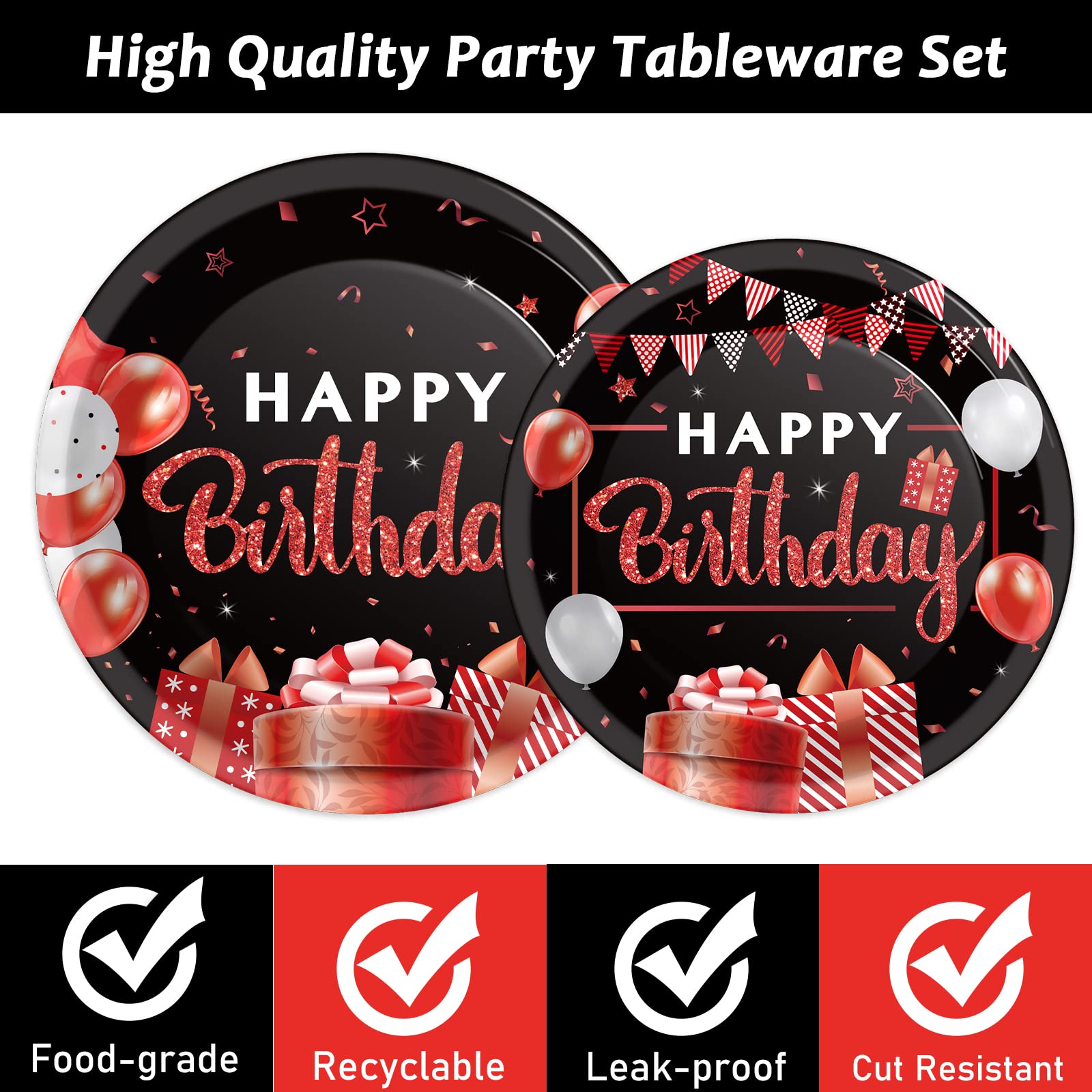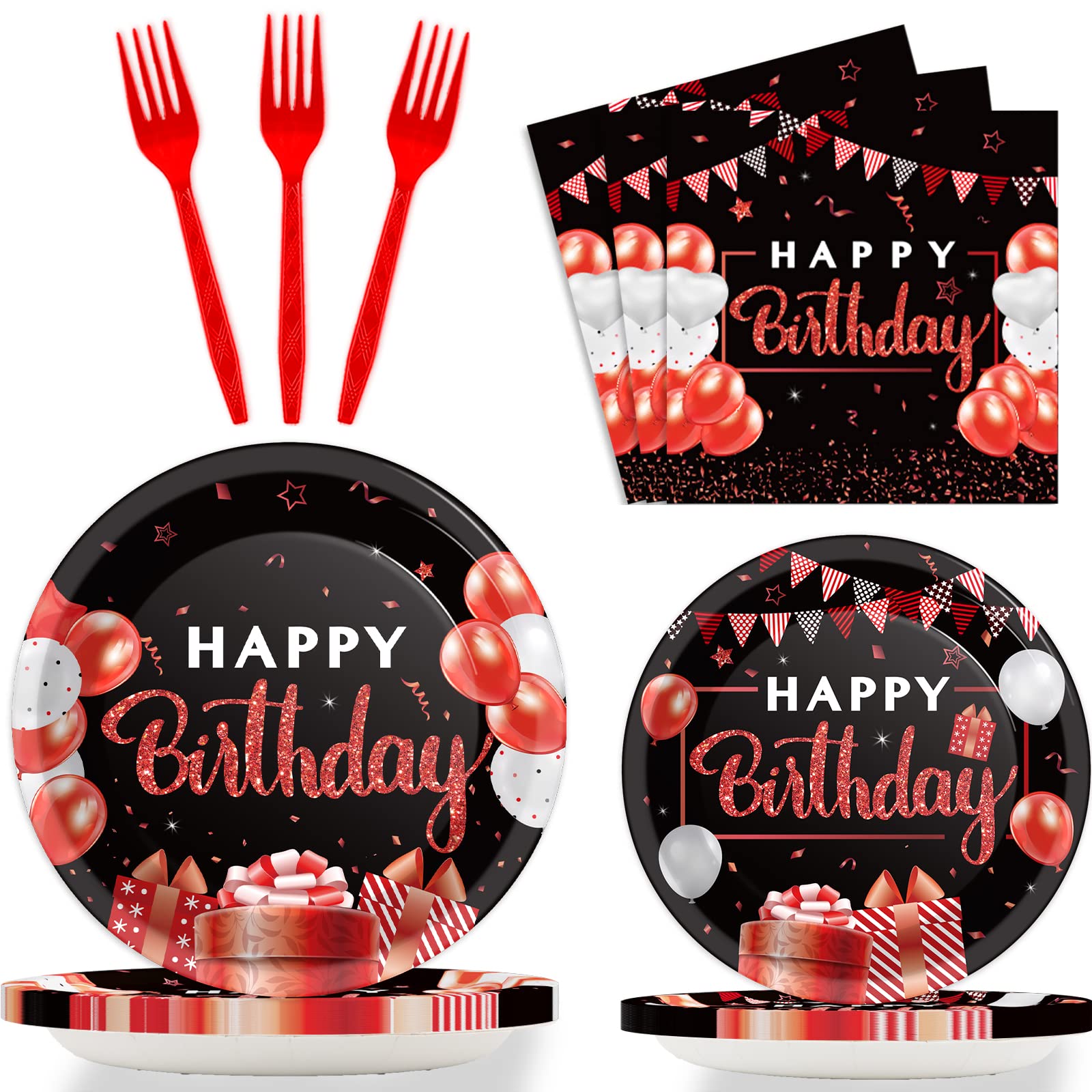 【Birthday Party Supplies】You will receive 24 pieces red and black happy birthday party paper dinner plates of 9’’, 24 pieces plates of 7’’, 24 pieces red birthday napkins of 6.5’’ and 24 plastic red forks for each set that can serve 24 guests.