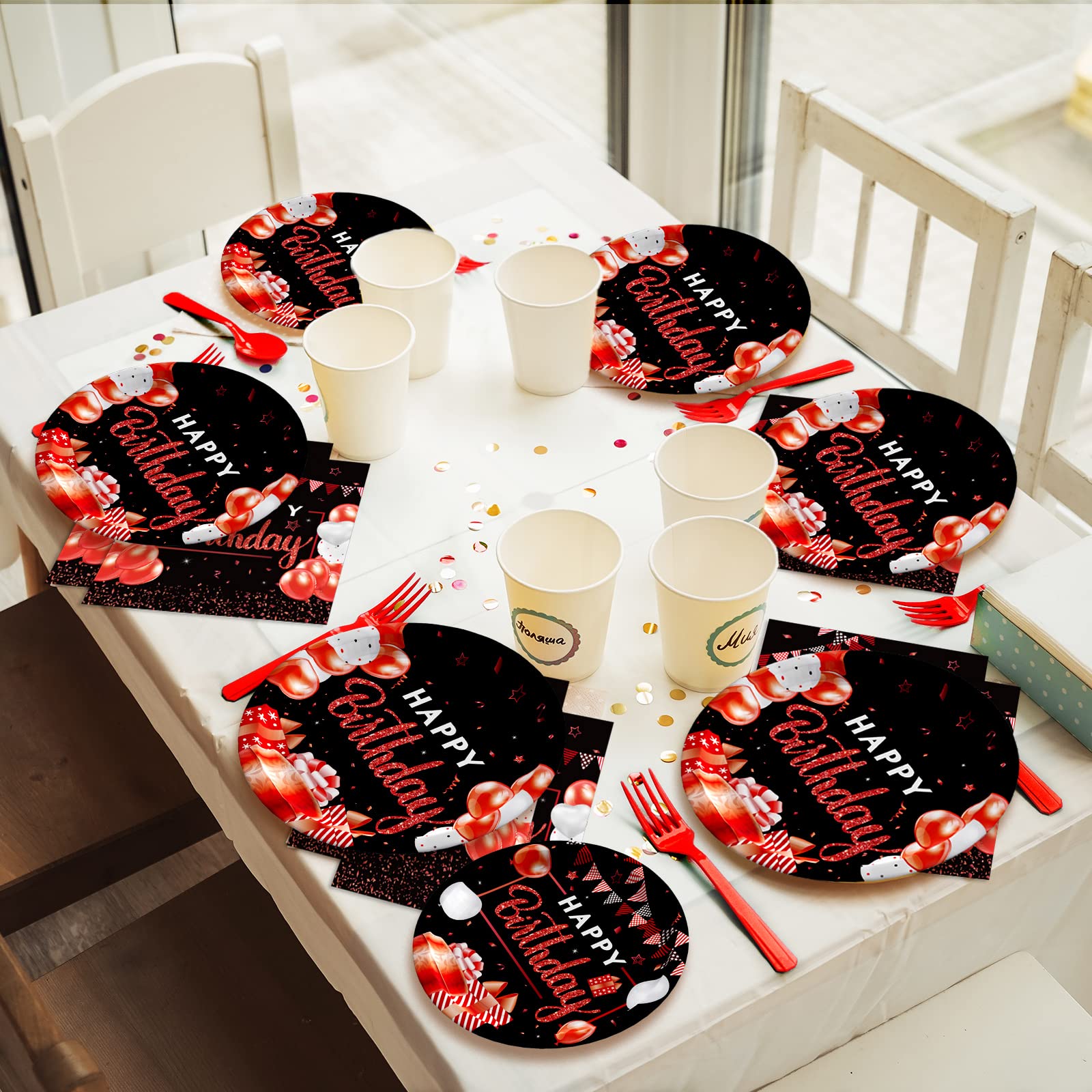 【Confetti Sprinkles Birthday Party Design】Except for the fork, this happy birthday theme party tableware set is all designed in while background and vibrant red patterns. Decorating your birthday party with these tableware kit can make your party full of the festival atmosphere.