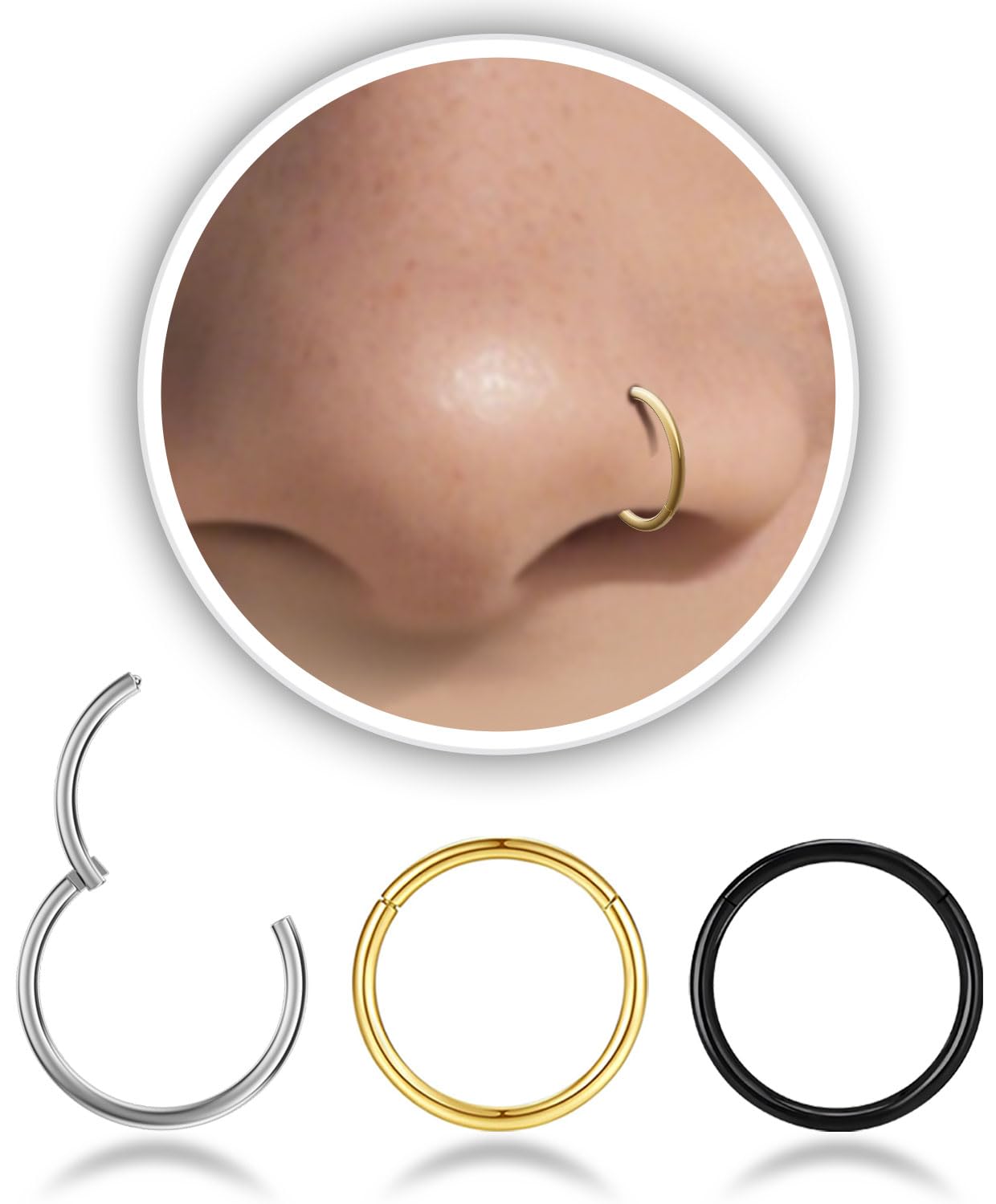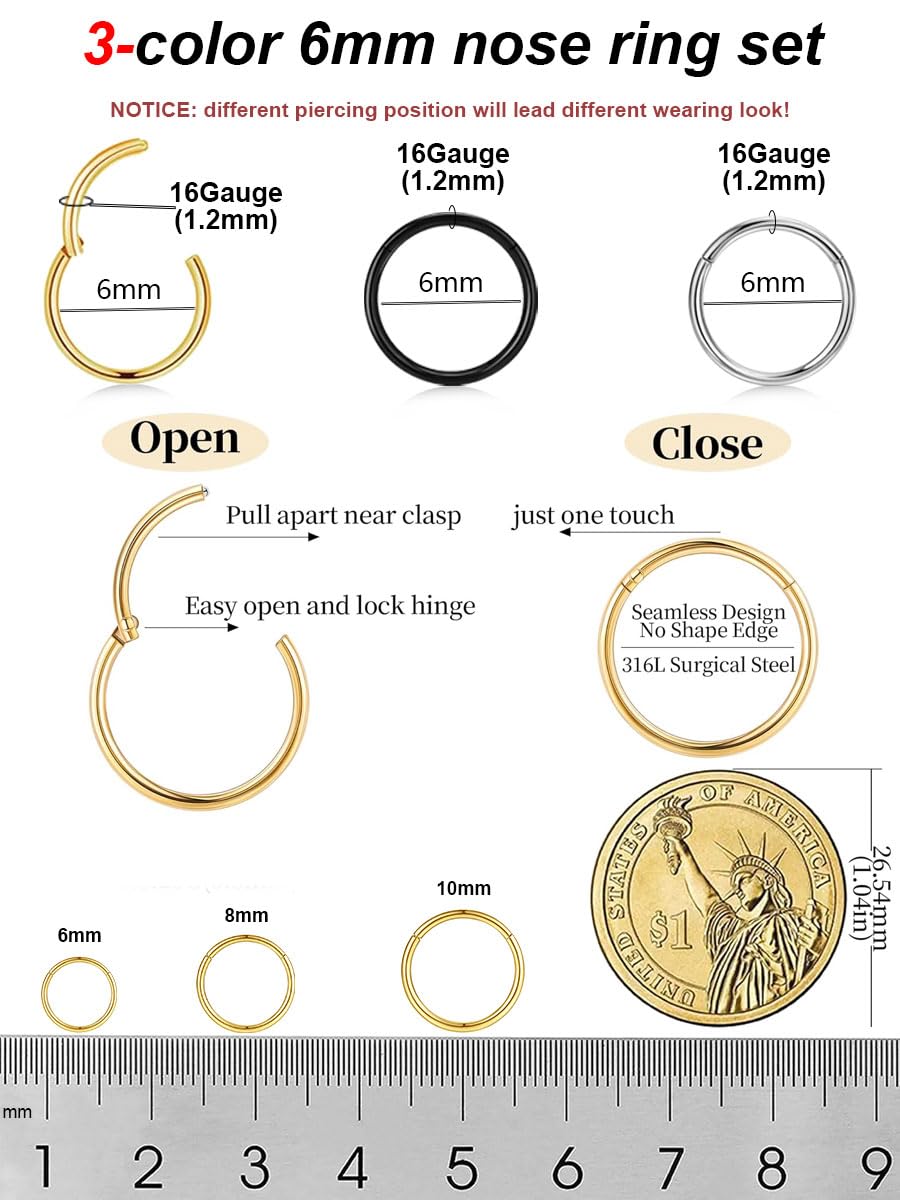 ✅ 3 Colors, One Set – Standard Fit:Includes 3 hinged nose rings in gold, silver, and black. Each hoop is 16 gauge (1.2mm) thick with a 6mm inner diameter—ideal for snug and subtle piercings.