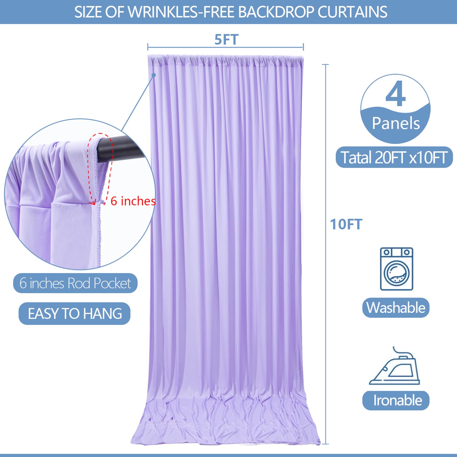 4 Panels Backdrop Curtains Package —— Your package includes 4 panels of soft lavender backdrop curtains, each measuring 5FT in width and 10FT in height. Together, they create a perfect 20FT x 10FT backdrop, providing ample room for various occasions. Please note: Not including the background stand