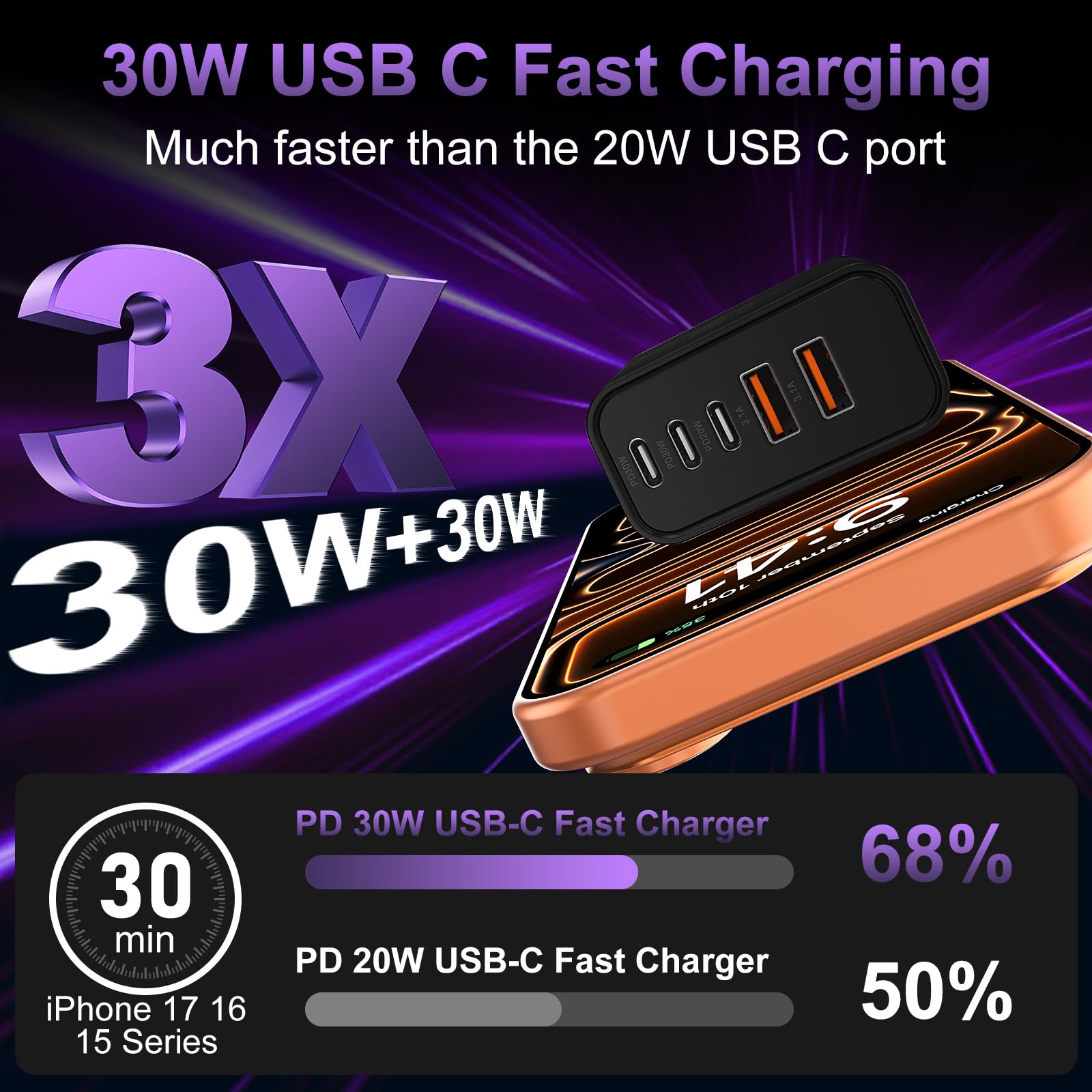 2-Pack 60W USB C Charger Fast Charging Blocks: Auorld 60W USB C Fast Charging Blocks support the Power Delivery and Quick Charge 3.0 fast charging functions with a total power of up to 60W. The USB-A port offers an output power of 3.1 A/5 V, while each USB-C port provides Max 30W output power, charge your Phone 16 15 Pro Max up to 65% in just 30mins, 10% faster than the original 20W USB C charger