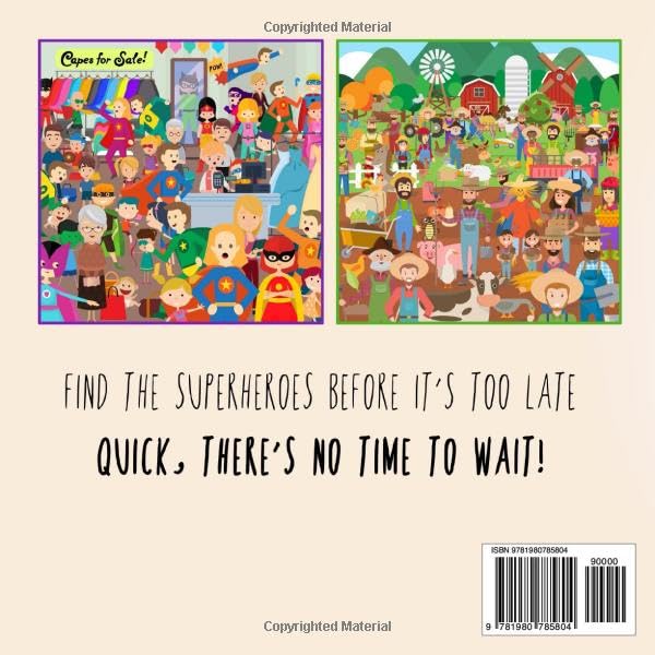15 superheroes are playing hide and seek. Where could they be, let's take a peek! In this fun, spot the superhero puzzle game, you'll travel through parks, shops, carnivals, airports, playgrounds, a sunny beach and many more locations in the search for some amazing and awesome superhumans. See if you can find Peter Power, Zoe Zoom and Zapper Zac - and don't forget Barry Burp along the way! A great book for 2-4 year olds. For the kids who like Where's Wally/Waldo books but find the puzzles a little tricky. This book is printed by Amazon using 60-pound smooth bright offset white paper. While many children's books are printed this way, some may be expecting a satin-style finish. Please take this into consideration before purchasing. Thank you.