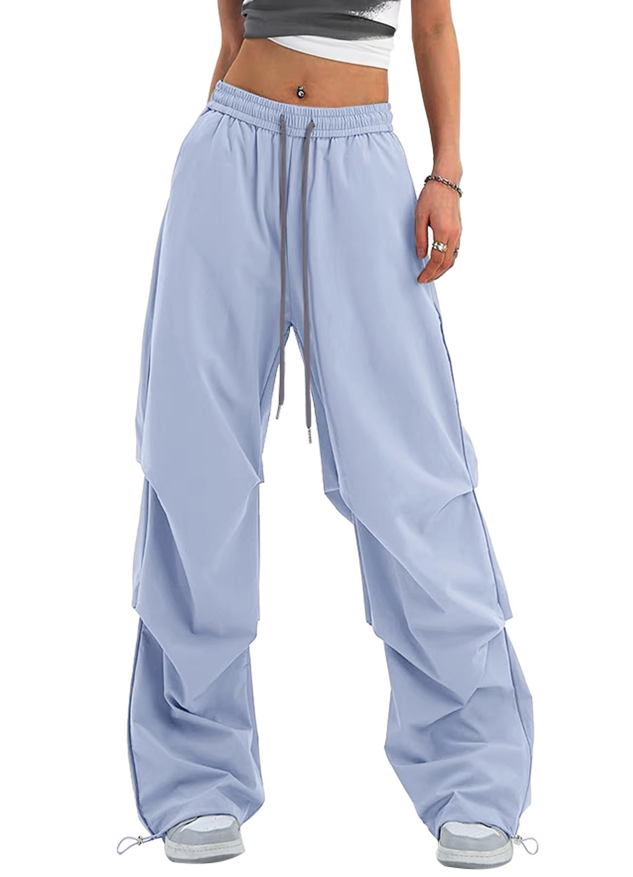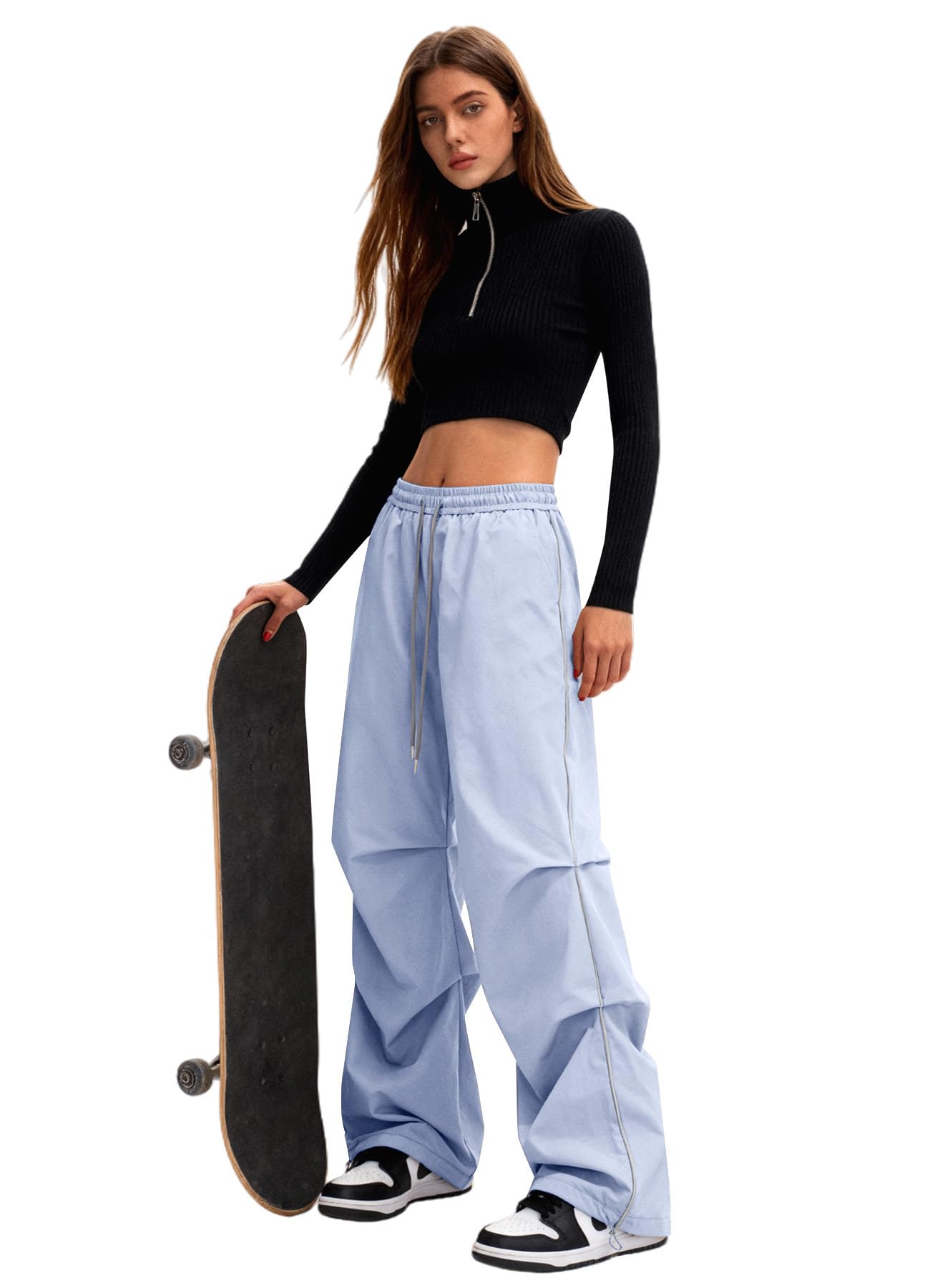High Waist Y2K Baggy Parachute Pants: Designed with a high waist and a Y2K-inspired baggy parachute silhouette, these wide leg pants create a balanced, relaxed fit that complements different body types and delivers a modern streetwear look.