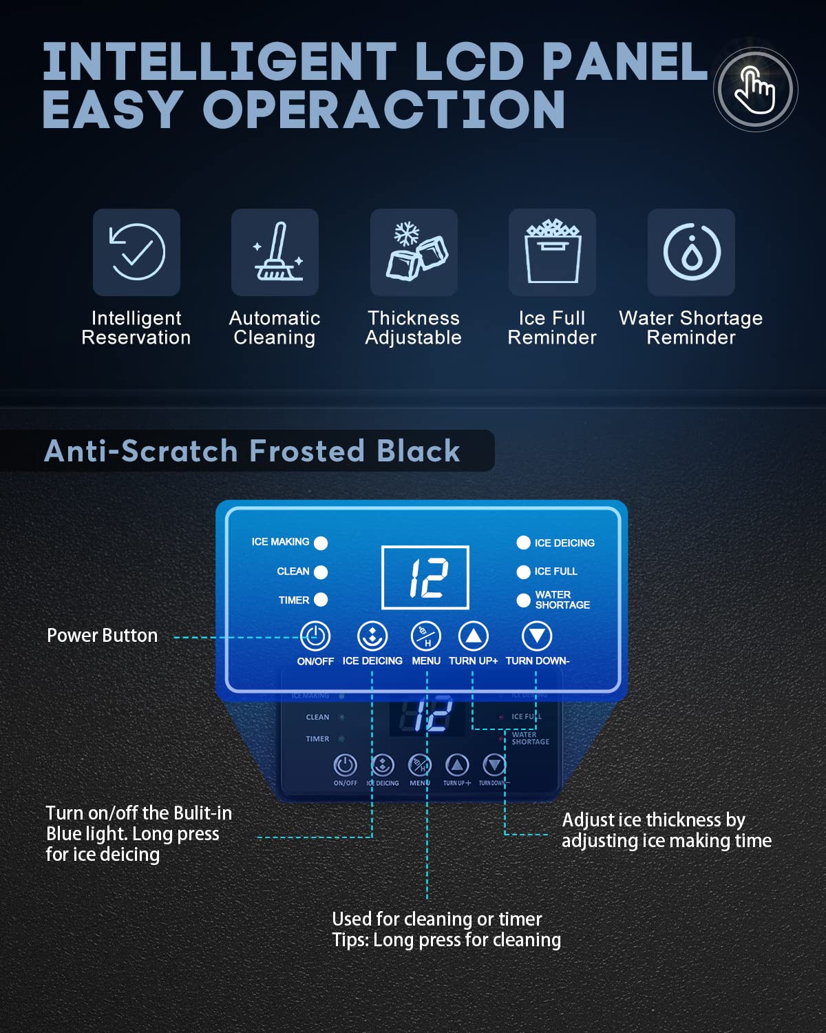 Intuitive LCD Control Panel:Easily manage all functions via the smart LCD panel, which includes a 24-hour reservation, automatic self-cleaning, de-icing, built-in blue light, and malfunction indicators. Adjust ice-making time with a simple press of the (+) or (-) buttons to customize ice size.