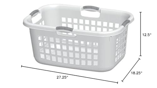 Laundry basket features heavy-duty construction including a thick reinforced rim and 4 reach-through handles. Smooth sidewalls create a no-snag inner surface and color accented inserts provide a comfortable grip for heavy loads. 2 bushel. Dimensions: 27-1/4 in. L. X 18-1/4 in. W. X 12-1/2 in. H. White with Titanium handles.