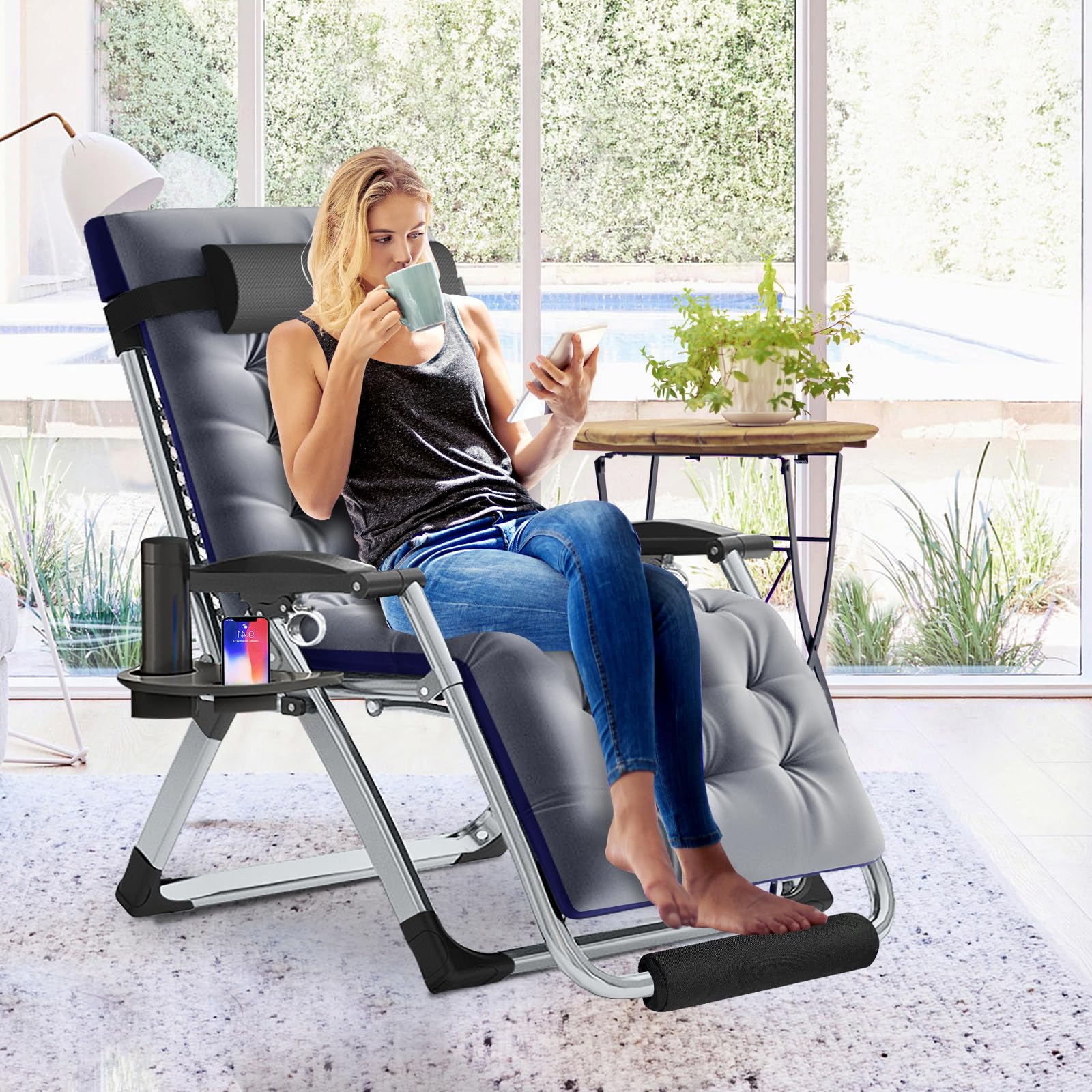Comfortable Design: The outdoor zero gravity lounge chair is designed to satisfy your ultimate comfort. The armrest of folding lounge chair is thick and contoured. It will serve you whether sitting or lying, outdoor and indoor. Our recliner chair comes with a thick and soft pad