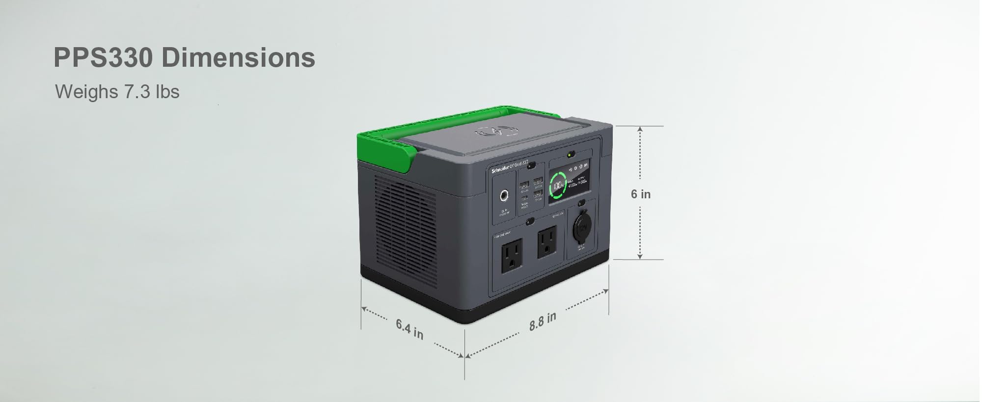 What you Get: (1) Schneider OffGrid 330 Portable Power Station, (1) AC charging cable, (1) DC charging cable, safety guide, quick start guide, 2 Year Warranty