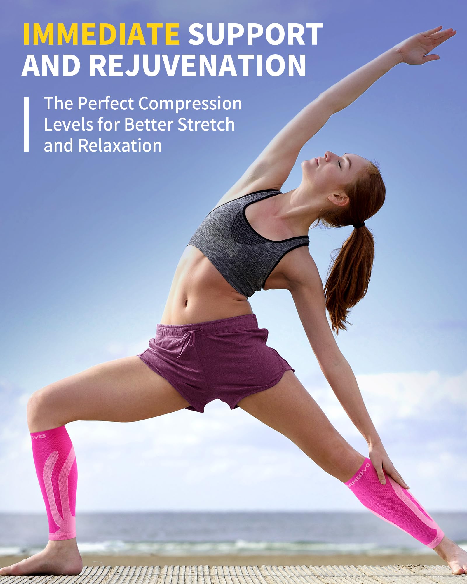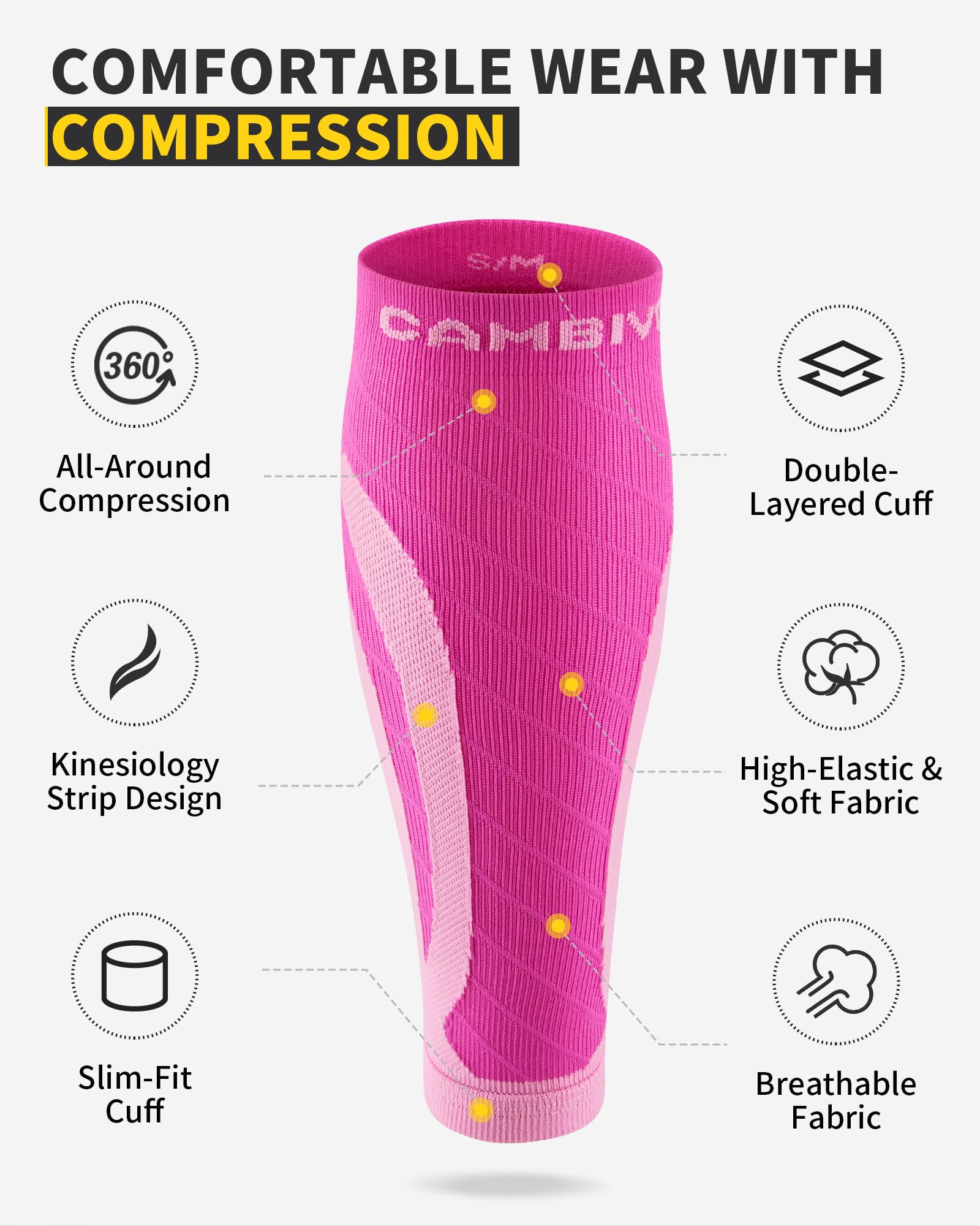 Breathable Fabric for All-Day Comfort - Utilizing 3D knitting technology, compression calf sleeve has excellent durability and breathability; moisture-wicking leg brace keeps your calves dry and eliminates annoying blisters and odor; double-layered cuffs ensure the sleeves stay in place as running accessories during activities; features a kinesiology strip design for added support