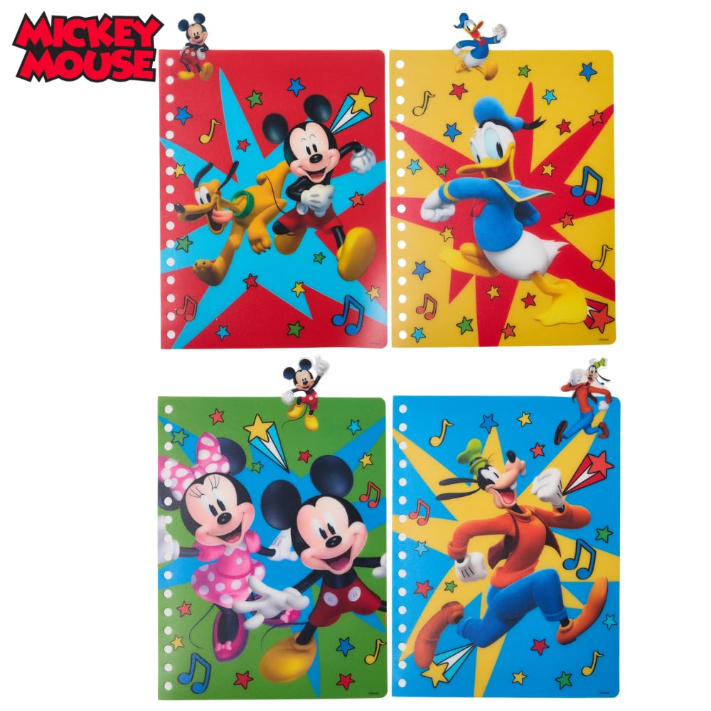 MICKEY NOTEBOOK - Features a cover with Mickey Mouse, lined pages with color images of Mickey on the corners, 4 color section dividers, and tab dividers with Donald Duck and Goofy.