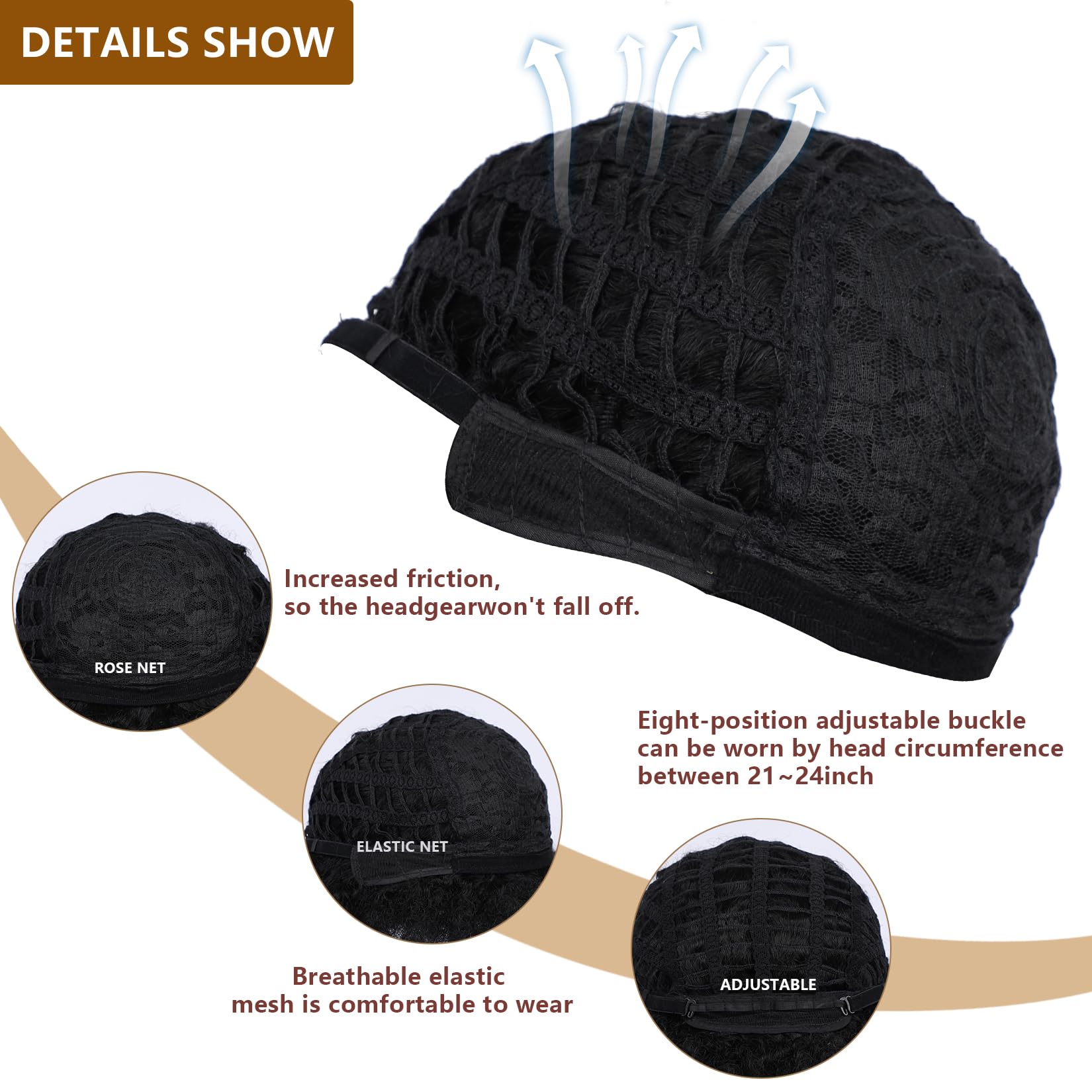 Wig Cap Size: About 21'' - 22.5'', can fit most people, there are 2 adjustable straps within the wig net, you can adjust its size to fit your head perfect