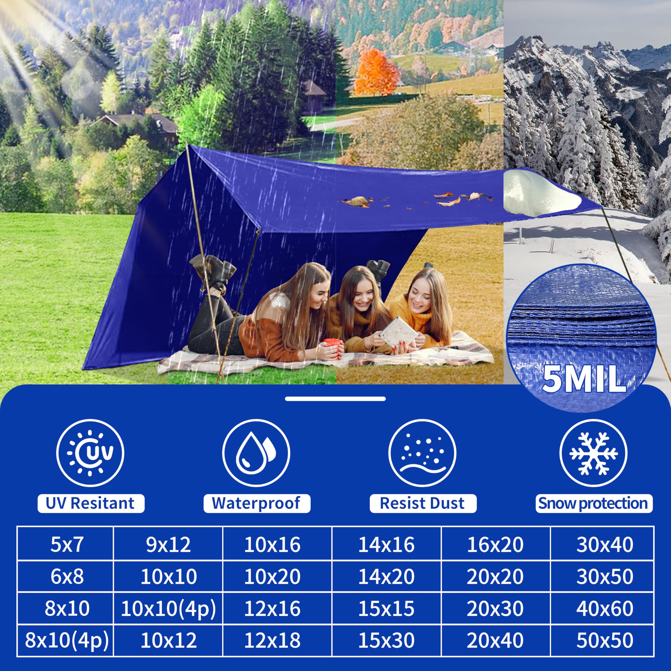 Waterproof and Windproof:The waterproof tarp has a thickness of 5mil, which provides excellent waterproof, windproof, and UV resistant properties while being lightweight. It can protect the items you want from rain, wind, and UV interference.