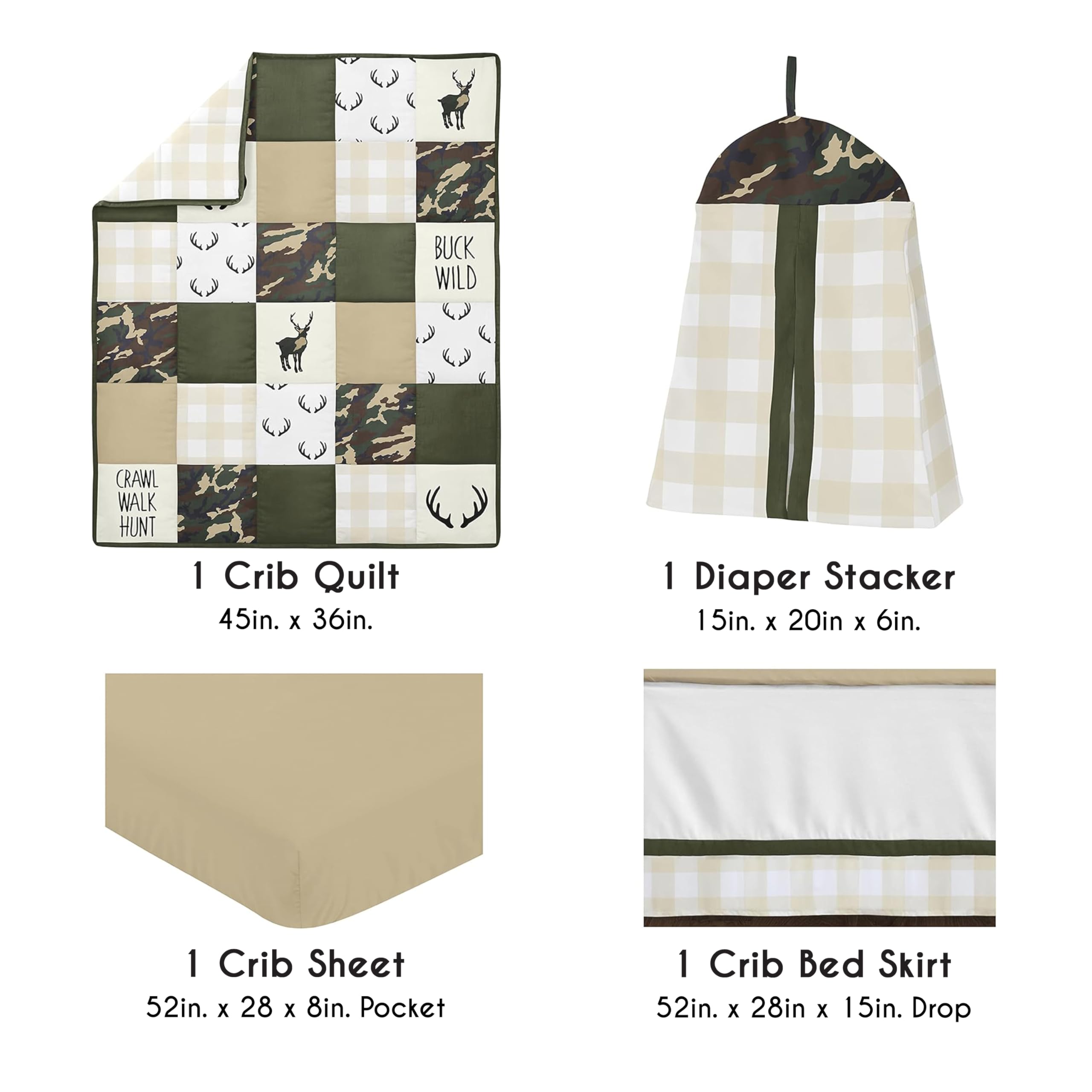 4 PIECE CRIB BEDDING SET INCLUDES: Crib Comforter (45in. x 36in.), Fitted Crib Sheet (52in. x 28in. x 8in. Pocket), Crib Skirt (52in. x 28in. x 15in. Drop) and Diaper stacker (15in. x 20in. x 6in.). An infant crib set including all the baby essentials is a great value compared to purchasing pieces separately. This baby crib set is made of soft microfiber fabric and features the earthy color palette of beige, ivory, hunter green, brown & black to bring your woodland camo baby room together.