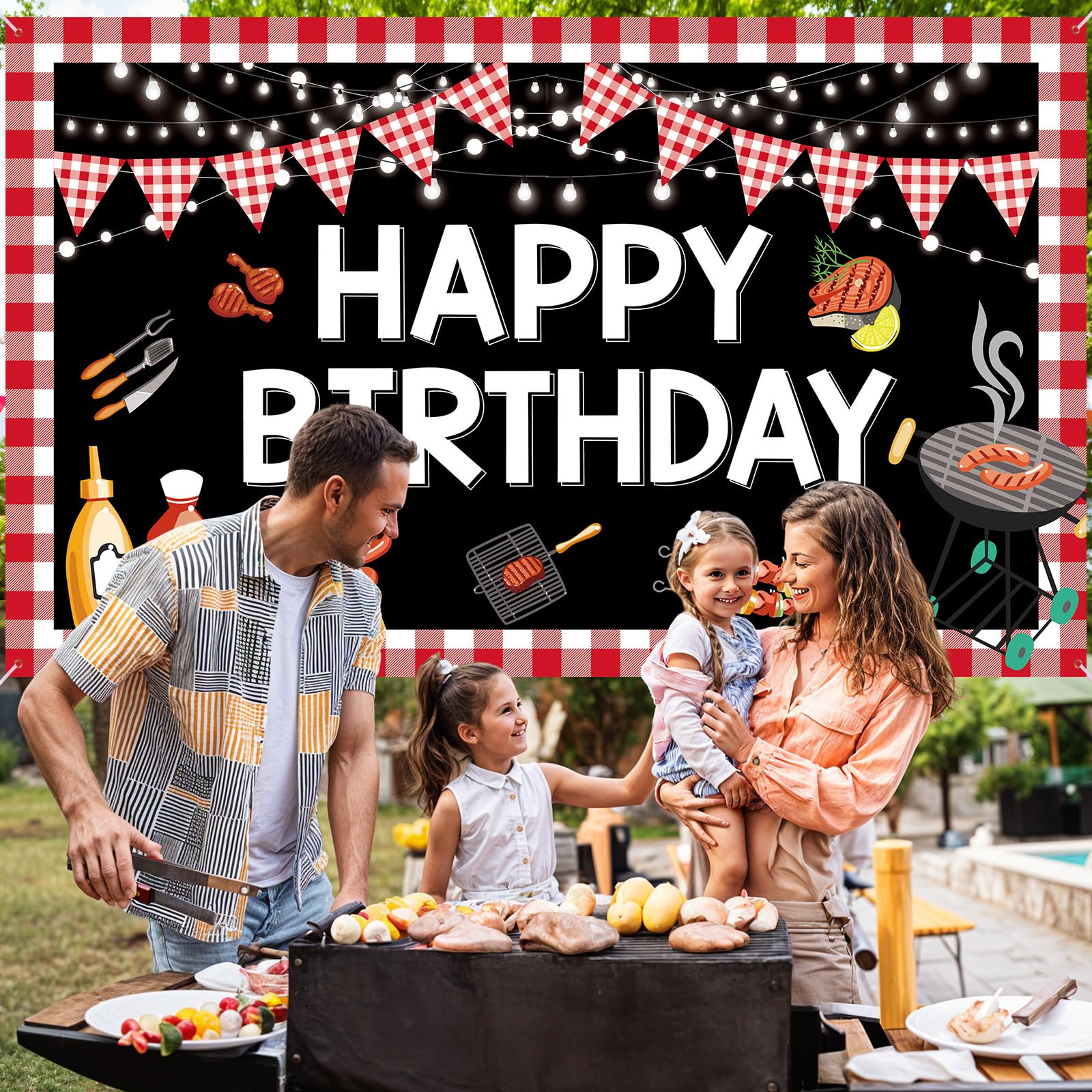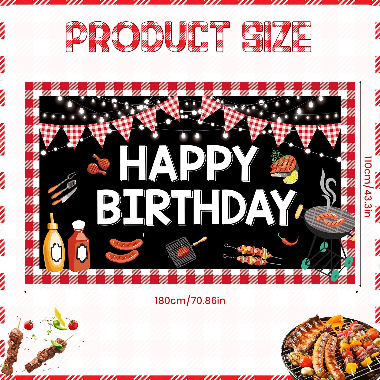 🥓【BBQ Birthday Party Decorations】The bbq birthday banner decorations are printed with many interesting cartoon barbecue patterns, such as red checkered pennant, roast meat, vegetables, grill, light, eye-catching "HAPPY BIRTHDAY" words and a classic red gingham and black background, the beautiful BBQ banner decorations will leave your party with unforgettable memories