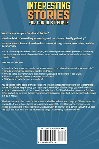 Want to impress your buddies at the bar? Need to think of something interesting to do at the next family gathering? Looking for unique gifts for men who have everything? Then grab a copy of Interesting Stories for Curious People—a wildly entertaining collection of strange-but-true tales, weird history, unsolved mysteries, and mind-blowing facts that will keep you reading “just one more page” all night long. Perfect for curious minds and casual readers alike, this quick and fascinating read is packed with bite-sized stories covering everything from history and science to true crime and the paranormal. Inside, you’ll discover: How a Frenchman beat a murder charge using a “spontaneous combustion” defense Why a German teenager might have accidentally helped end the Cold War What scientists were thinking when they pitched foam houses as the future of architecture What a chupacabra really is—and why there’s more than one kind Whether Cleopatra really died from a snake bite—or if history got it wrong You’ll laugh, you’ll learn, and you’ll definitely have a few jaw-dropping facts to share at your next dinner party. These interesting short stories for adults and teenagers are perfect for readers who love trivia, quirky facts, or just seeing the world from a slightly weirder angle. Whether you're looking for birthday gifts for dad or stocking stuffers for your nephew, this book is a guaranteed hit.