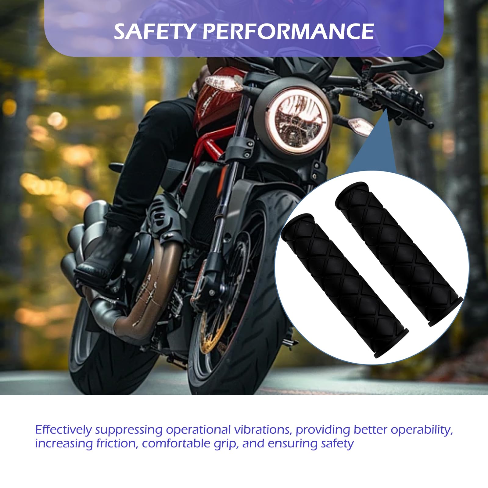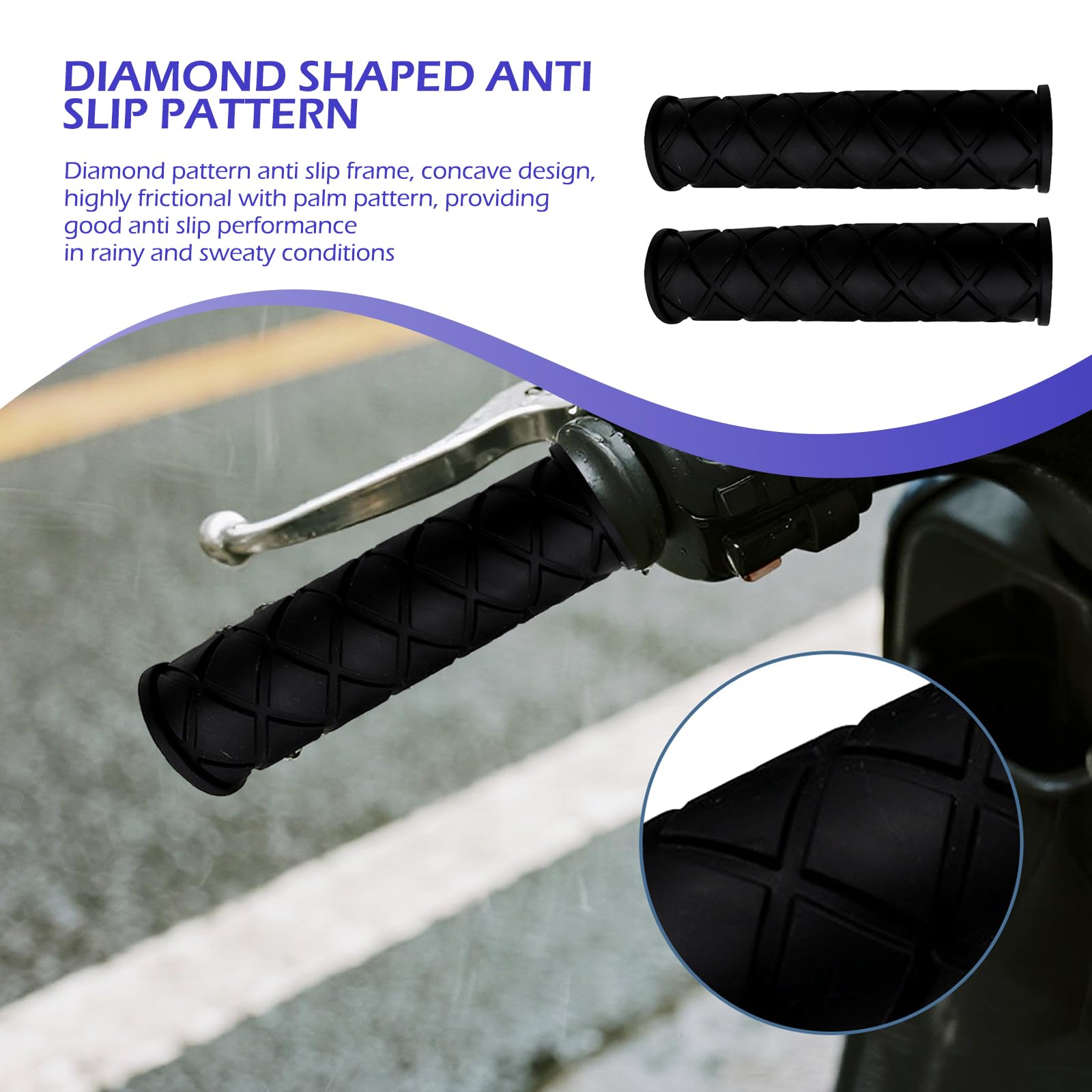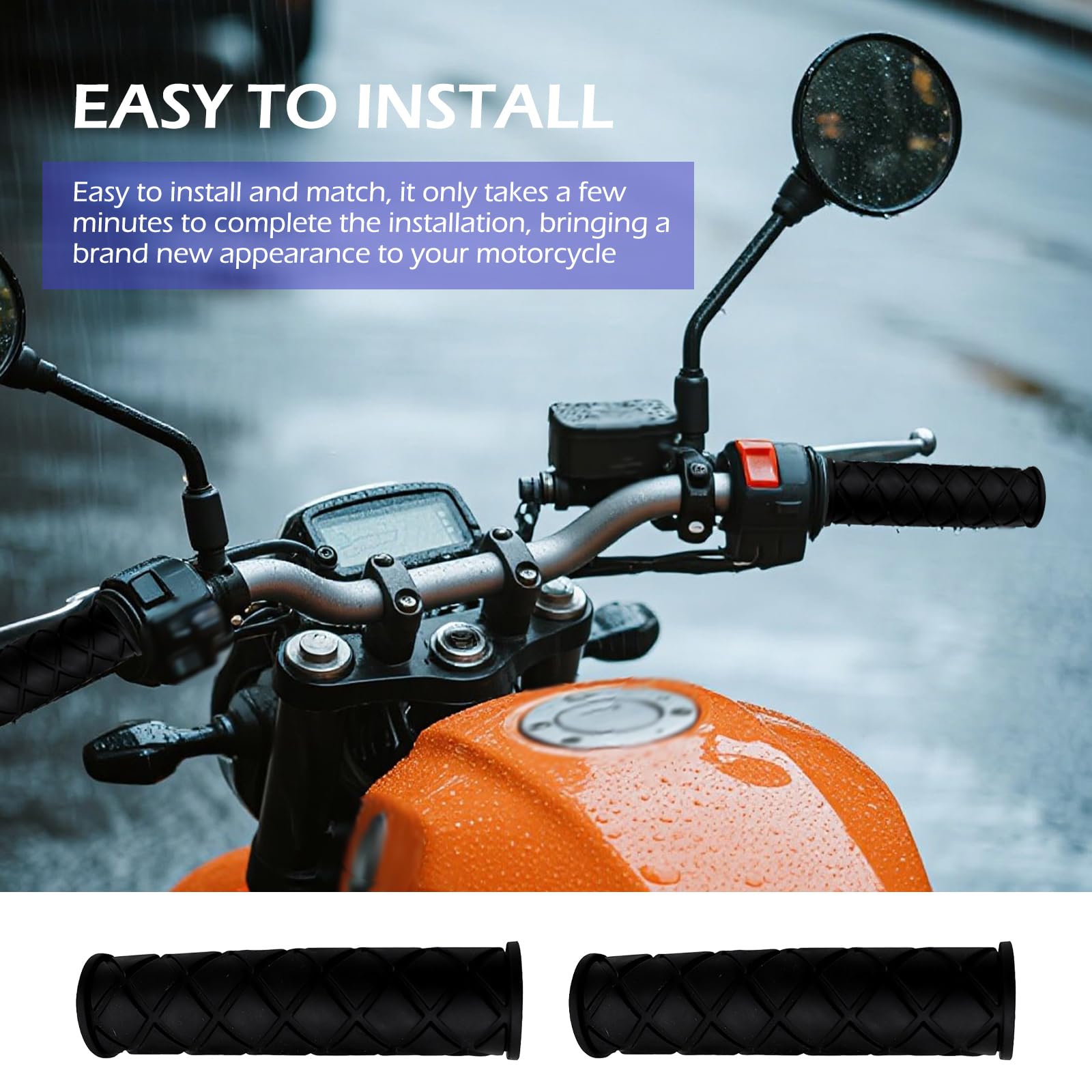 Motorcycle grips are made of high-quality rubber gel, wear-resistant and anti-fading. Diamond-shaped anti-skid texture, no slipping in rainy days, increased safety. Ergonomic design, shock absorption and anti-fatigue, stable grip. Suitable for multiple models, left handlebar diameter 7/8 inch (22 mm), right handlebar diameter 1 inch (24 mm).