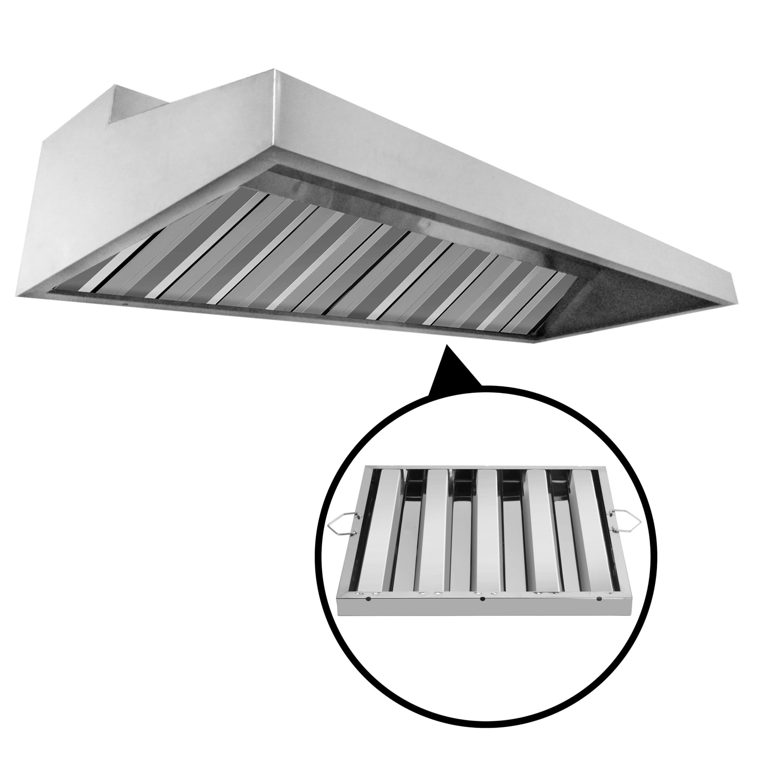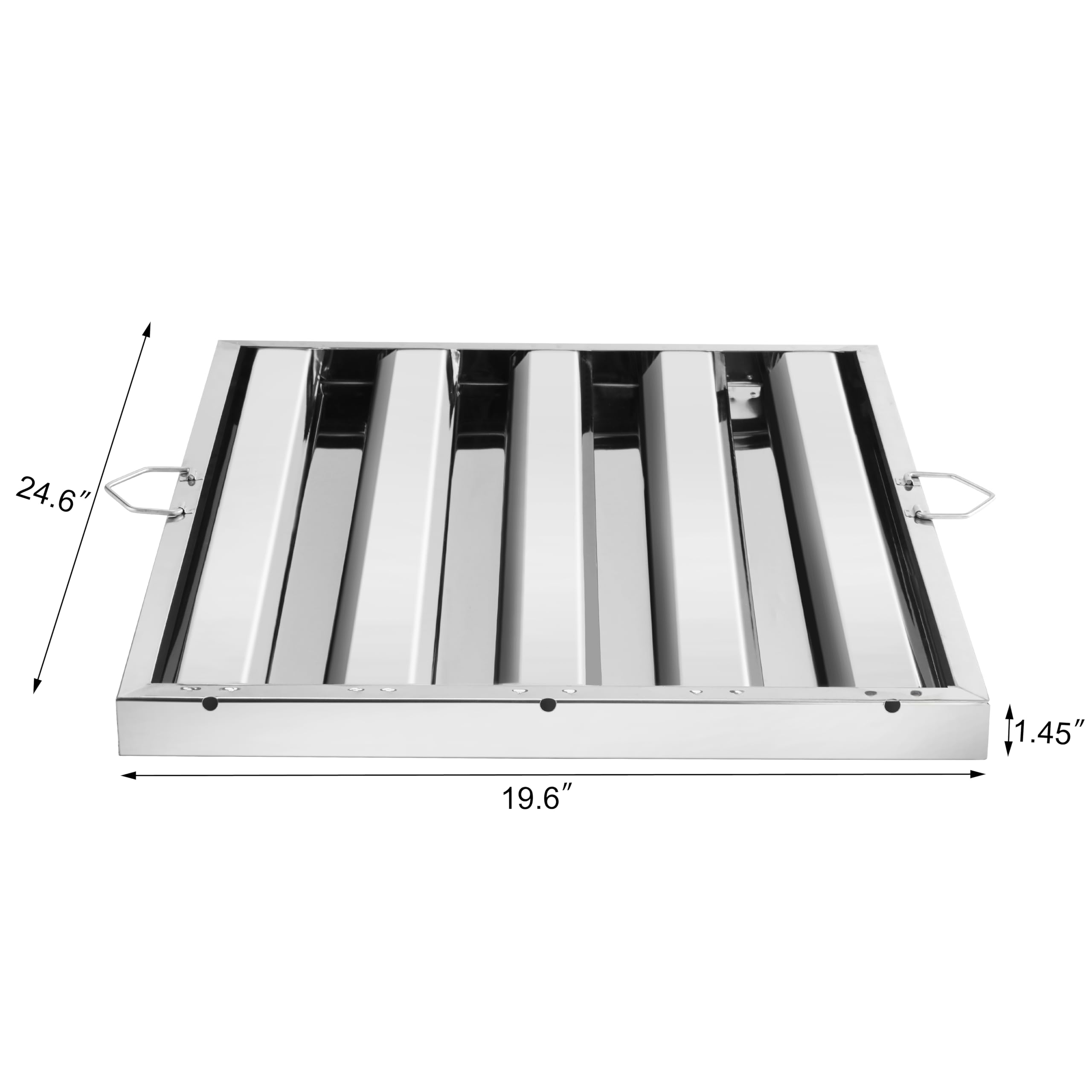 Made of welded type 430 stainless steel construction, this hood filter withstands the demands of your busy, commercial kitchen. 20" W x 25" H Solids and grease are deposited directly onto smooth, vertical baffles and drained out, assisting in reducing the potential for grease fires. Rugged drop handles ensure both durability and easy installation. When it's time to clean your filter, the handles provide easy removal. This hood filter cleans easily with soap and water. You can also use a pressure washer to ensure that you keep your filter working properly. It's even dishwasher safe for added convenience!