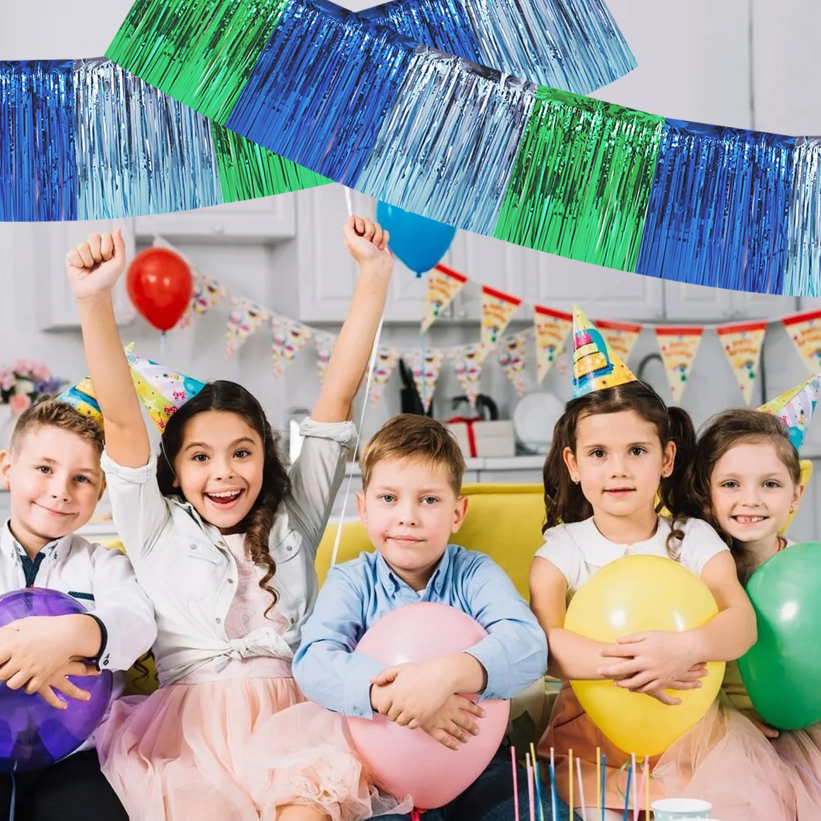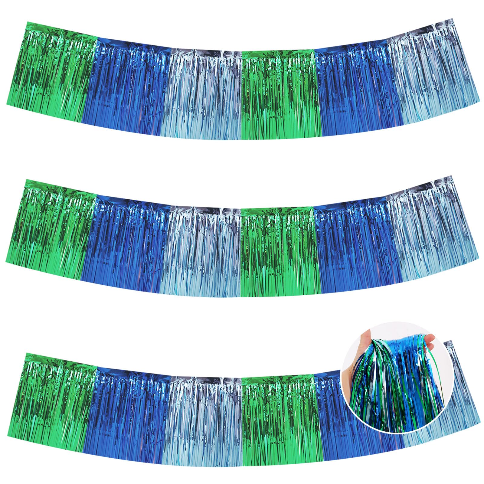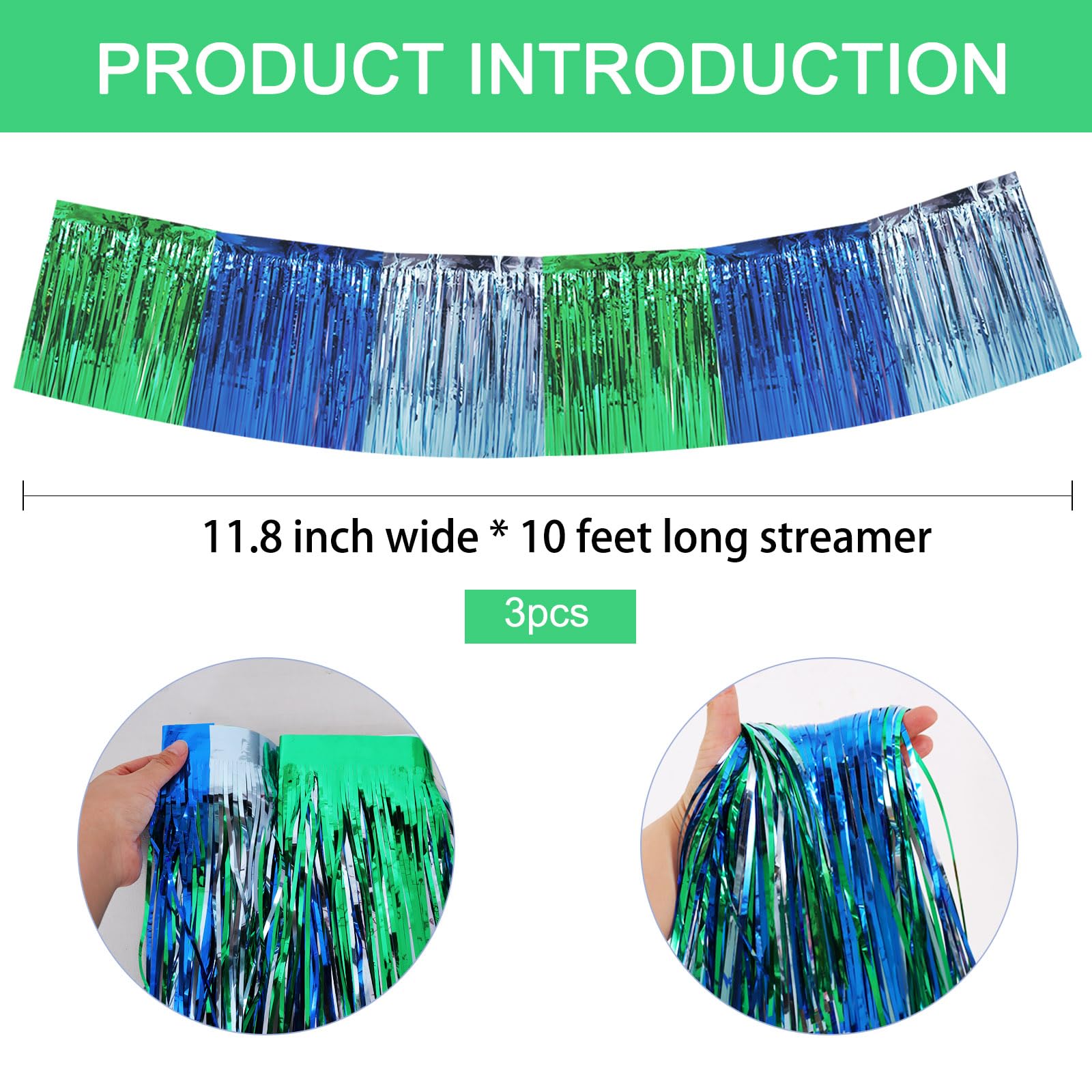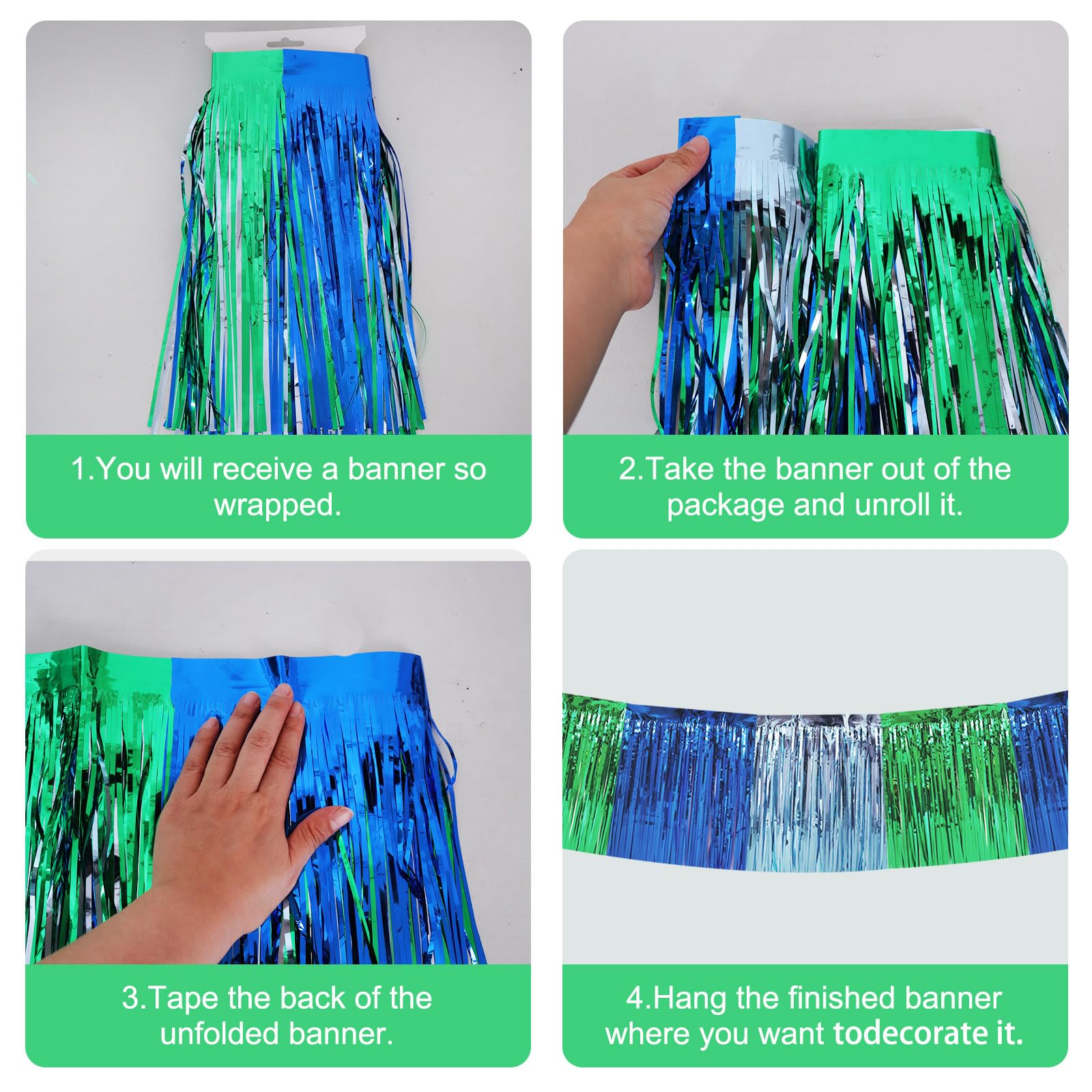【Product name】Foil Fringed Garland 【Product includes】 △ 3 Packs Metallic Foil Fringe Garland (30 Feet in total) Sufficient length can meet your different parties decoration needs. 【Easy to install】 △ 1. It comes with double sided tape on the top, peel plastic strip off and it would be very easy to paste on smooth surfaces such as wall, window, table, door or anywhere you like. △ 2. Hang the banner to anywhere you want,which can be easily glued to the wall or table, and can be easily cut into any size to decorate your party. 【High quality】High quality metal foil △ We highly recommend this shining metal foil curtain / metal tassel garland,which is the perfect decoration for any birthday or party so that your party will be bright. △ You can choose from a variety of bright colors, such as ,purple,blue,black,pink,white,green,rainbow. Choose the color that matches your party. I'm sure that no matter which color, it will become the most dazzling decoration in your party. 【Perfect For Party】Perfect as party backdrop for birthdays, graduations, New Year's Eve, sweet 16, movie night, farewell party, retirement party, and so on.