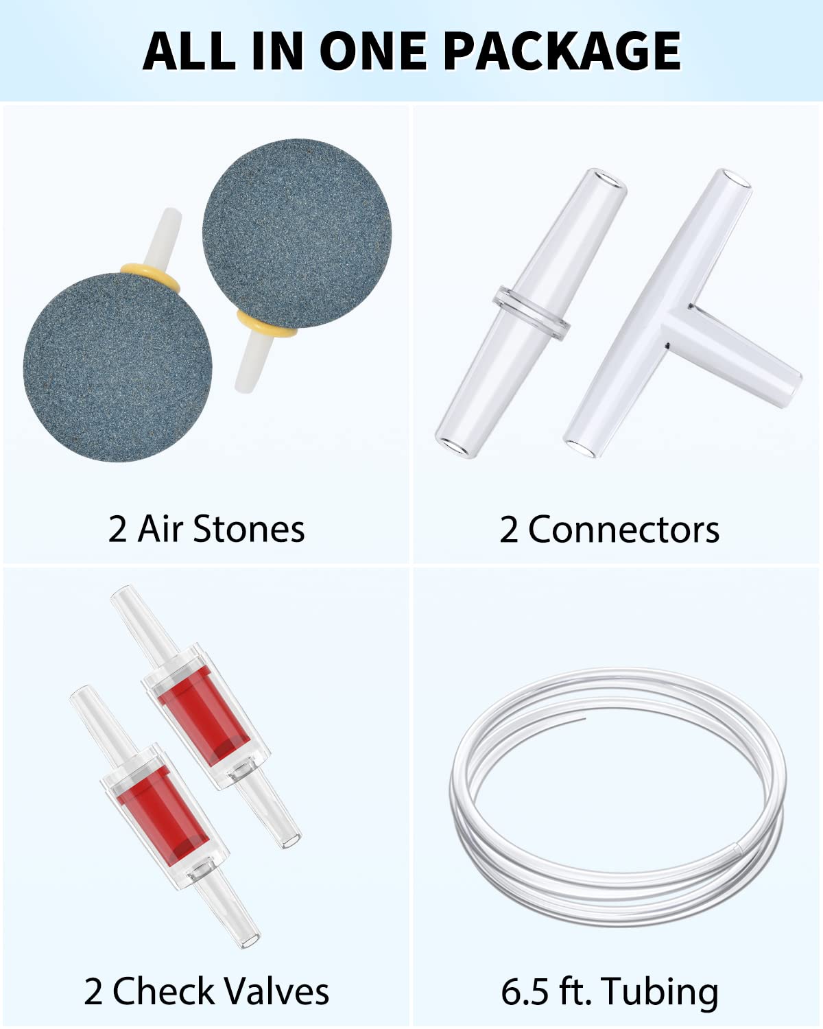 Pump Accessories: Include 2 air stones, 6.5-foot airline tubing, 2 check valves and 2 connectors. Complete accessories to build the basic aeration setup in your tank.