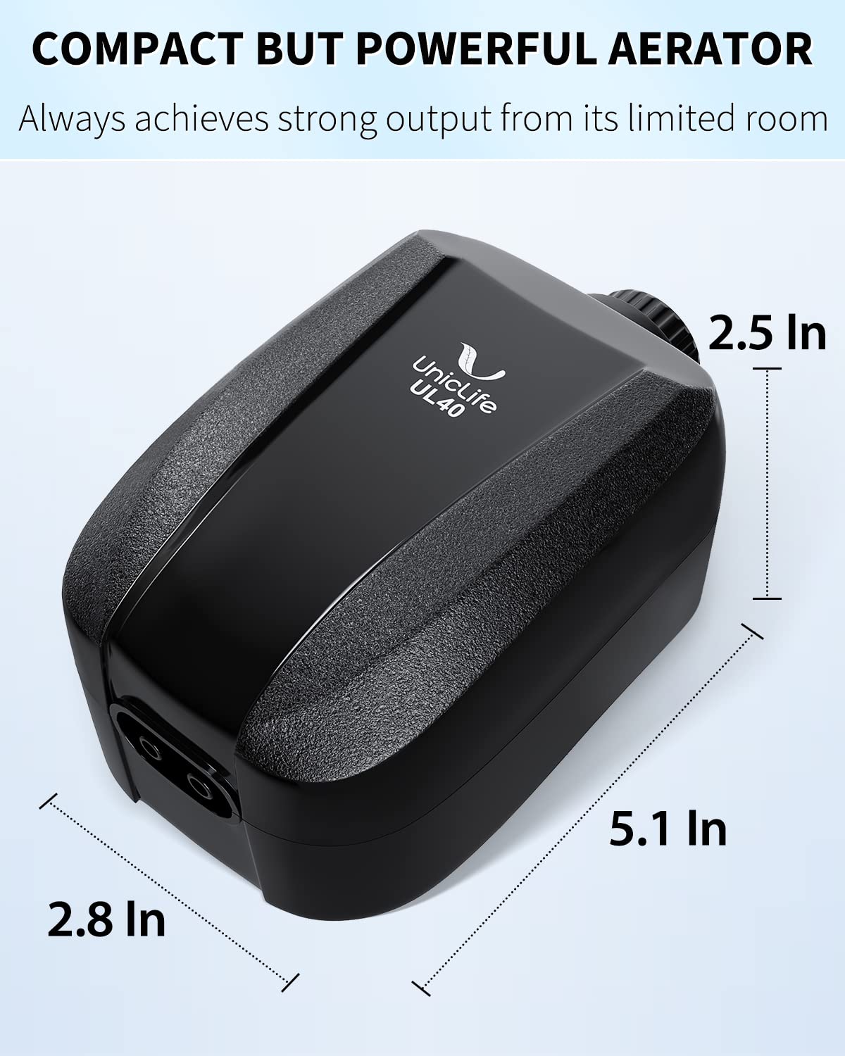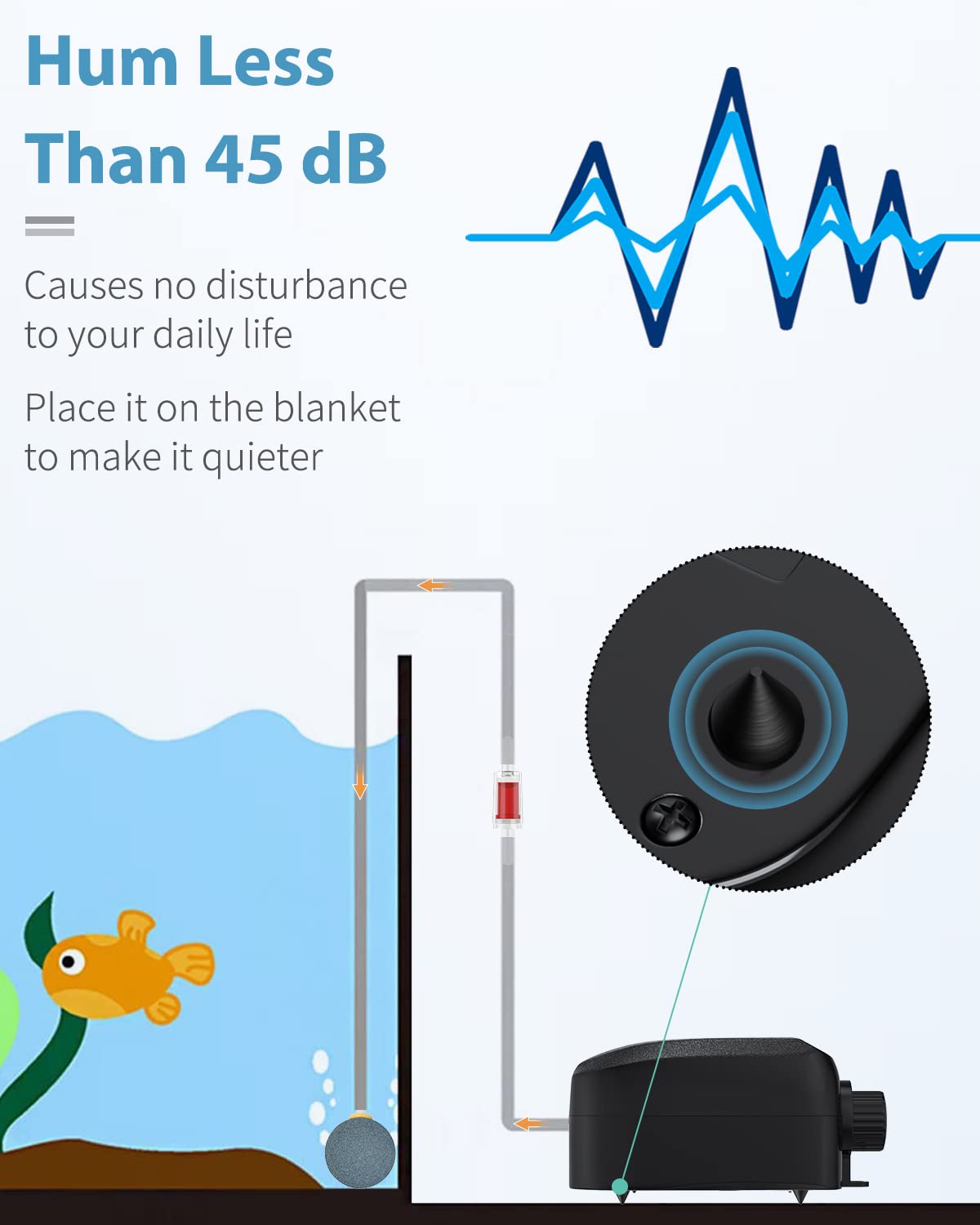 Adjustable Air Flow: Feature a rotary knob to control the amount of air for dual outputs, allowing for your desired air flow to fully oxygenate your fish tank.