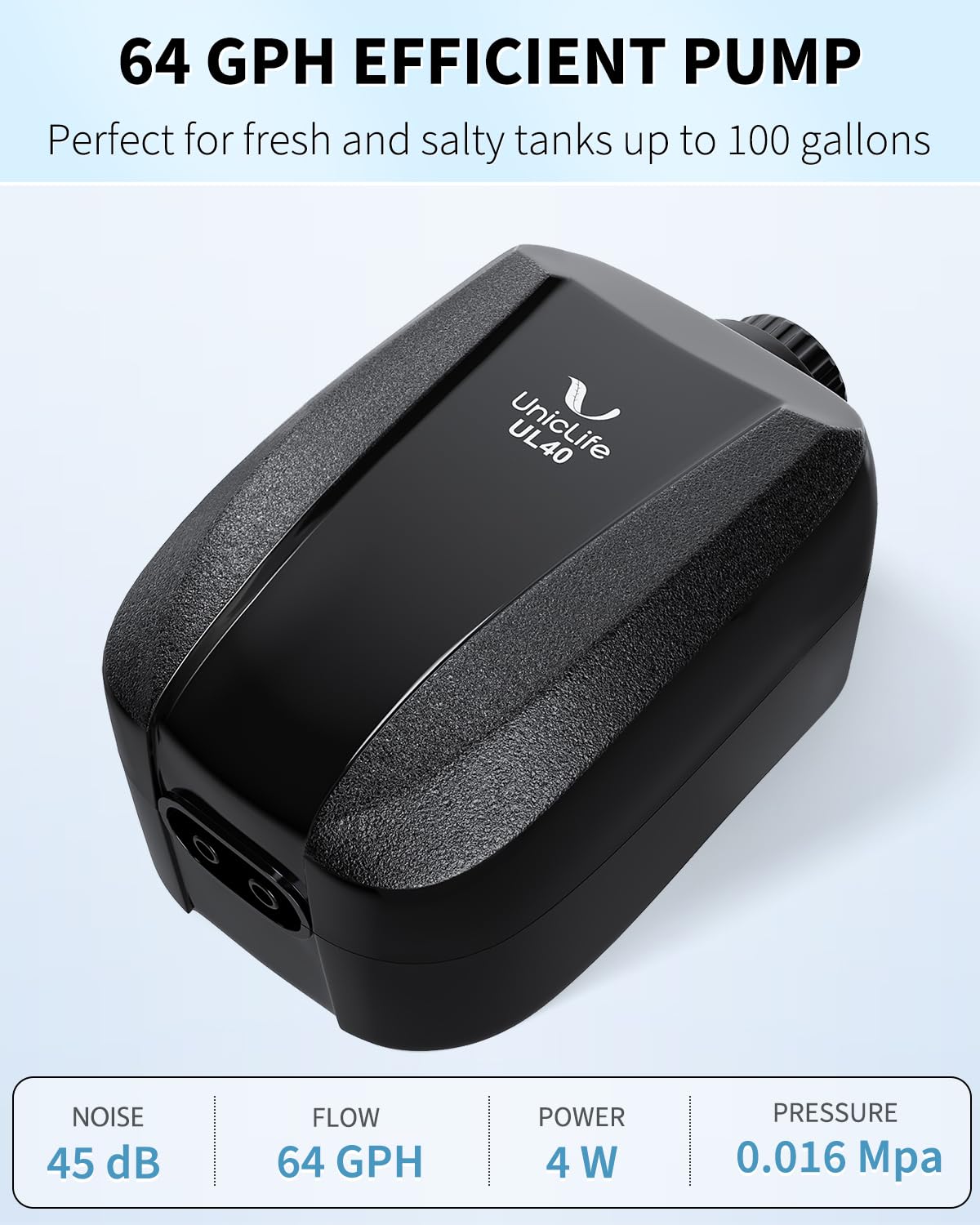 Steady Output: Max Air Flow Rate: 64 GPH; Pressure: 0.016 MPa; Power: 4 W. Perfect for aeration in 10 - 100 gallon fresh water and marine aquariums.(The data is measured with experimental equipment and may deviate slightly from the actual data. The air volume may be insufficient due to the blocked air intake cotton. Please replace the cotton yourself if the air volume is insufficient.)