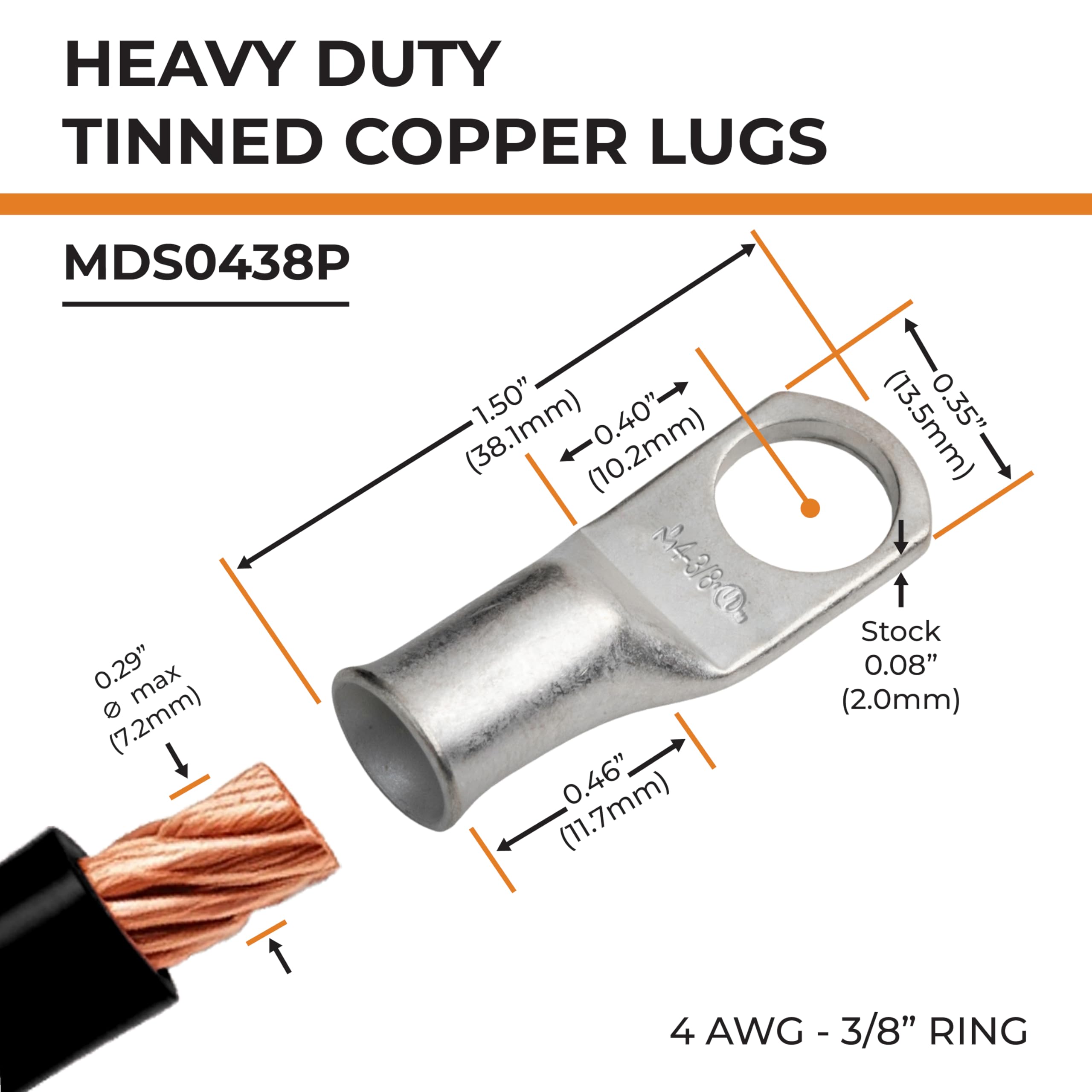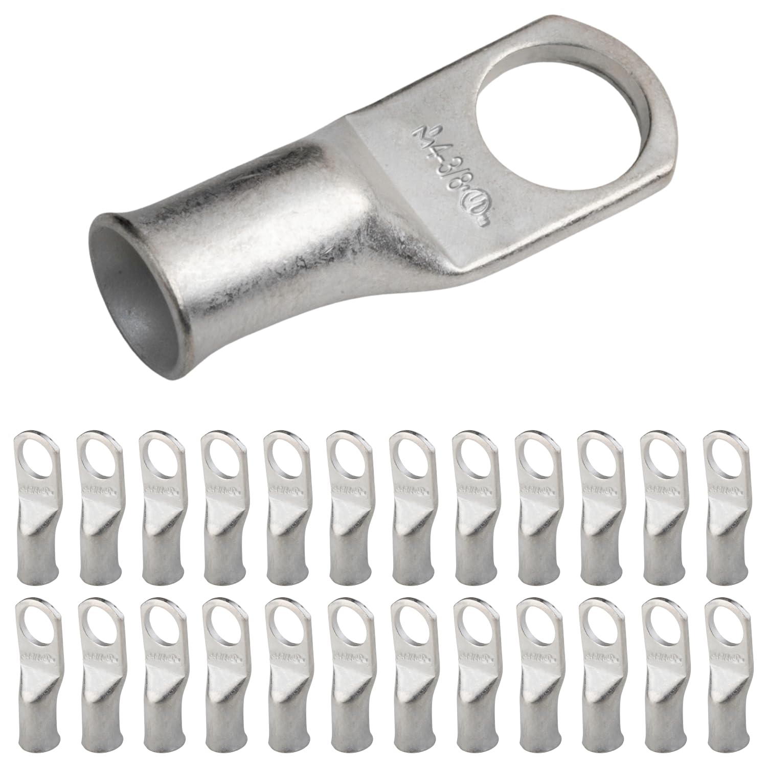 PACKAGE CONTENTS - 25 PCS. of Marine Grade Tinned Copper 4 Gauge (AWG) 3/8" ring battery cable lugs / terminal connectors. 100% annealed tinned copper, providing a high degree of conductivity for maximum current flow when used as battery terminals.