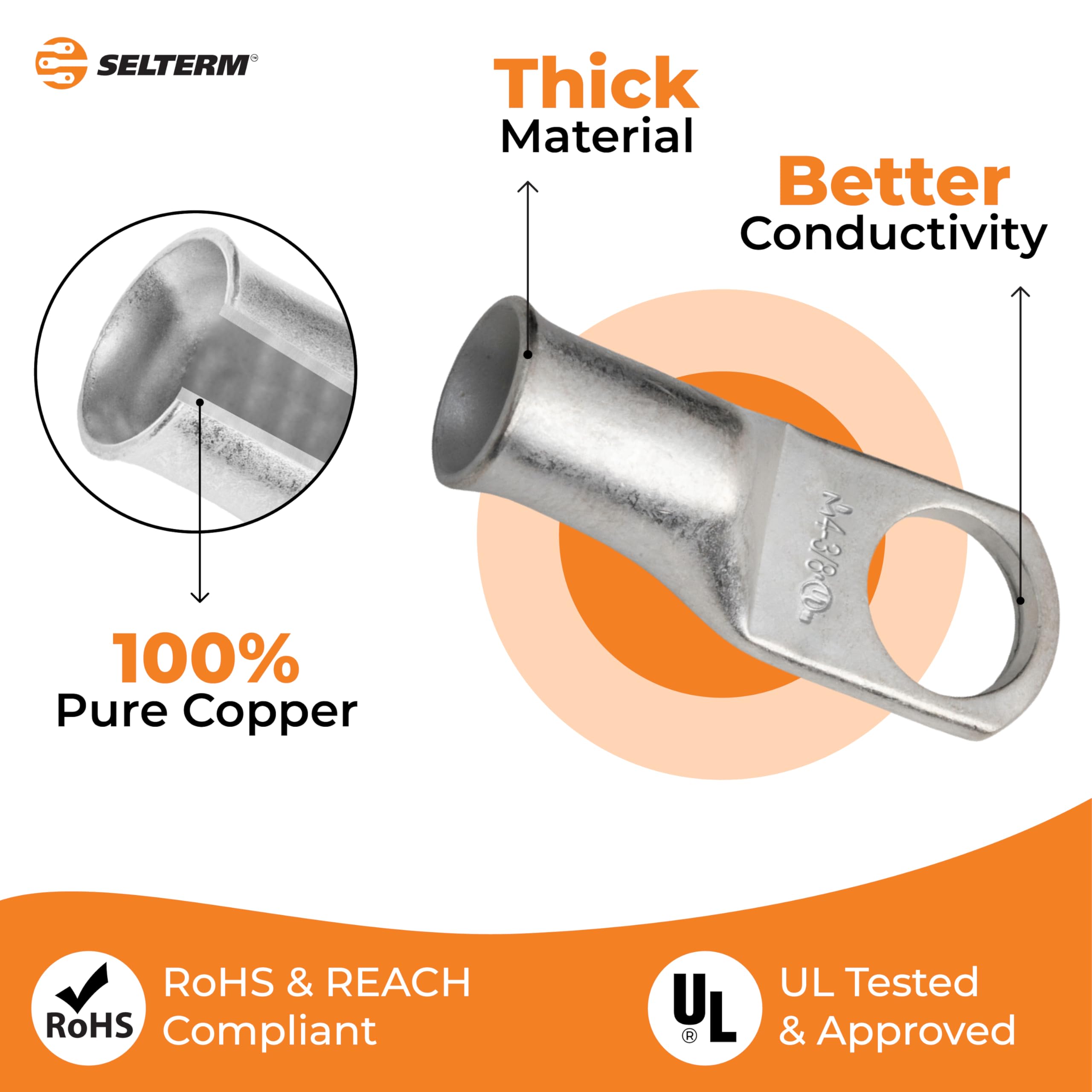 HEAVY DUTY WIRE LUGS - Our ring terminal connectors are tested to meet S.A.E conductivity standards J163 & J1811; UL listed to U.S. & Canadian safety standards and rated to 600V+ when properly installed; RoHS & REACH compliant; These Battery Wire Connectors are listed under UL File Number E254830.