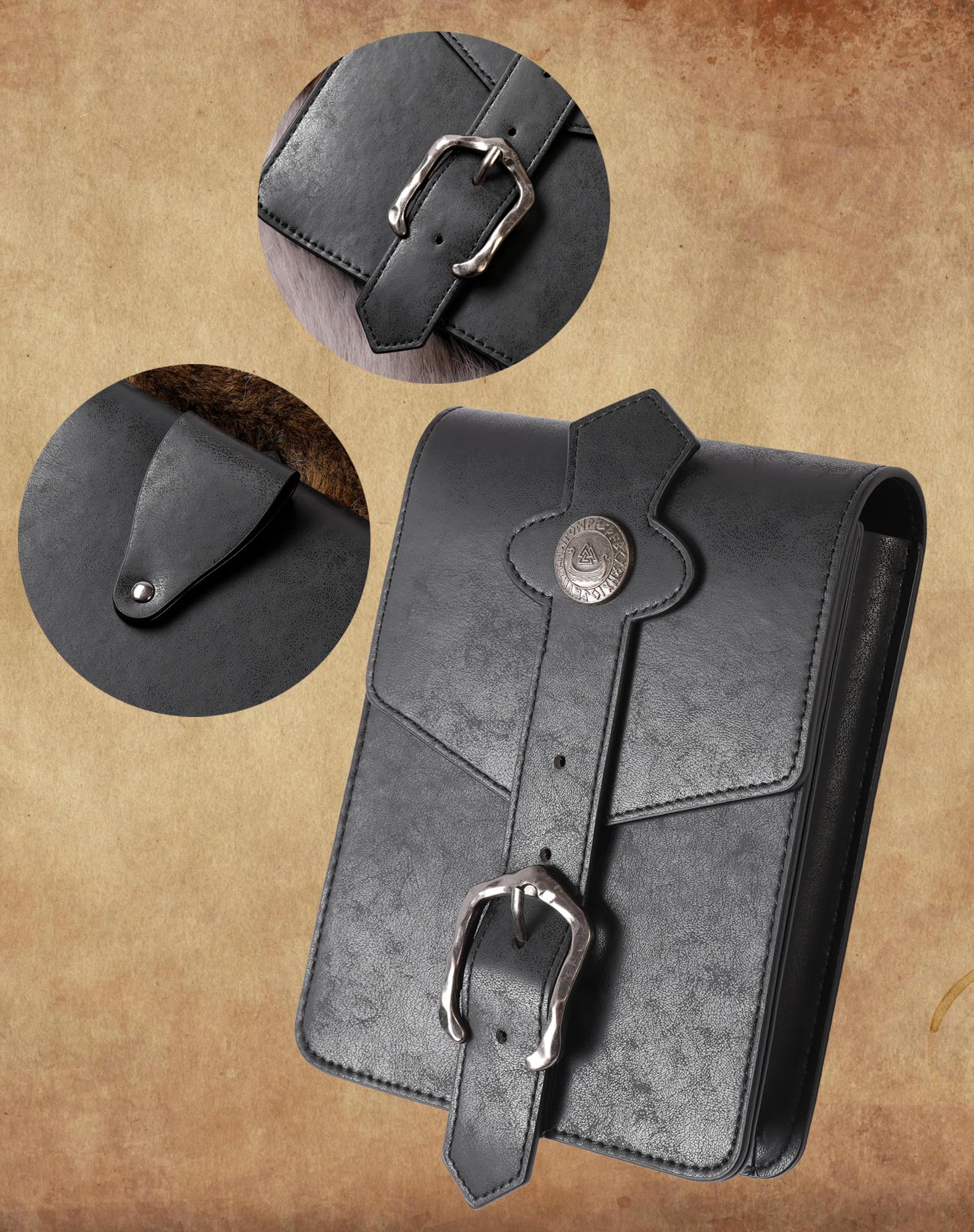 Dual-Look Viking Belt: Our vintage metal buckle medieval belt measures approximately 60 x 1.6in. Its uniqueness lies not only in its dual-color design but also in its meticulously reinforced thickness, ensuring long-lasting and eye-catching appeal.