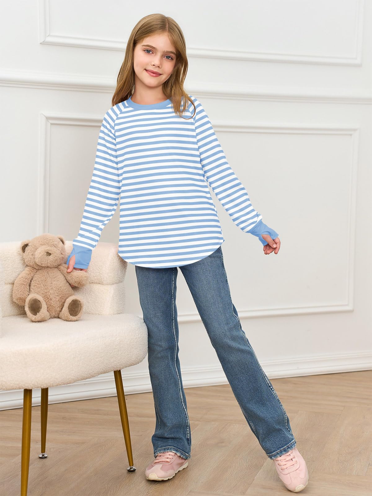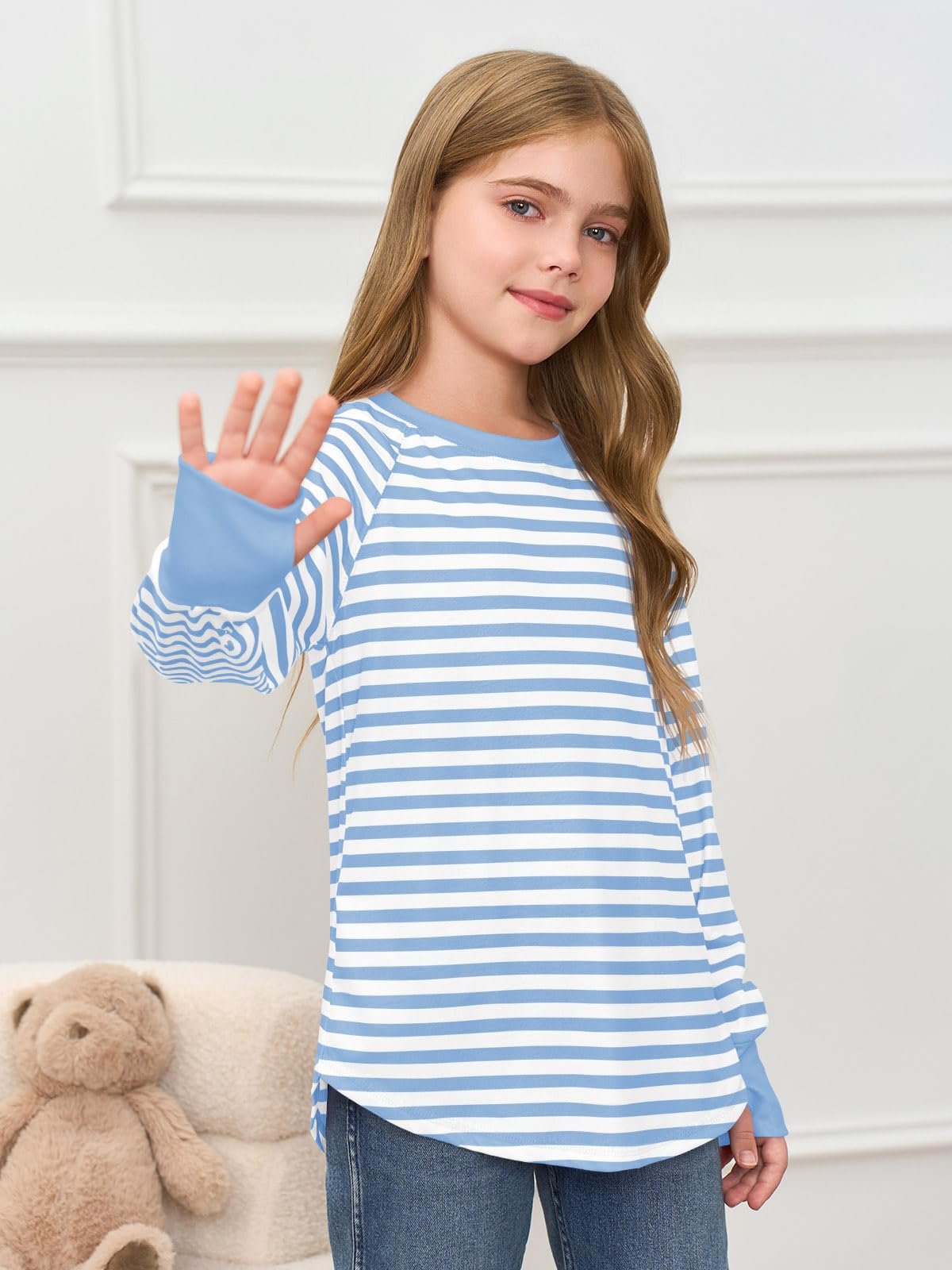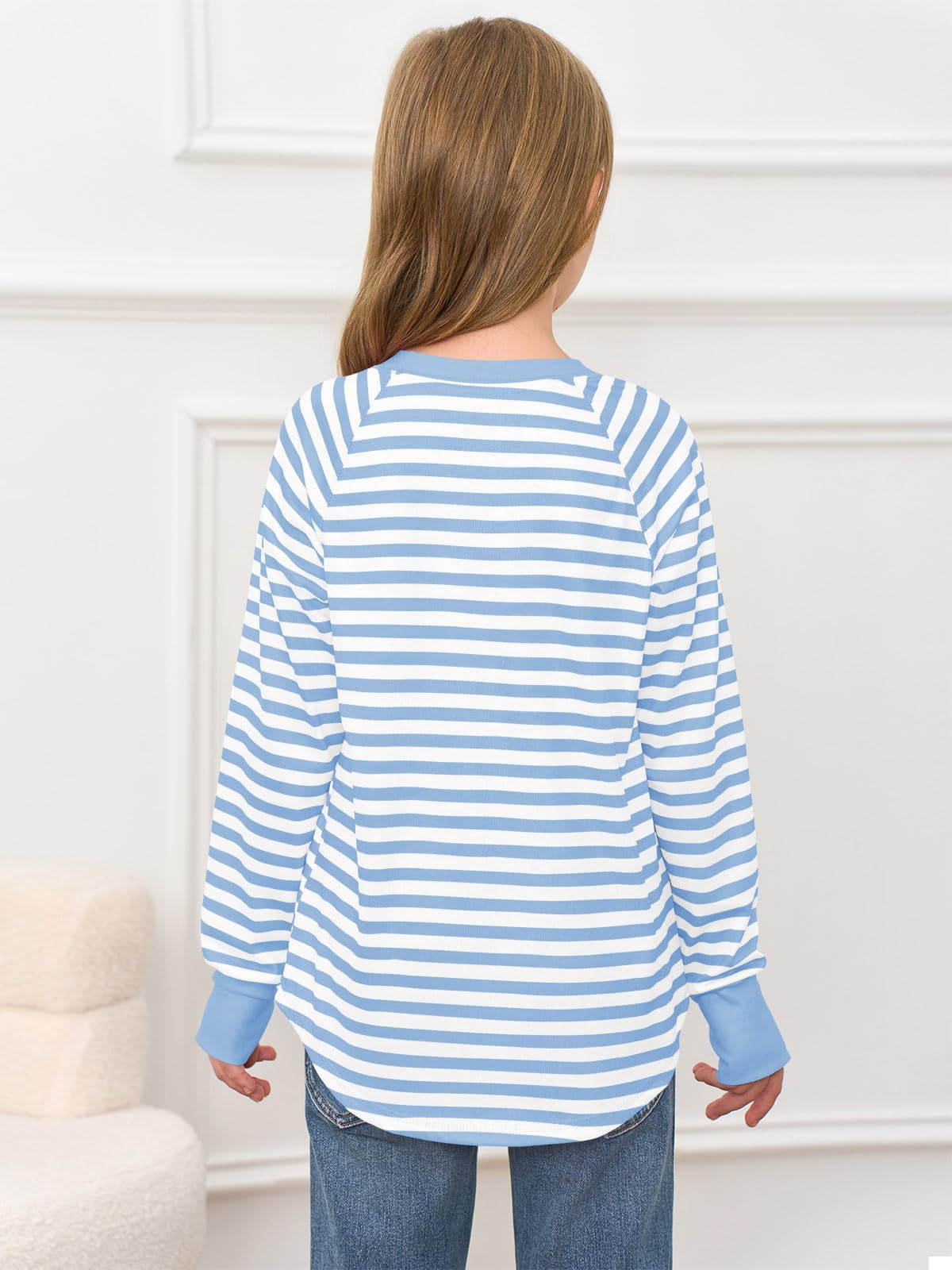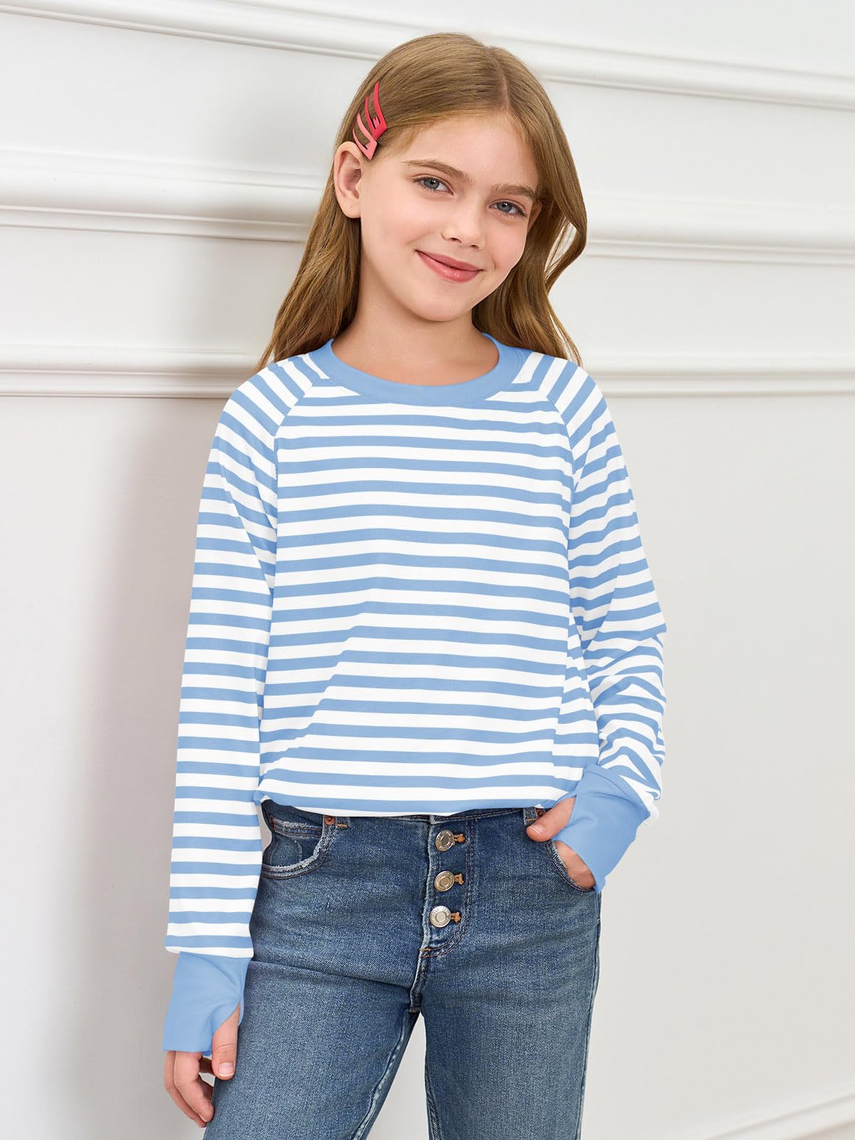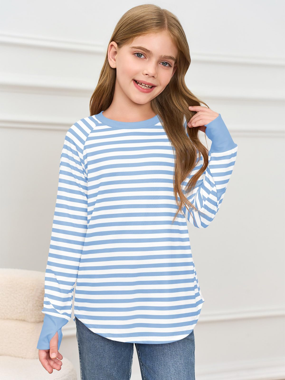 Features: Long sleeve shirts for girls loose fit, casual pullover tunic round neck tops with thumb holes, casual t-shirt, crew neck sweatshirt for kids, cute fall tops with curved hem, classic stripe colors top. The curved hem will bring some much needed “oomph” to your day-to-day looks