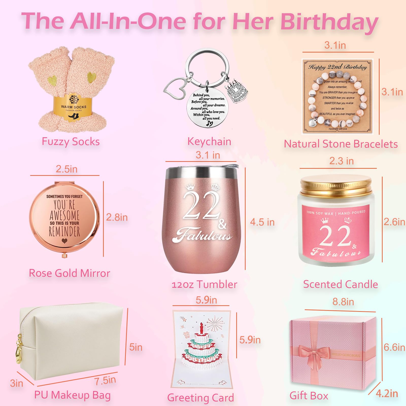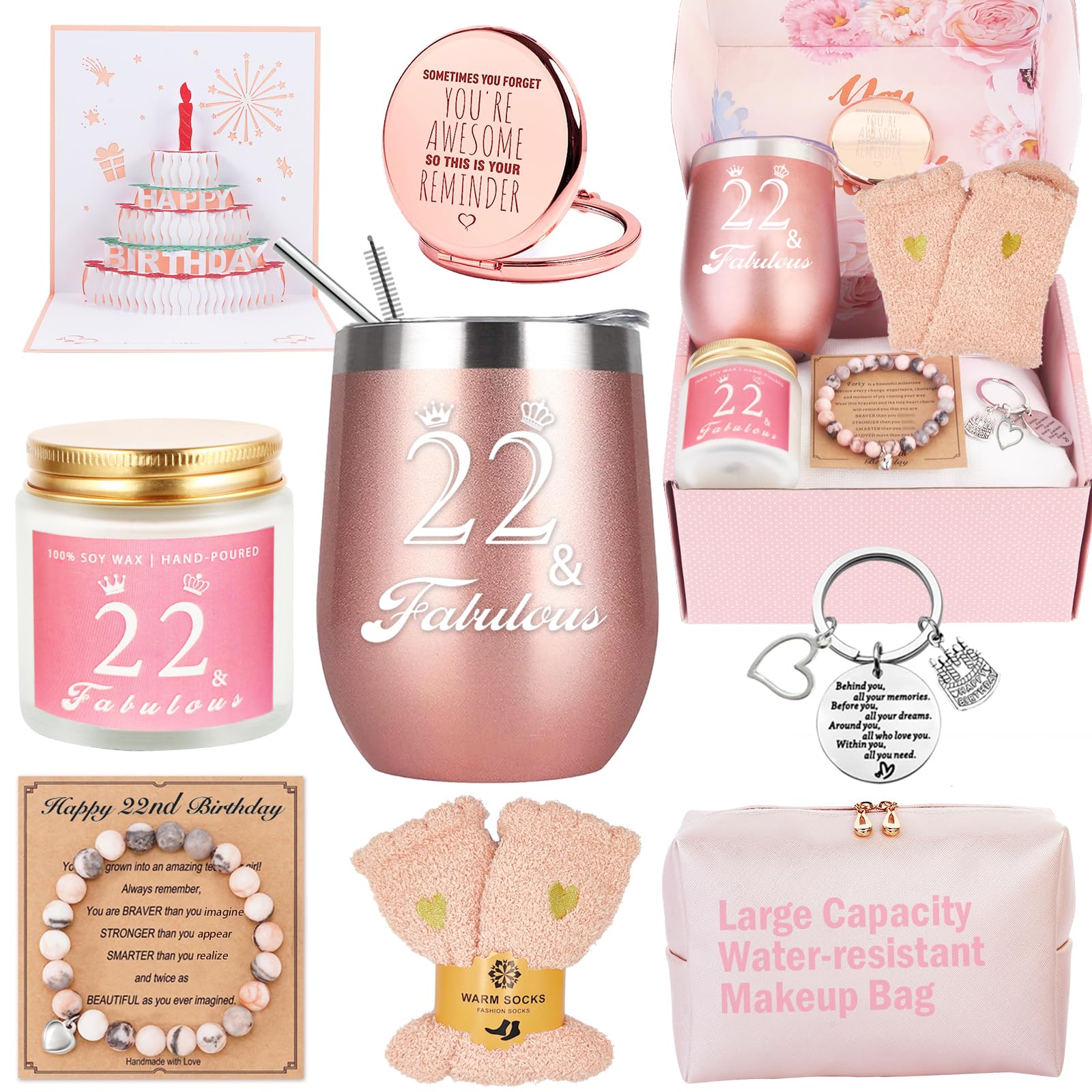【Best Friends Gifts Box For Girls Women】 Imagine the surprise of receiving this gift on her 22nd birthday. She can use candle to make her feel smoothing and is great for sleep-promoting, enjoy the happiness of making up with rose gold mirror and makeup bag and have a morning coffee or afternoon drink with her new favorite wine tumbler. A good day starts with your birthday gifts!