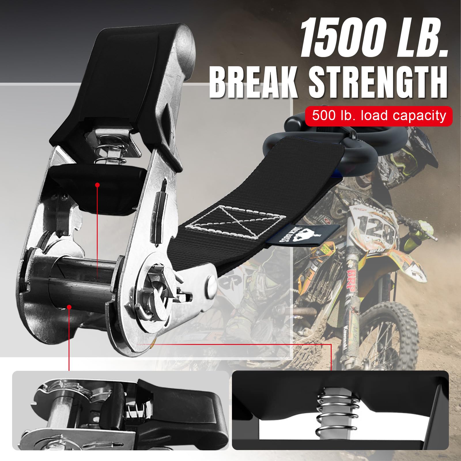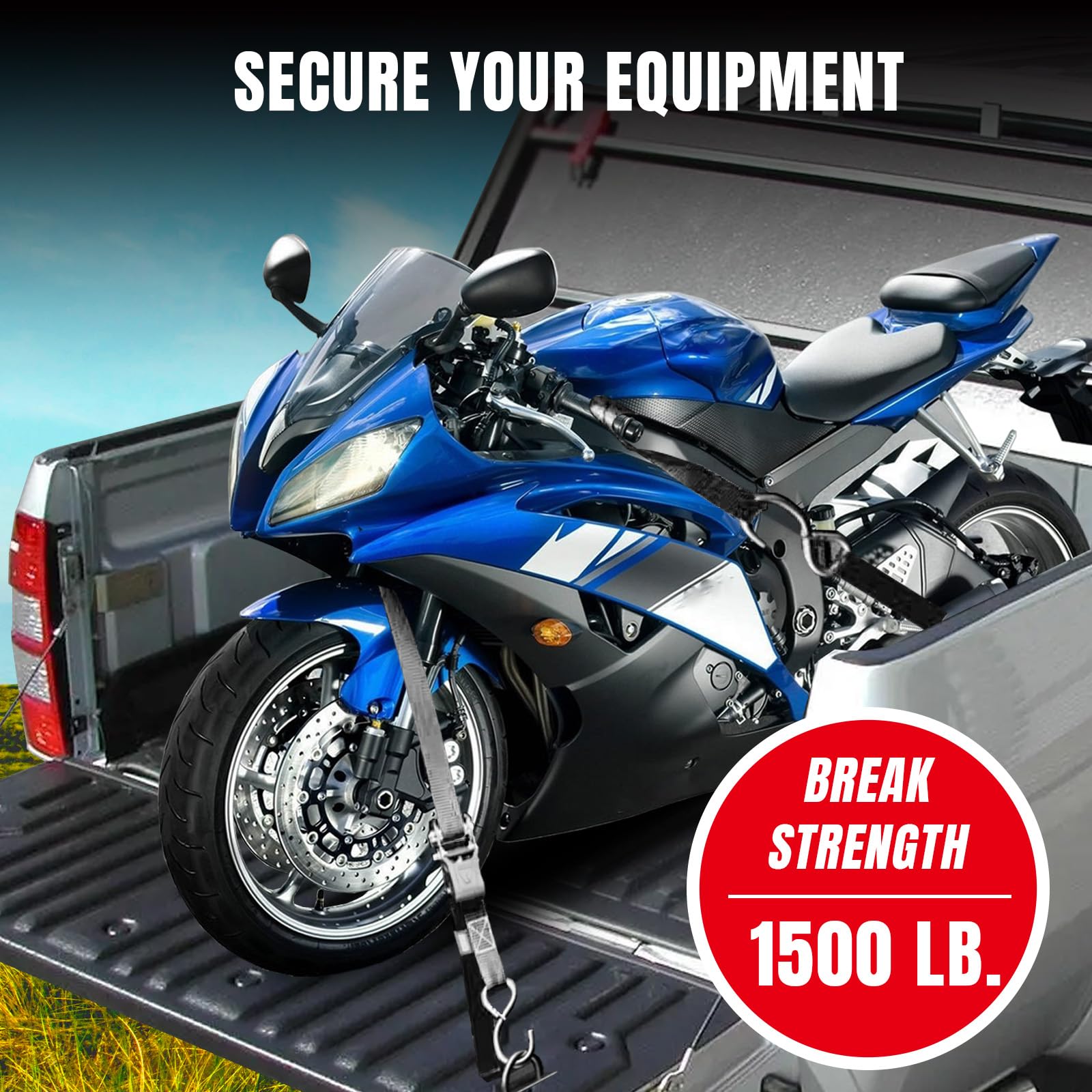 Multipurpose Straps:Each adjustable ratchet strap is 1"(wide)x 15'(long) with 1500 lbs max break strength and 500 lbs working load capacity.8 straps is plenty of strength to hold.Ratchet Tie Down Straps perfect for vehicles of various sizes to secure motorcycles,bikes,ATVs,accessories-cargo on luggage, trailers,pickup truck beds in different outdoor weather conditions