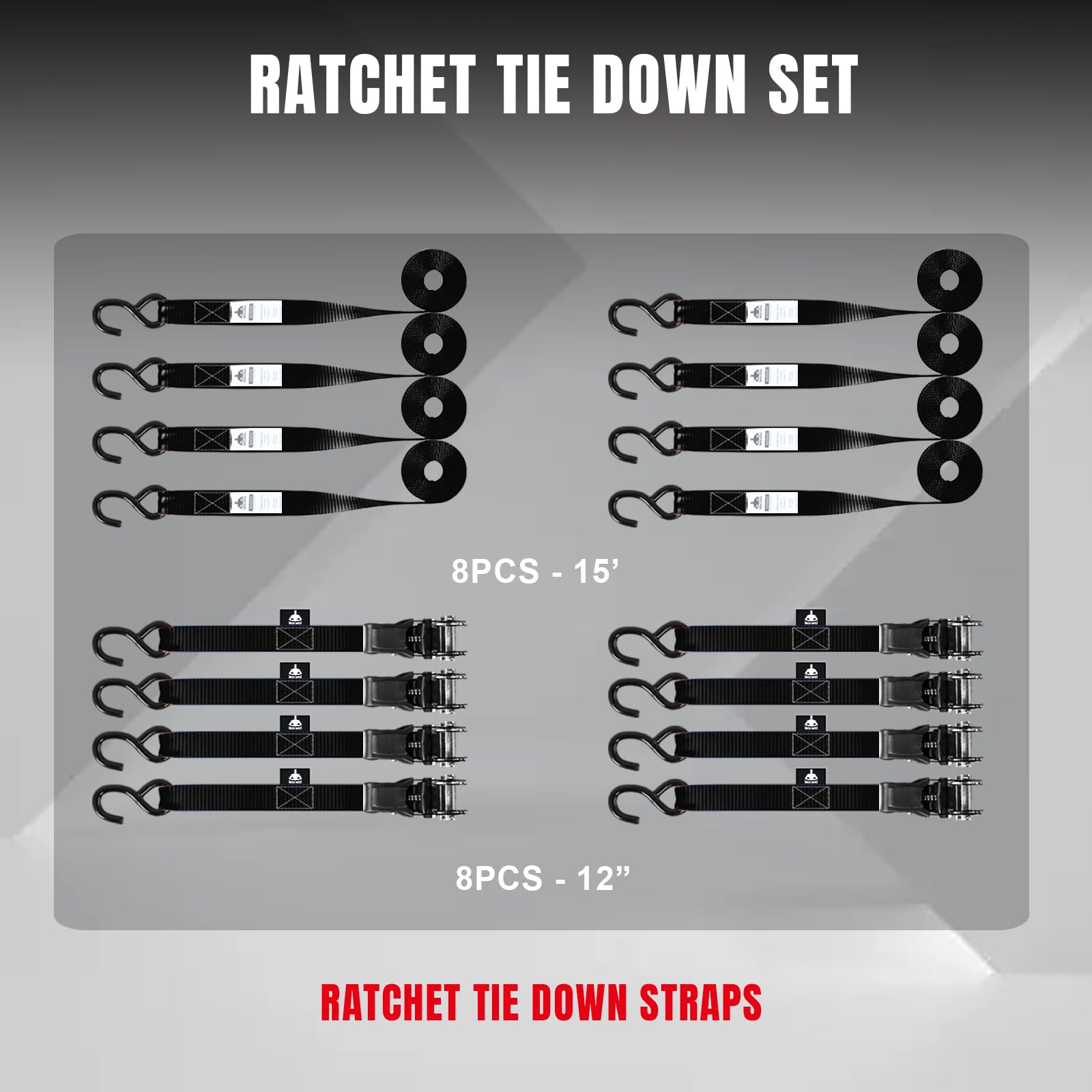 Dimensions and Packages:Tie Down Straps are 1"(wide)x 15'(long) size.Package include: 8x Durable metal ratchet buckles with 16 heavy-duty Coated S Hooks
