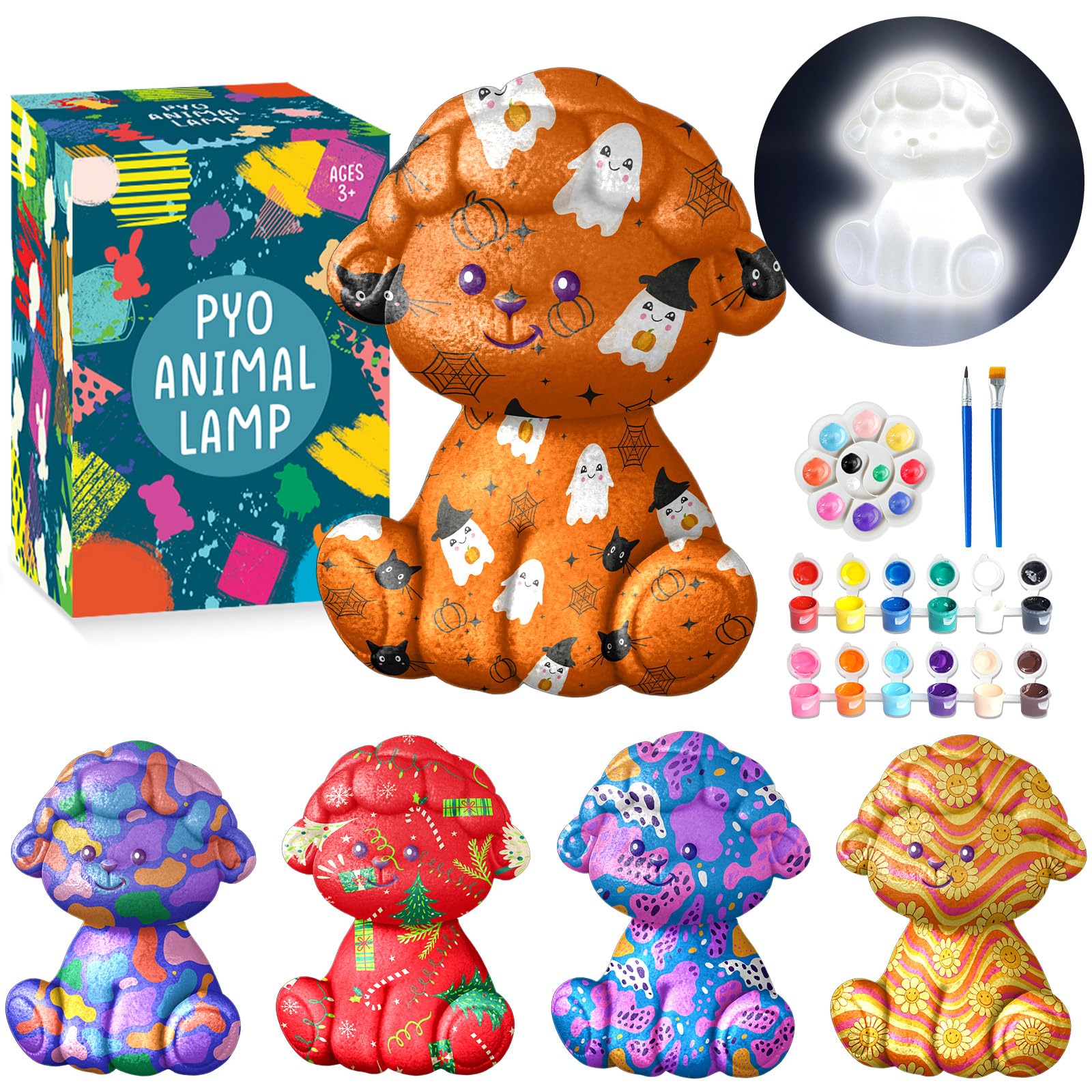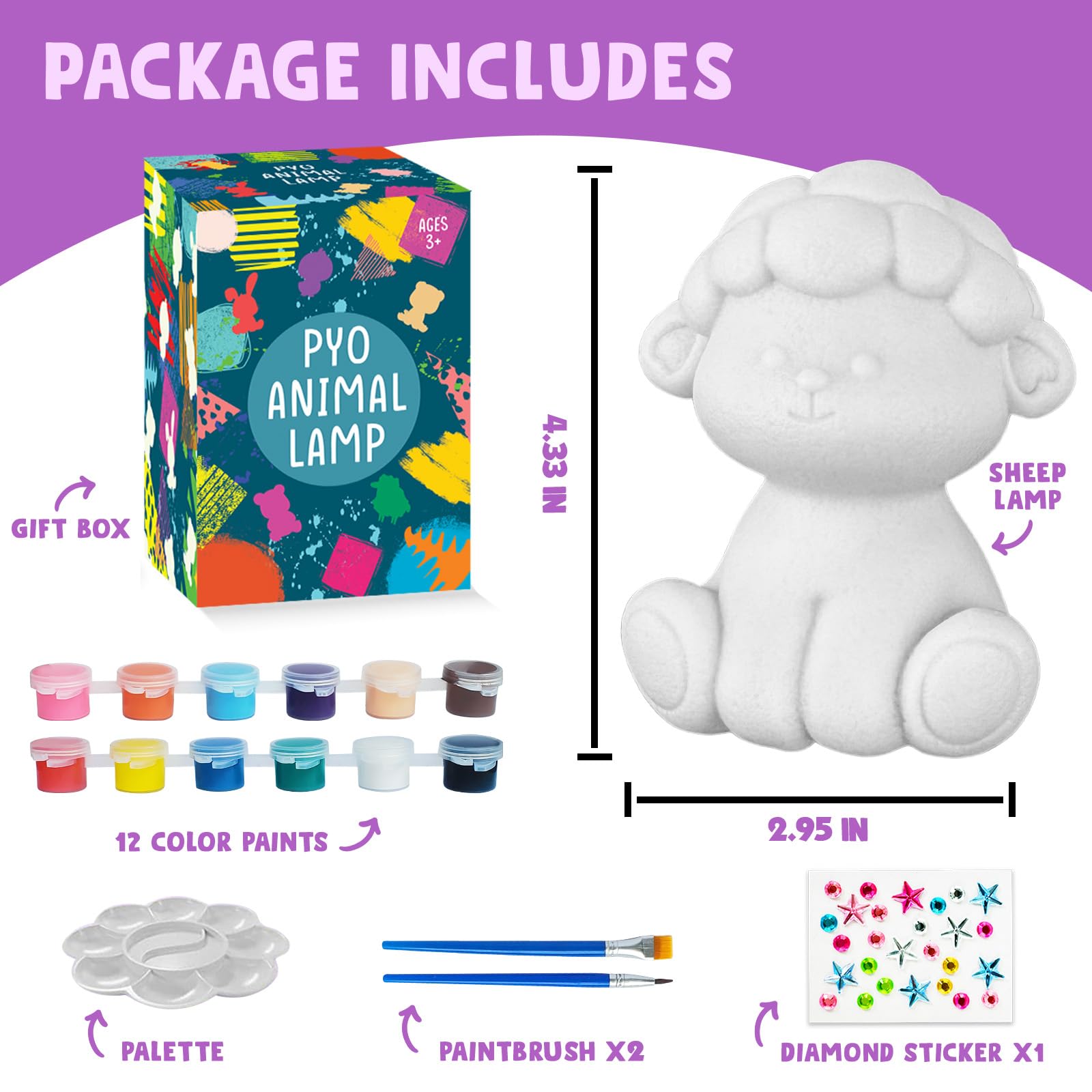 【Complete Craft Kit for Endless Fun】Dive into the world of creativity with our Paint Your Own Sheep Lamp kit! This set includes 1 sheep lamp, 12 paint colors, 2 brushes, a palette and sticker. This kit promises hours of fun and creativity for arts and crafts enthusiasts aged 4-12.