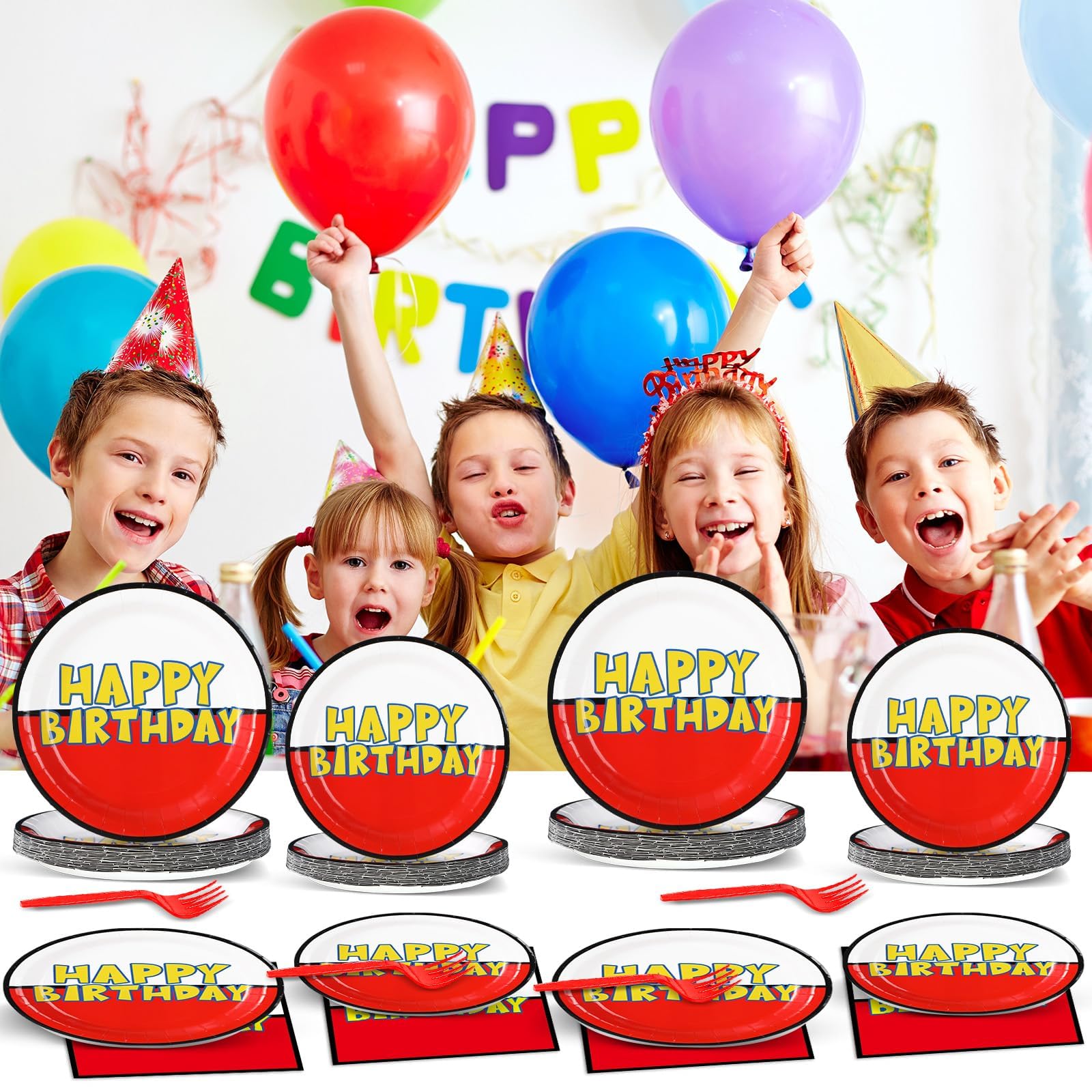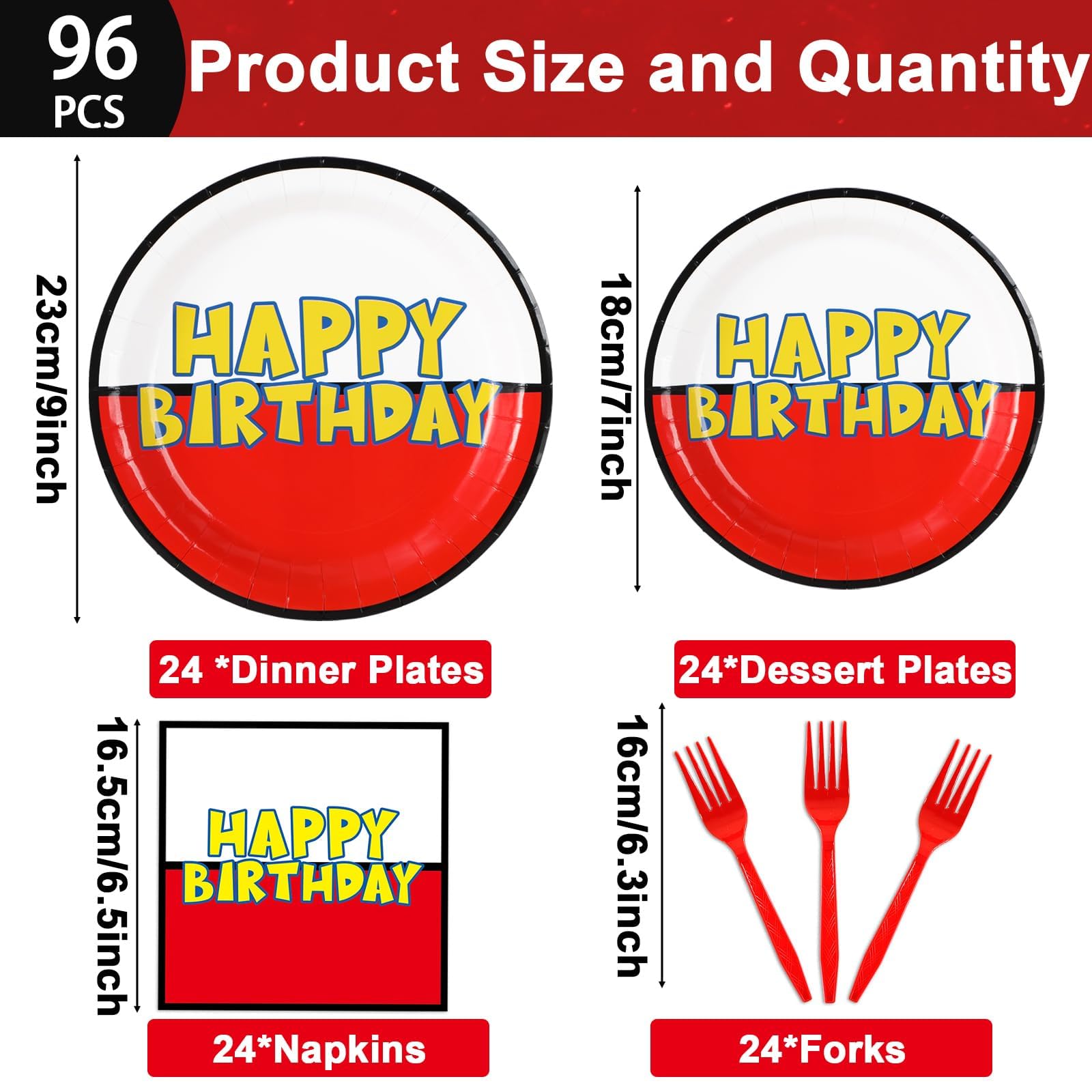 Package includes: You'll get 24 pieces of 9in cartoon ball party paper dinner plates, 24 pieces of 7in cartoon animation party dessert plates, 24 pieces of cartoon animated napkins of 6.5in, and 24 pieces of plastic red forks for each set that can serve 24 guests, creating a visually stunning table decor for your party.