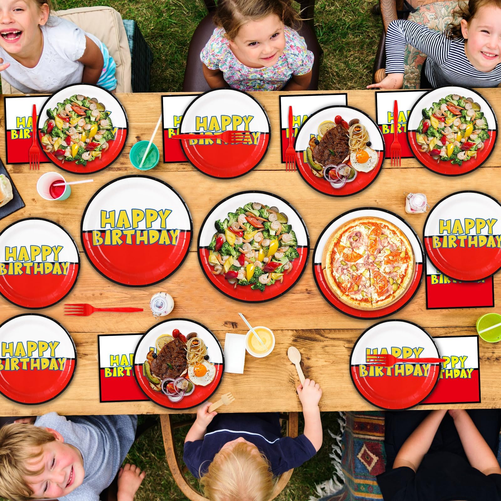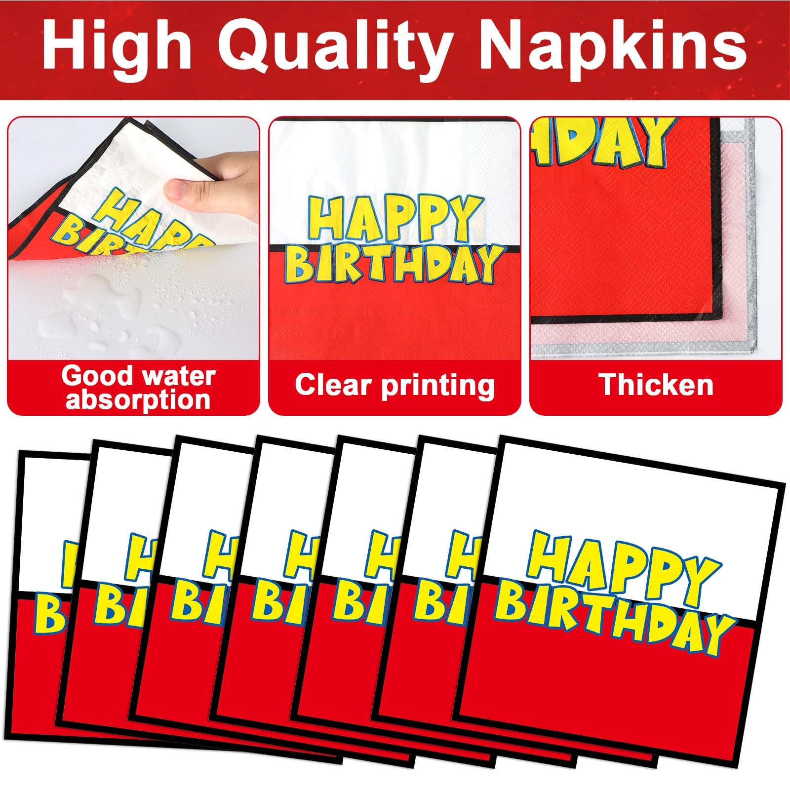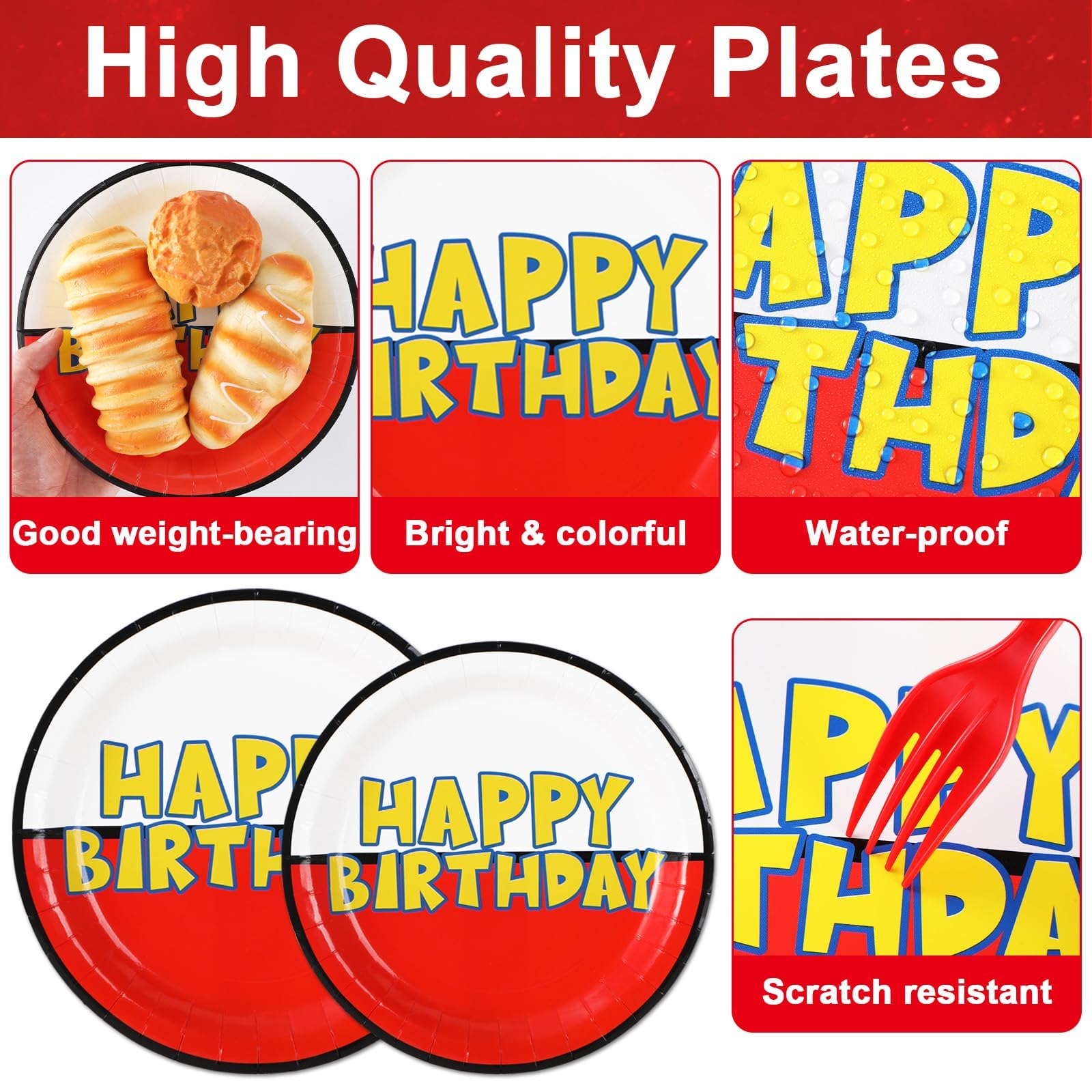 Eye-catching design: The design of this tableware set is inspired by the excitement and energy of animated video games. Each piece features bold, colorful graphics that include iconic symbols and characters from popular animations. The "HAPPY BIRTHDAY" text stands out in a playful font, making each plate and napkin a festive decoration in itself.