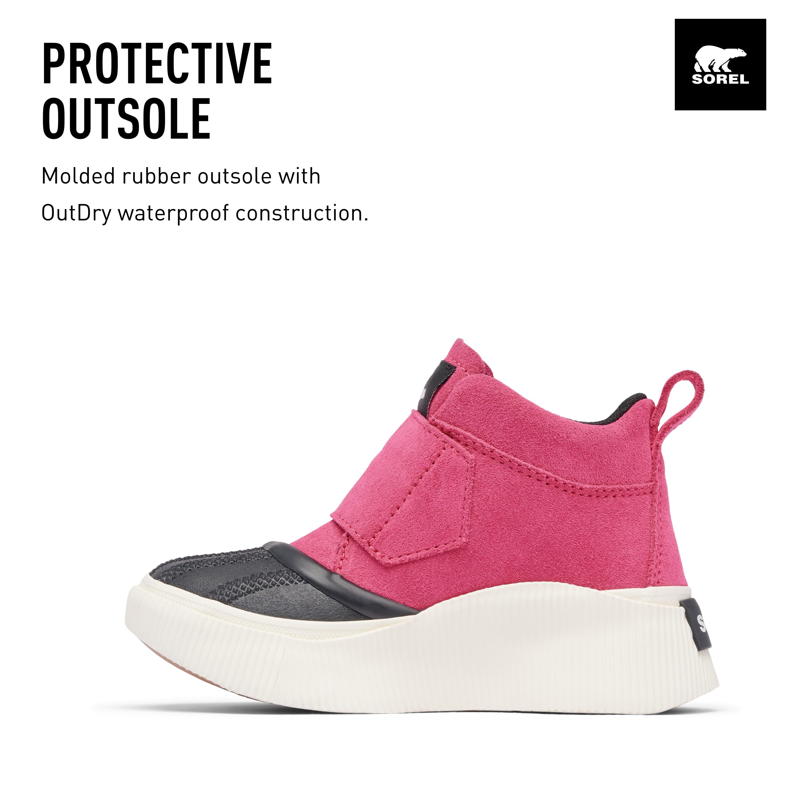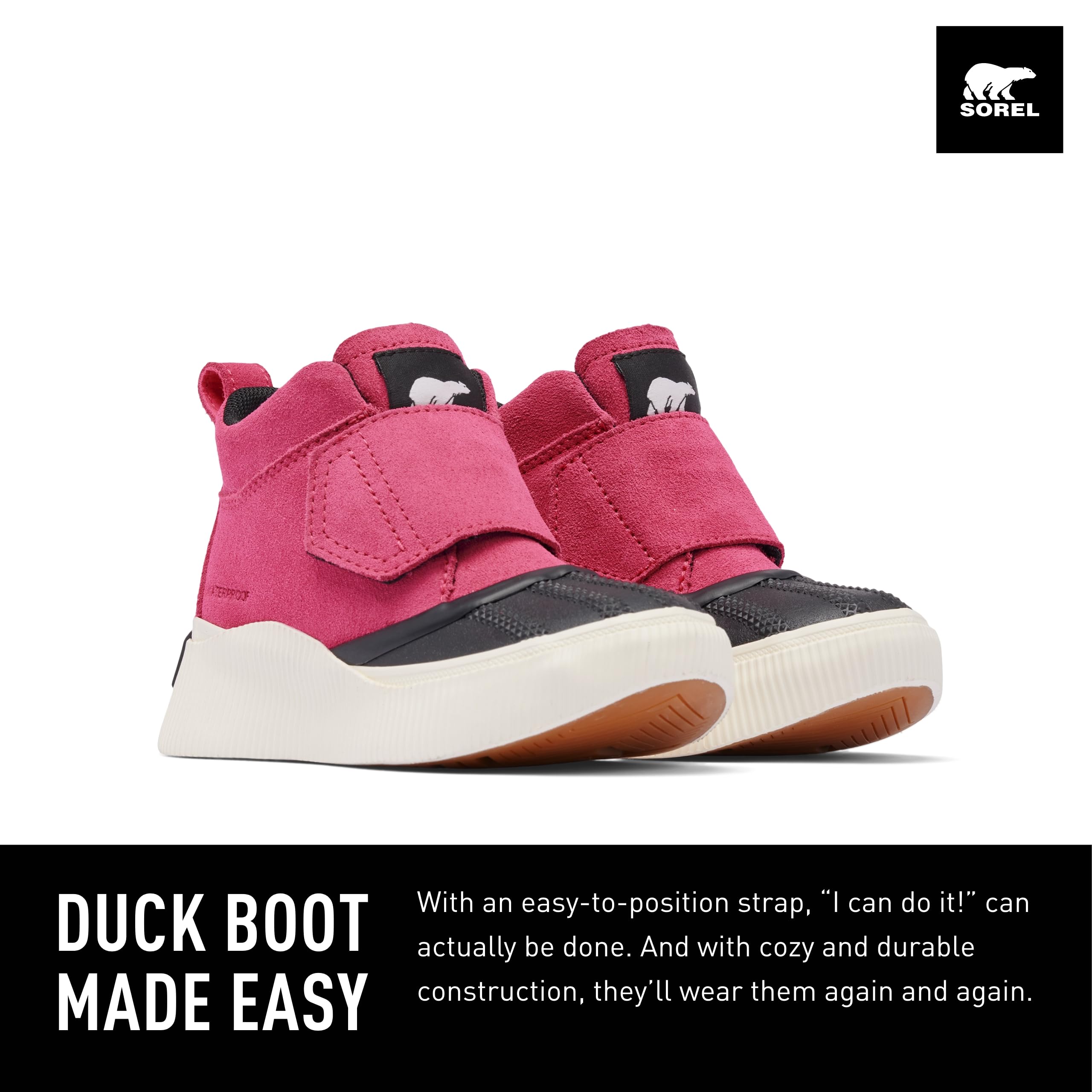 Description DUCK BOOT MADE EASY With an easy-to-position strap, "I can do it!" can actually be done. And with cozy and durable construction, they'll wear them again and again. Other features of the TODDLER OUT N ABOUTâ„¢ IV Strap include: