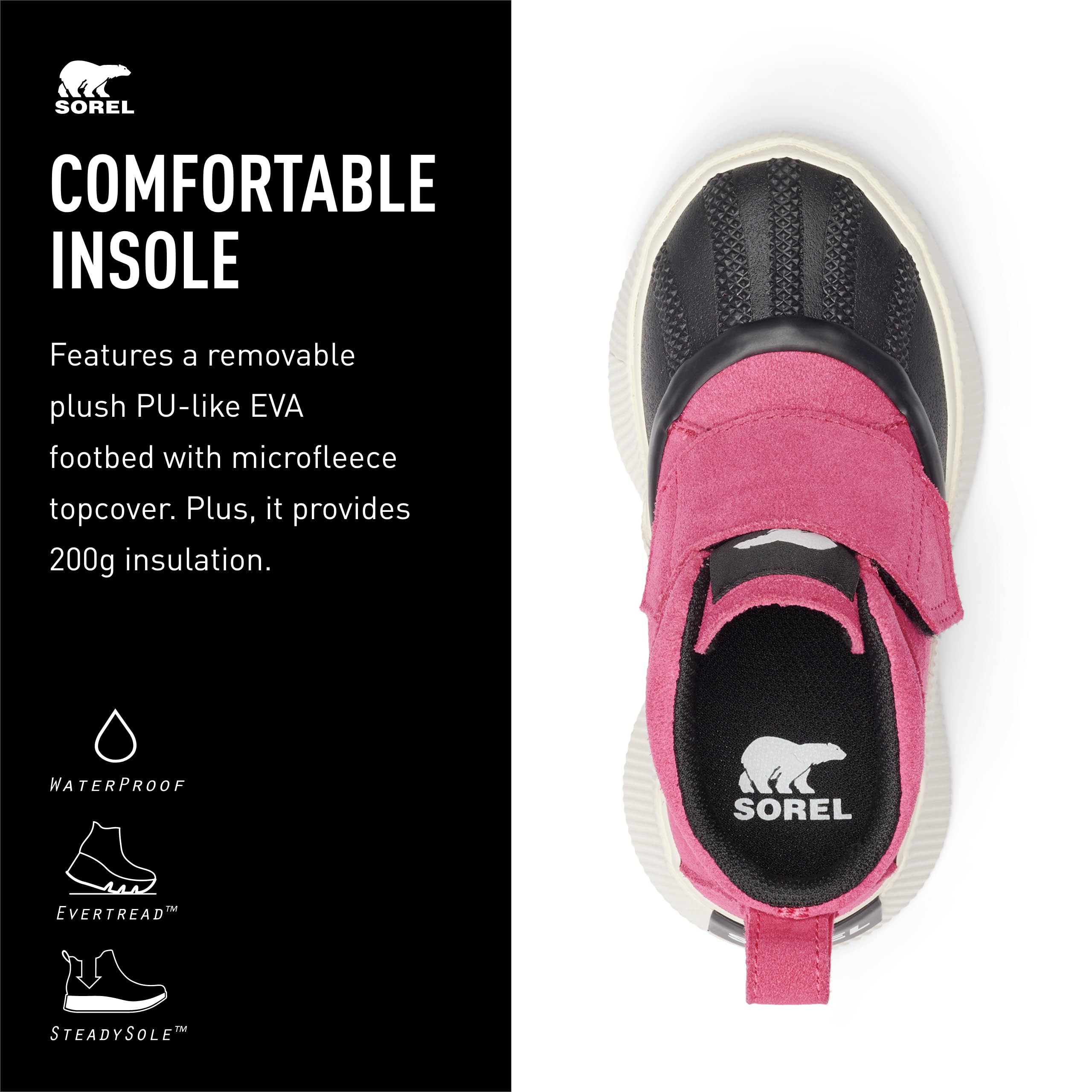 Kids Shoe with Strap: This snow boot with a strap provides stylish but adjustable comfort; the footwear features a molded EVERTREAD rubber outsole
