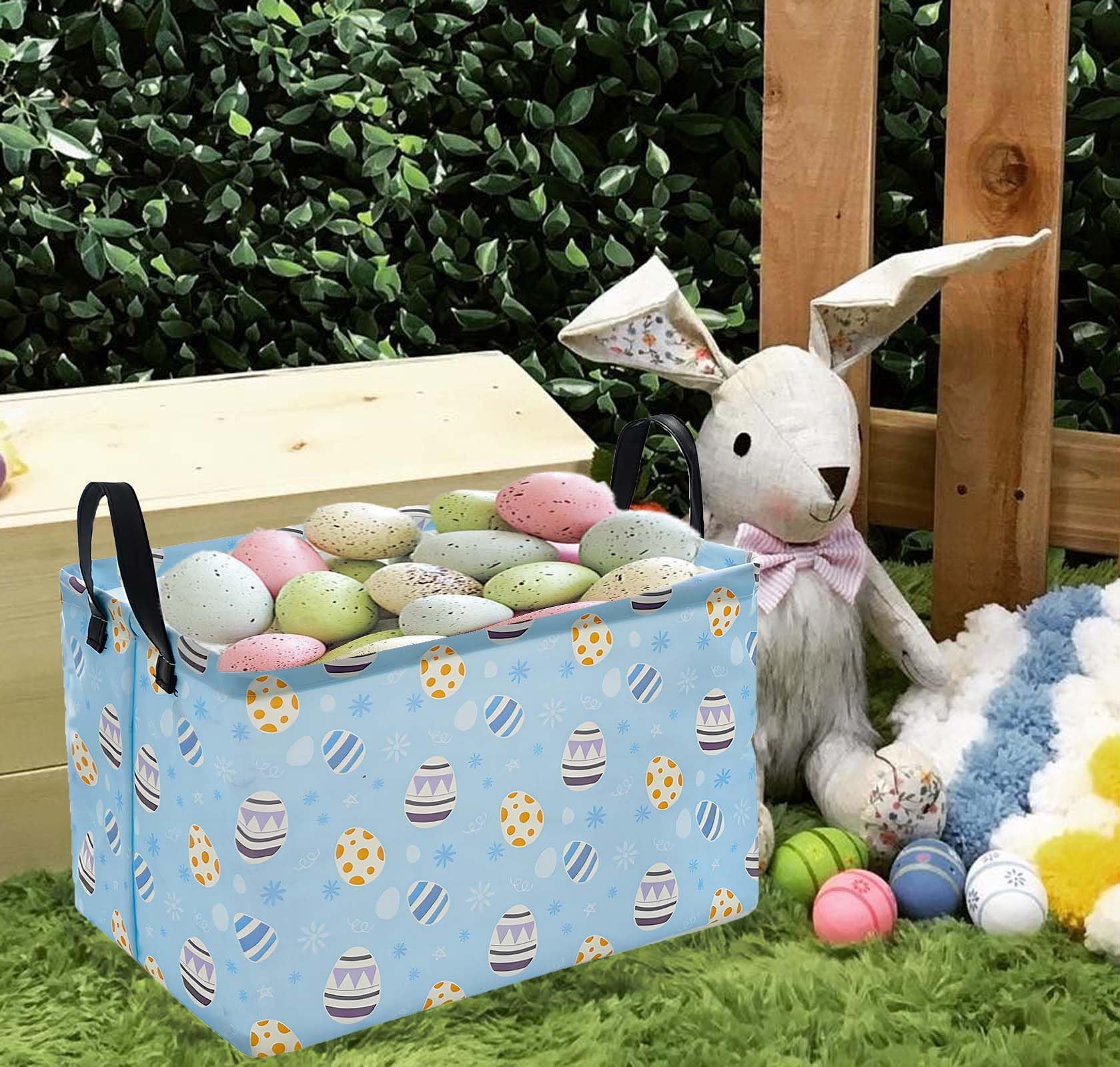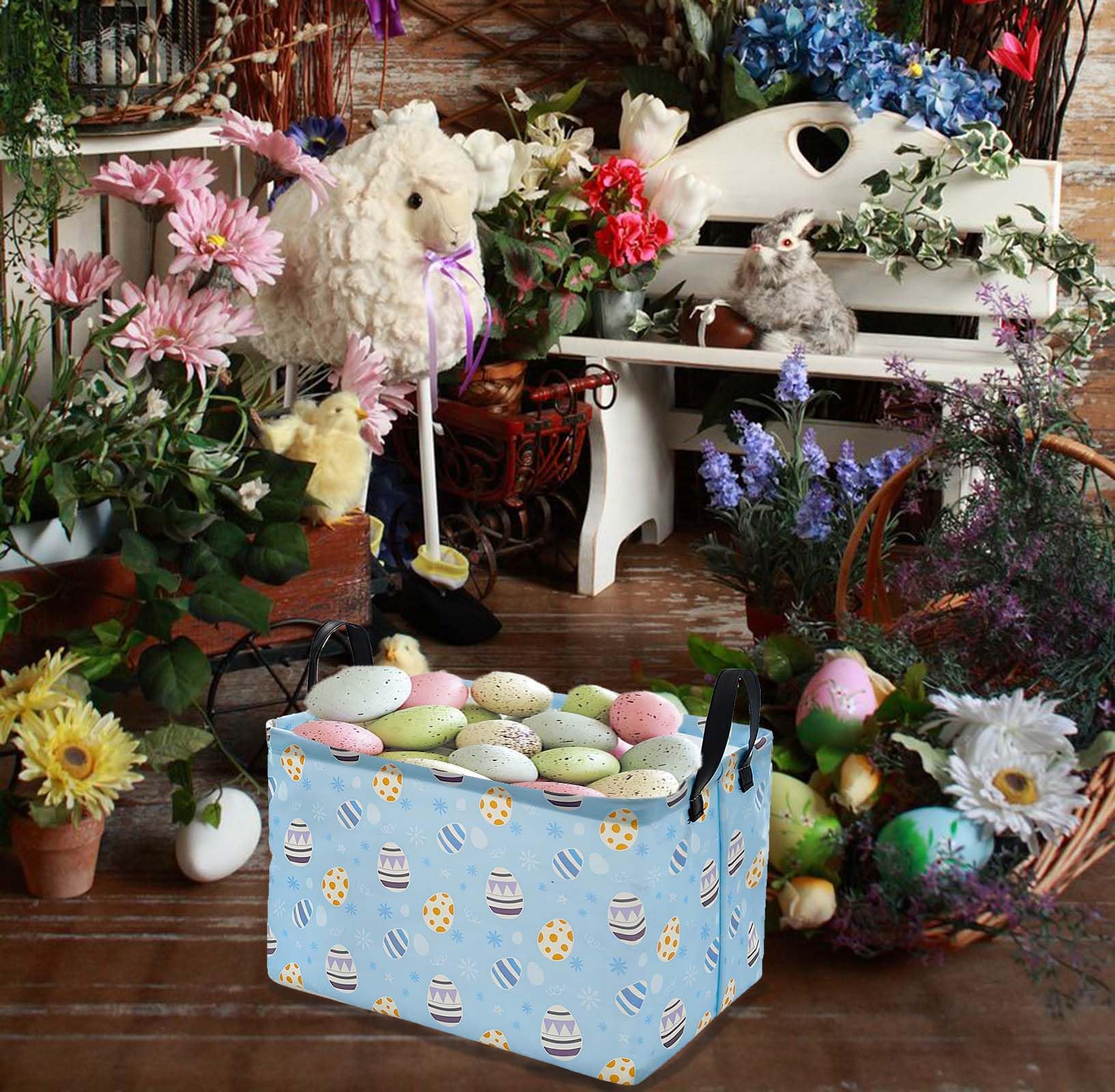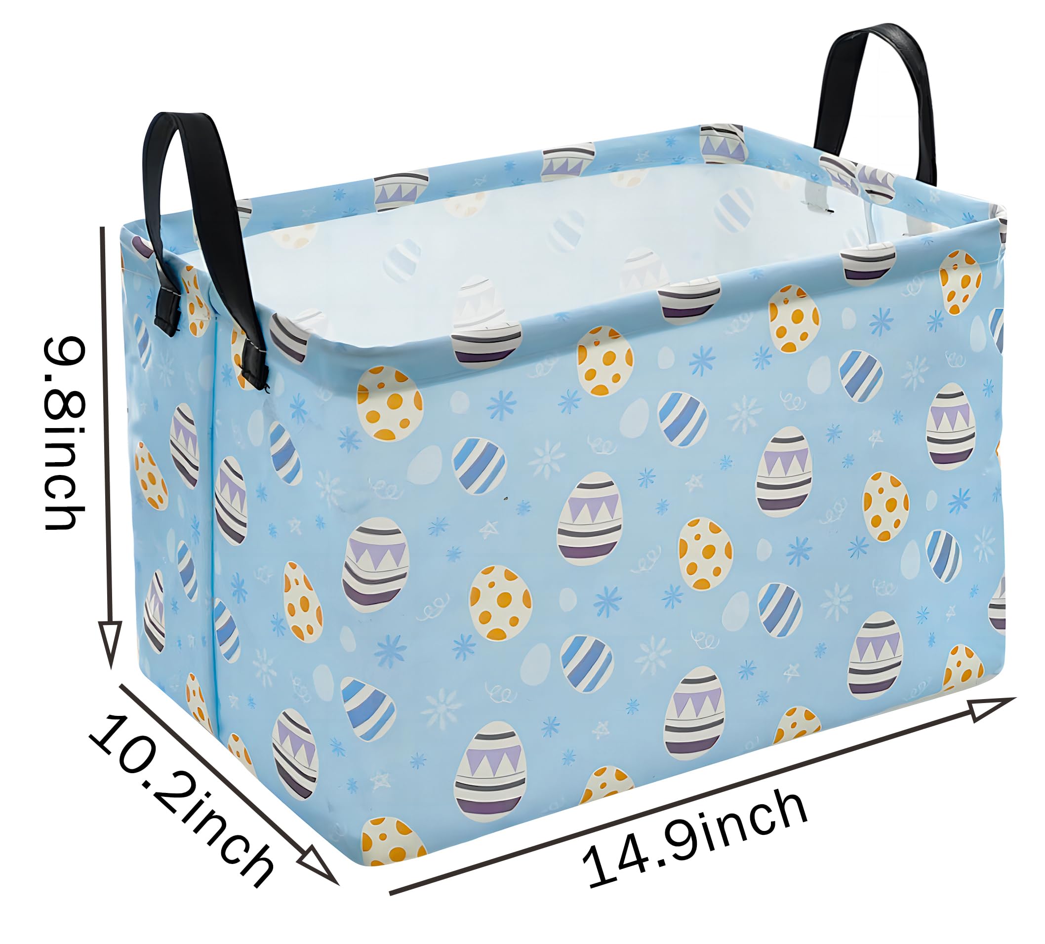 【Perfect Size】:The Easter egg basket is perfect size, measuring 14.9(L)×10.2(W)×9.8(H)inches. Our Bunny Easter Basket provides ample space for a bounty of Easter eggs. 【Multifunctional Use】: This Easter bucket can be used beyond being an ideal Easter egg storage, suitable to store dirty clothes washing, place in the children's room to store toys, books and other household goods, keep the house clean and tidy. Perfect for hamper in a nursery, home, office, closet organizer, bedroom, bathroom, college dorm, etc. 【Premium Material】: Crafted from high-quality cotton material. leather handle + waterproof PE coating lining 【Lightweight Collapsible】:Lightweight for your kids to take with them on their easter egg hunts! portable to carry on. Folds up easily for storage. 【NOTE】: If you want it to be as perfect as the picture, you can use an iron or hanging ironing machine to eliminate creases