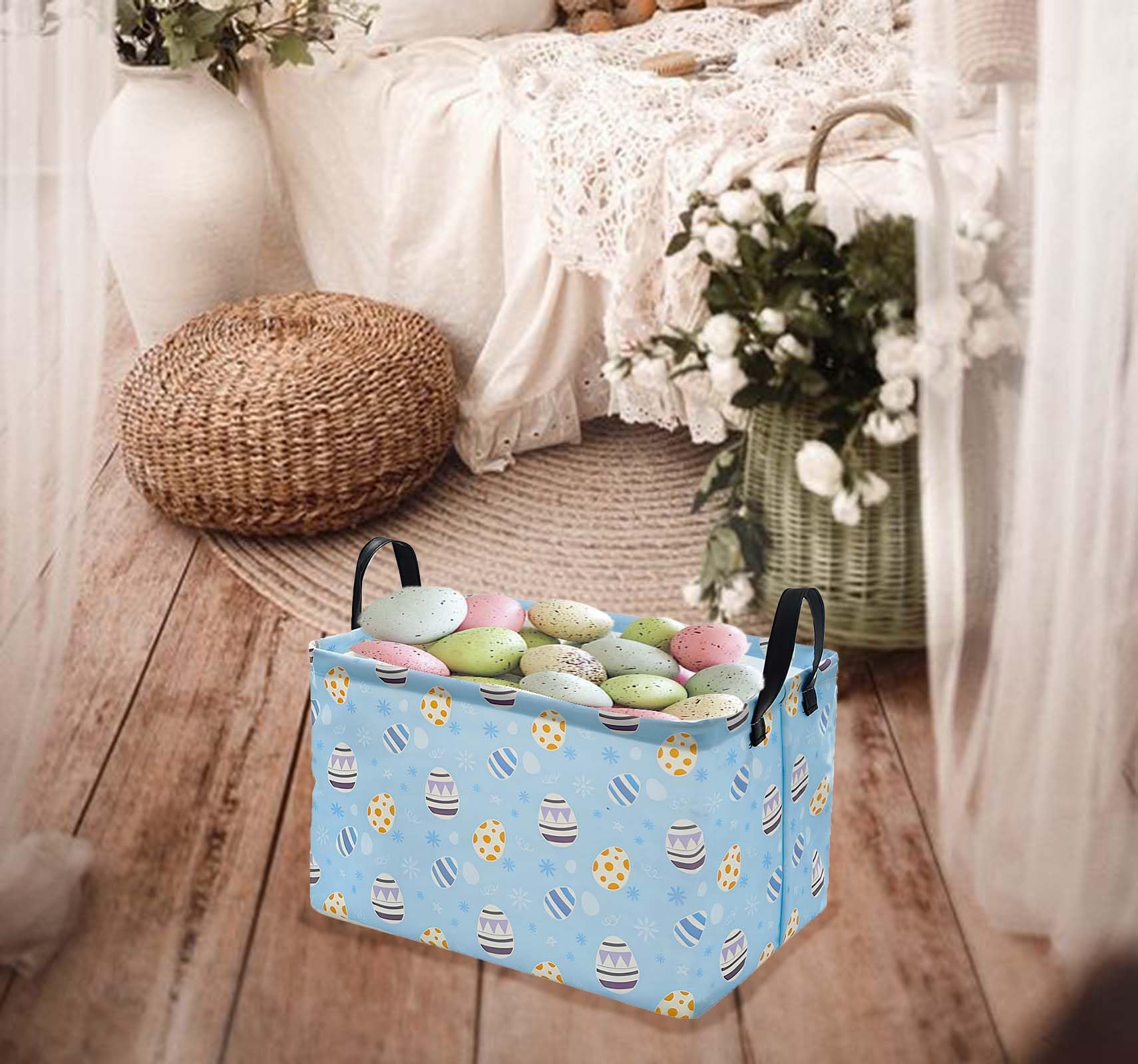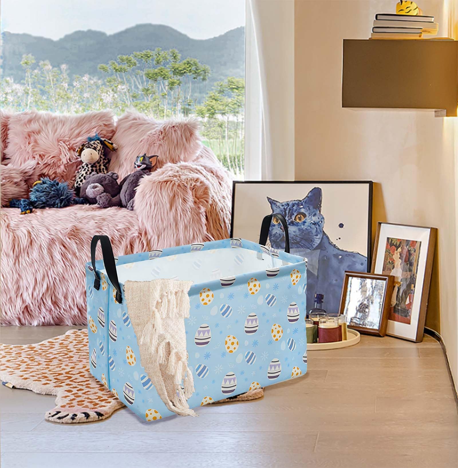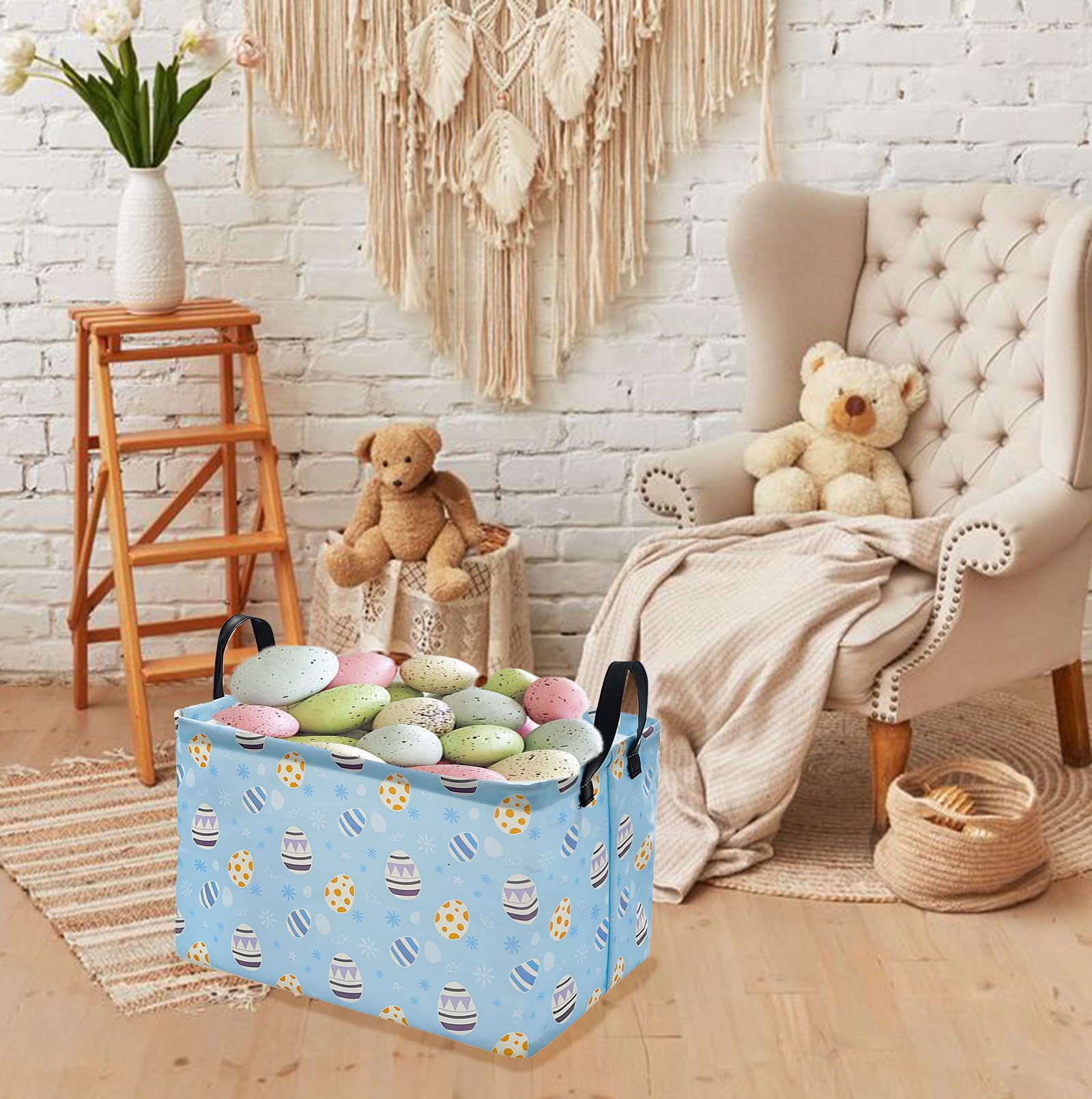 【Perfect Size】:The Easter egg basket is perfect size, measuring 14.9(L)×10.2(W)×9.8(H)inches. Our Bunny Easter Basket provides ample space for a bounty of Easter eggs. 【Multifunctional Use】: This Easter bucket can be used beyond being an ideal Easter egg storage, suitable to store dirty clothes washing, place in the children's room to store toys, books and other household goods, keep the house clean and tidy. Perfect for hamper in a nursery, home, office, closet organizer, bedroom, bathroom, college dorm, etc. 【Premium Material】: Crafted from high-quality cotton material. leather handle + waterproof PE coating lining 【Lightweight Collapsible】:Lightweight for your kids to take with them on their easter egg hunts! portable to carry on. Folds up easily for storage. 【NOTE】: If you want it to be as perfect as the picture, you can use an iron or hanging ironing machine to eliminate creases