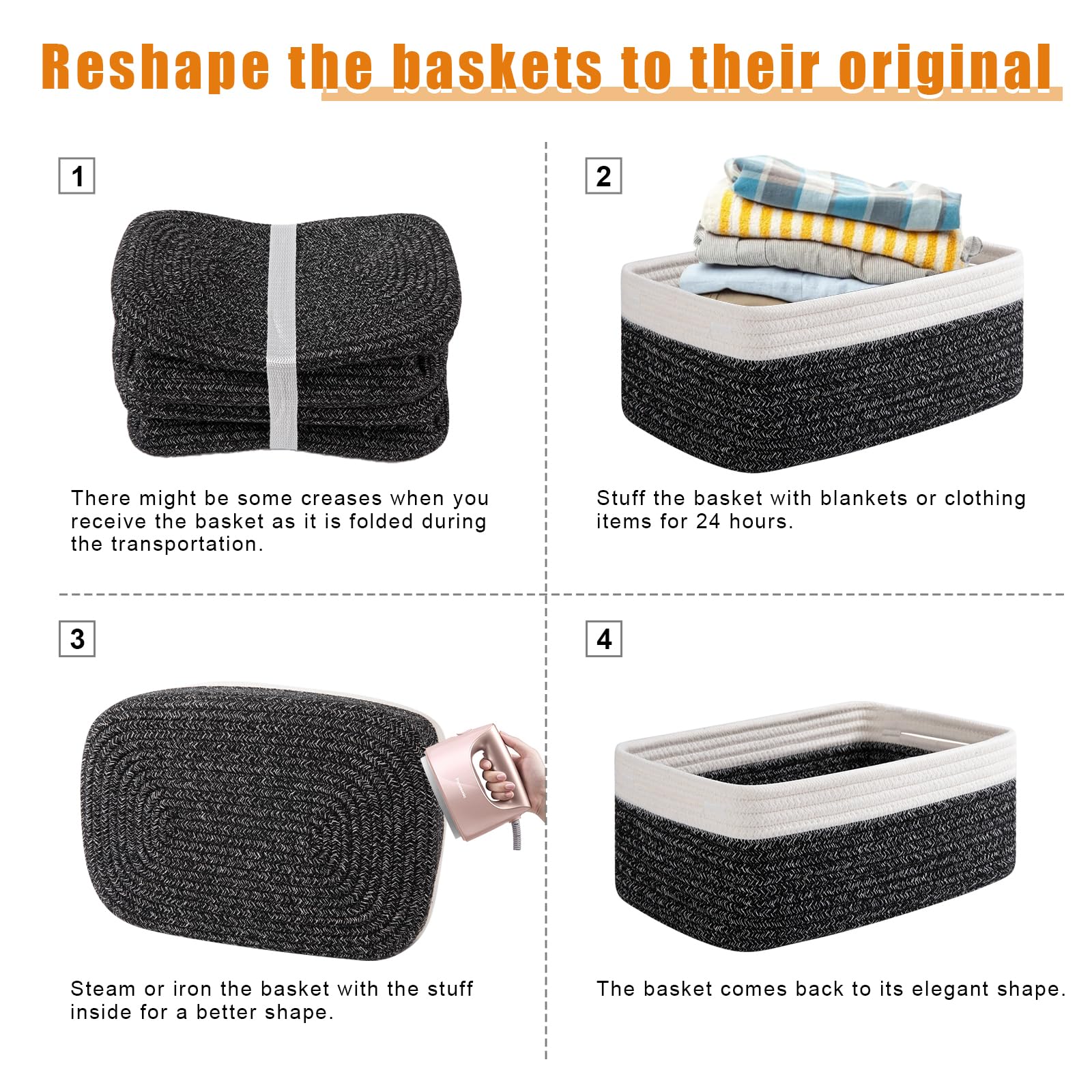 Note: OIAHOMY organizer baskets are folded for shipping. It will turn back to its elegant shape quickly by filling it with towels or blankets, and ironing is a great idea to regain the creases. Also, you can fold it into a flat shape for easy storage when not in use