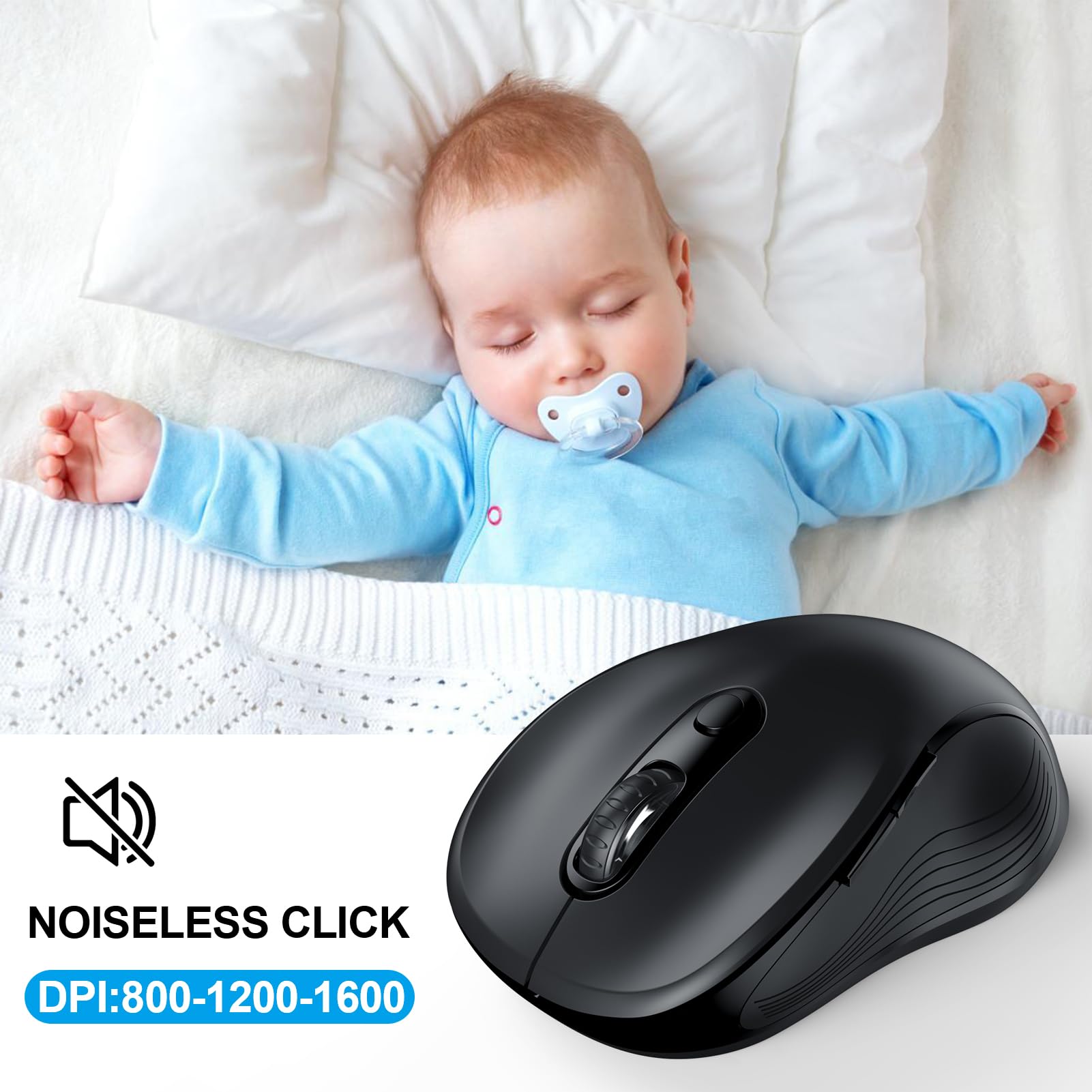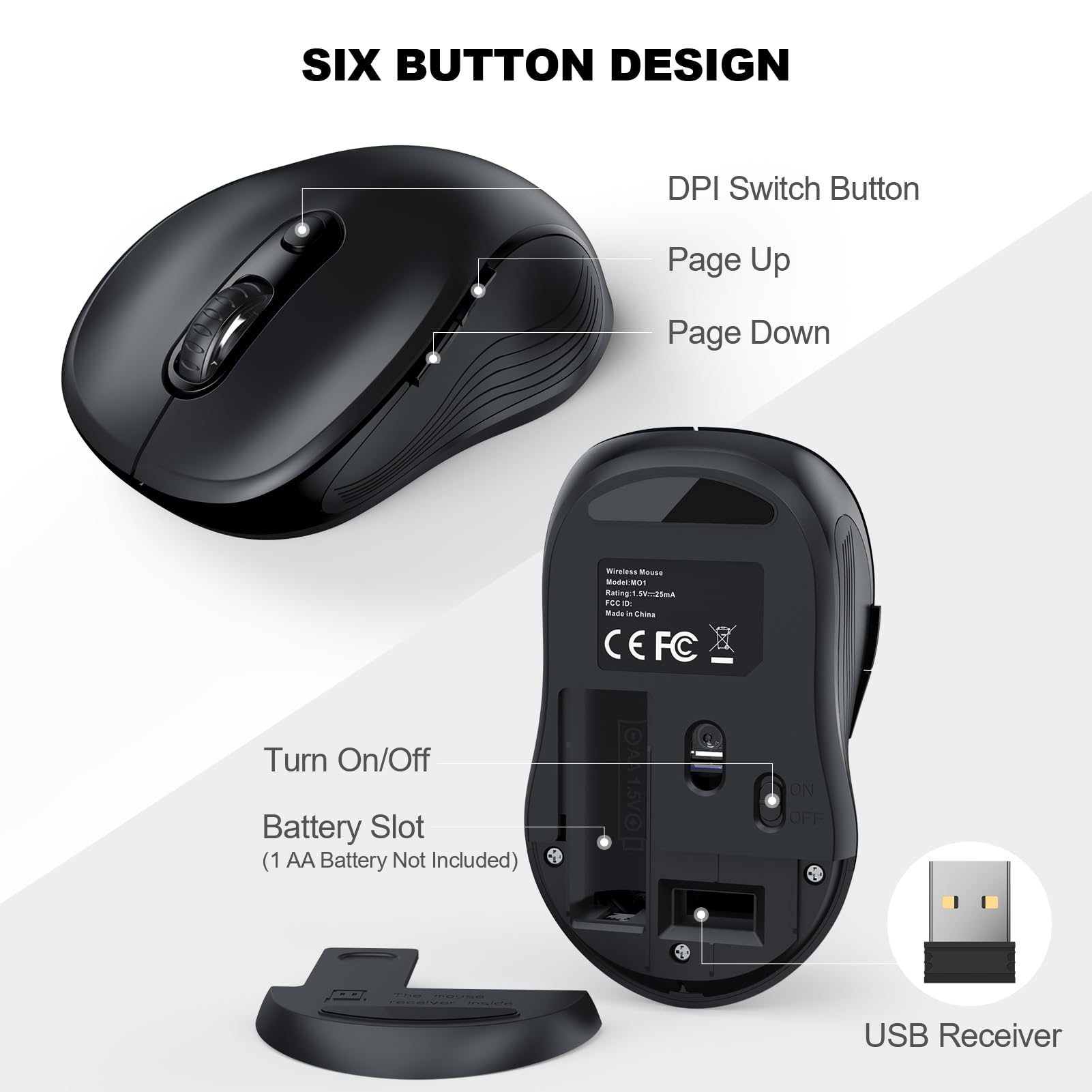 ▶[3 DPI LEVELS & 6 BUTTONS] 3 Adjustable DPI Settings, 800, 1200 and 1600. This computer mouse gives precision tracking on just about any surface, with a DPI button helping to change the sensitivity on the fly. Extra 2 Side Buttons ideal for both work and gaming. Plug and play directly with A RECEIVER STORED IN THE BATTERY COMPARTMENT, no any driver needed!