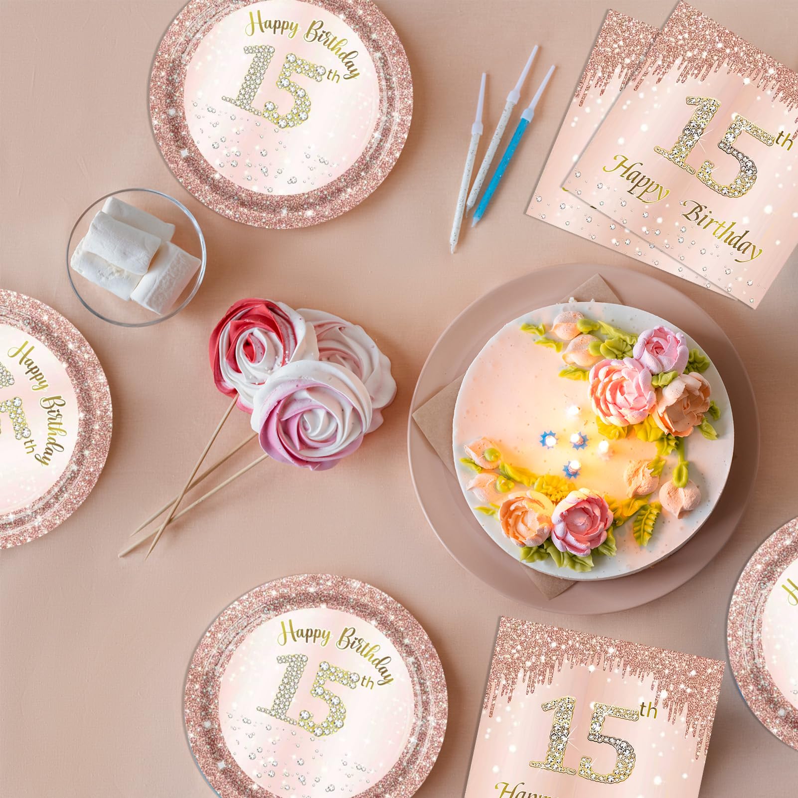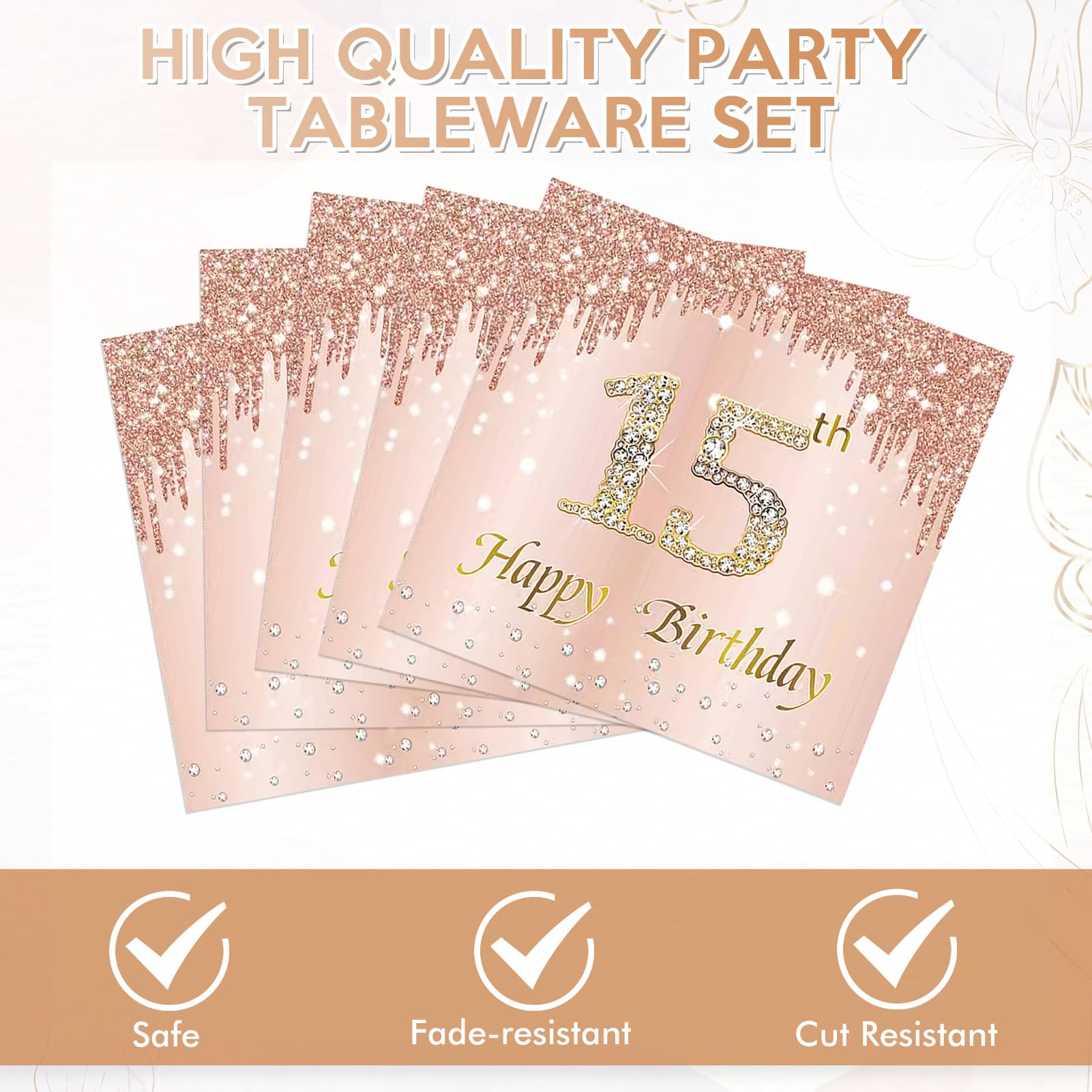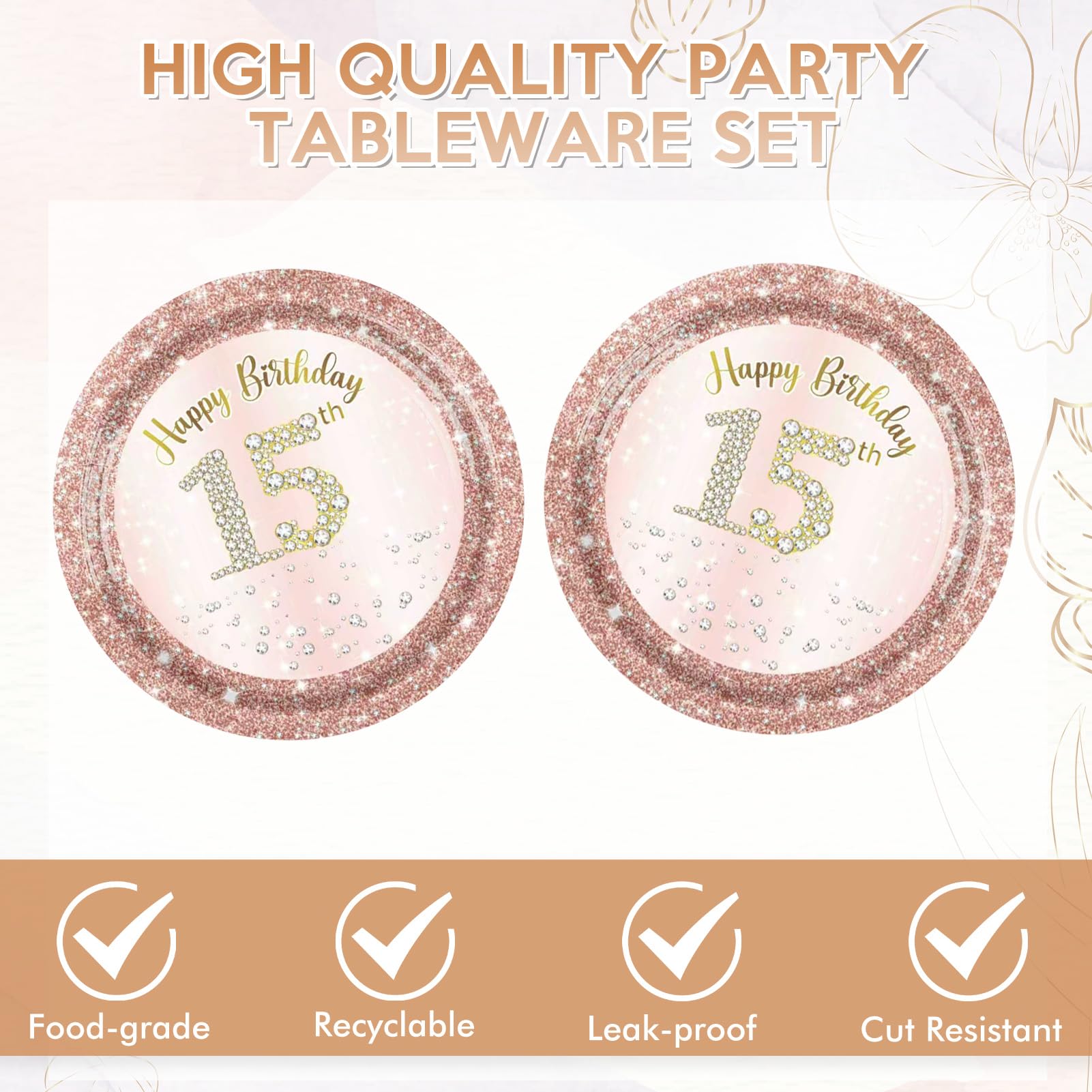 Premium Material: All of our pink rose gold birthday plates and napkins are made of quality paper, safe, no smell, heat-resistant, and durable. The stylish pattern and color are well-printed and fade-resistant to provide you with a party that is full of a happy 15th birthday atmosphere.