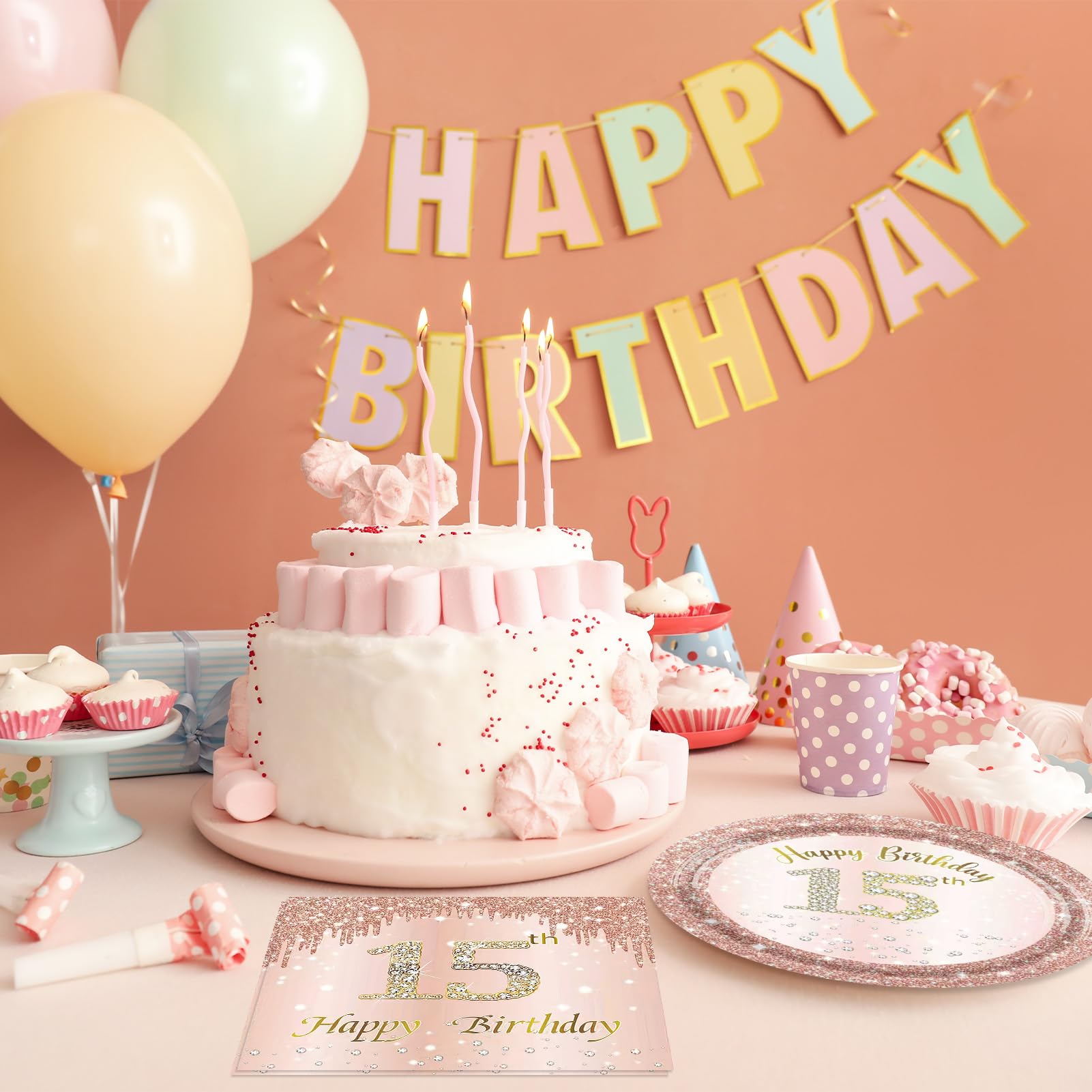 Exquisite Design: Featuring iconic birthday elements like a crown, gift box, star, and cake, with sweet rose pink background, eye-catching "Happy 15th Birthday" with sparkling stars and rose gold pink diamond party elements design, very beautiful and innovative design, can add beautiful decoration to your birthday party.